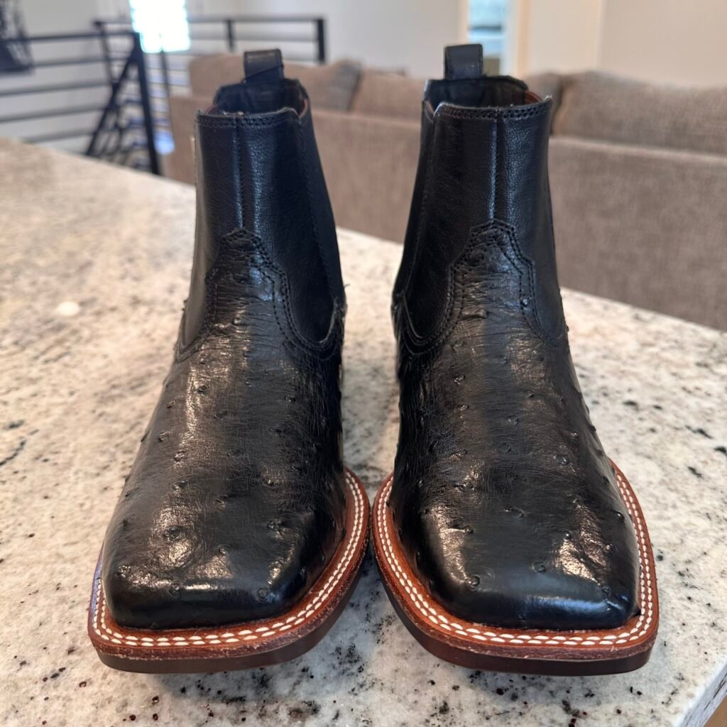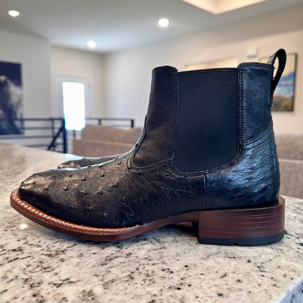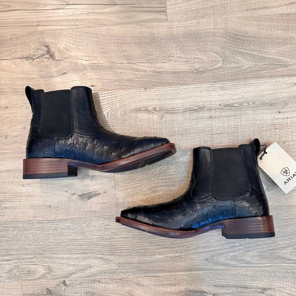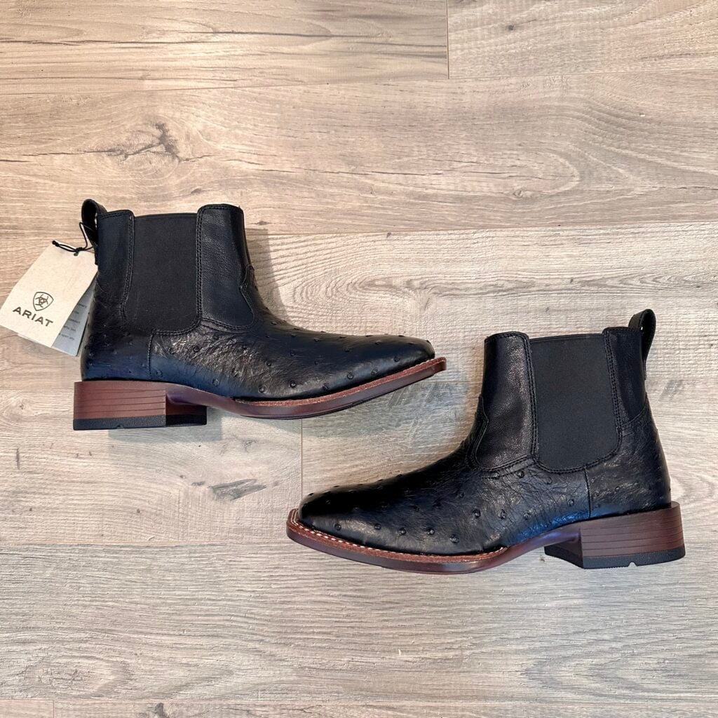Type: These are men’s size 8.5 D Ariat Booker Ultra Exotic Full Quill Ostrich Chelsea Boots in colorway Jet Black. Ariat style 10053559. These boots have full quill ostrich leather on the foot. Square toe design with elastic gore panels on the side for easier on/off. Ariat calls this outsole a “Bantamweight sole” which they say is “30% lighter than traditional rubber”. These boots are in new condition with original tag. Boots in mint condition with no flaws.