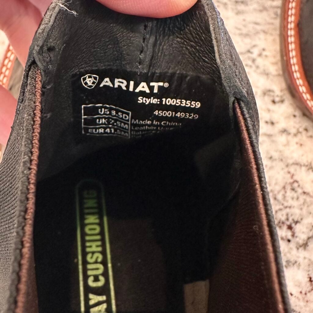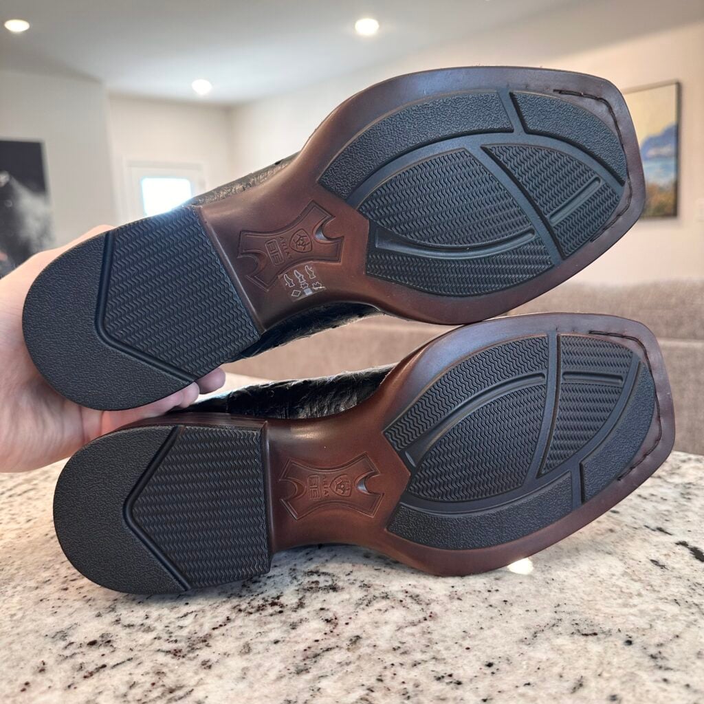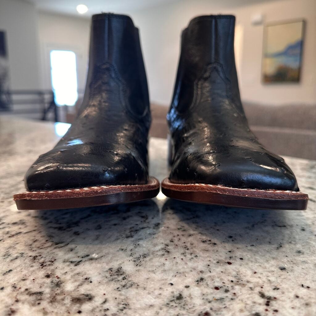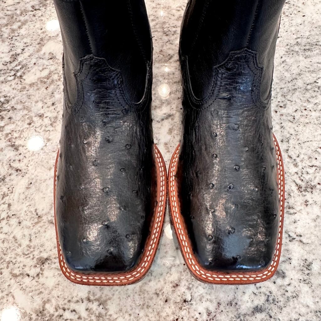 Type: These are men’s size 8.5 D Ariat Booker Ultra Exotic Full Quill Ostrich Chelsea Boots in colorway Jet Black. Ariat style 10053559. These boots have full quill ostrich leather on the foot. Square toe design with elastic gore panels on the side for easier on/off. Ariat calls this outsole a “Bantamweight sole” which they say is “30% lighter than traditional rubber”. These boots are in new condition with original tag. Boots in mint condition with no flaws.