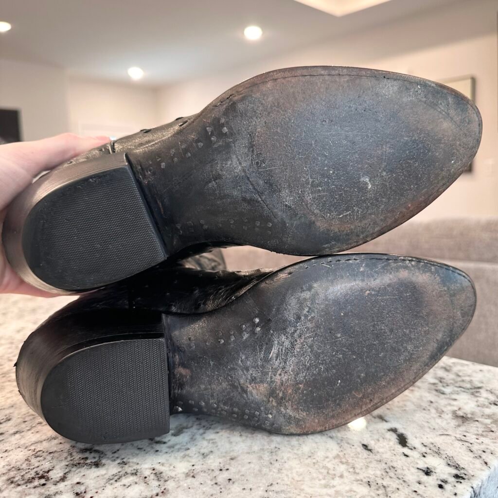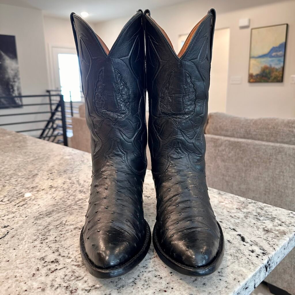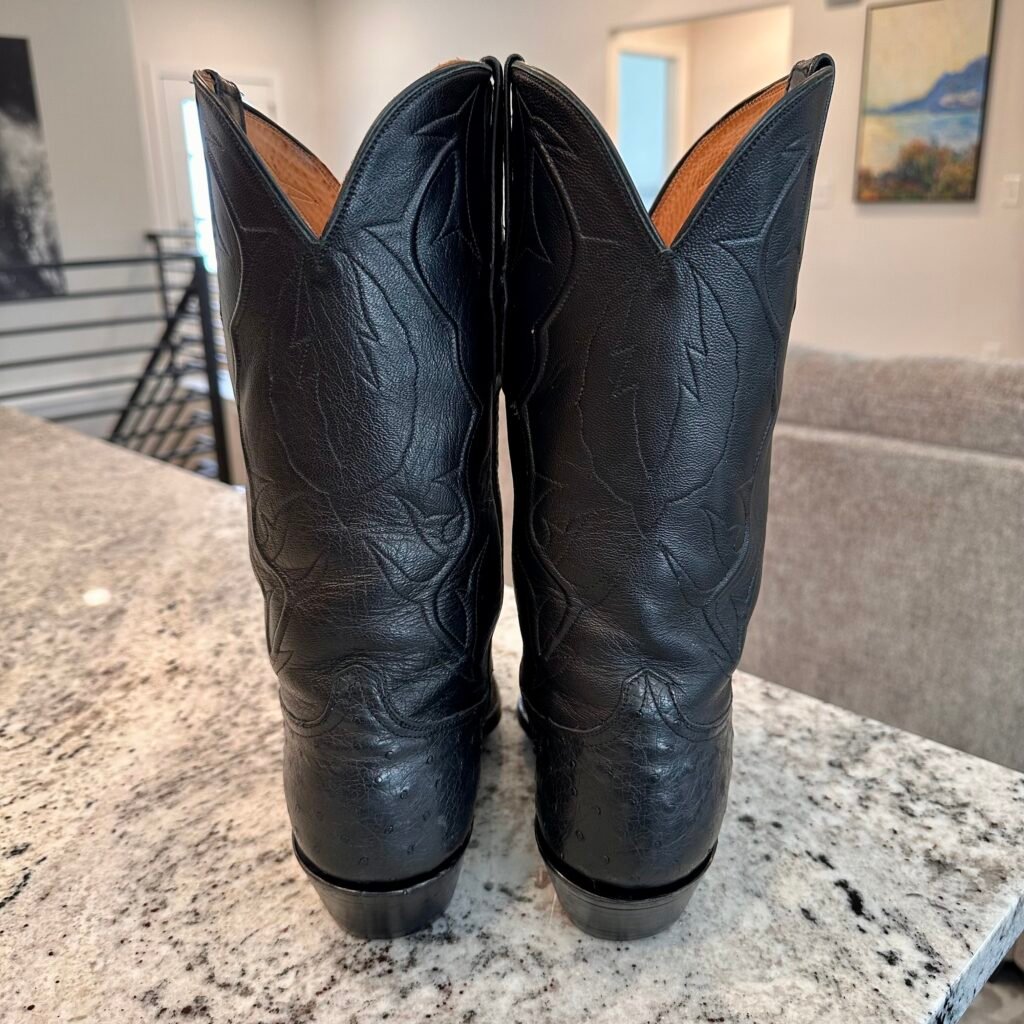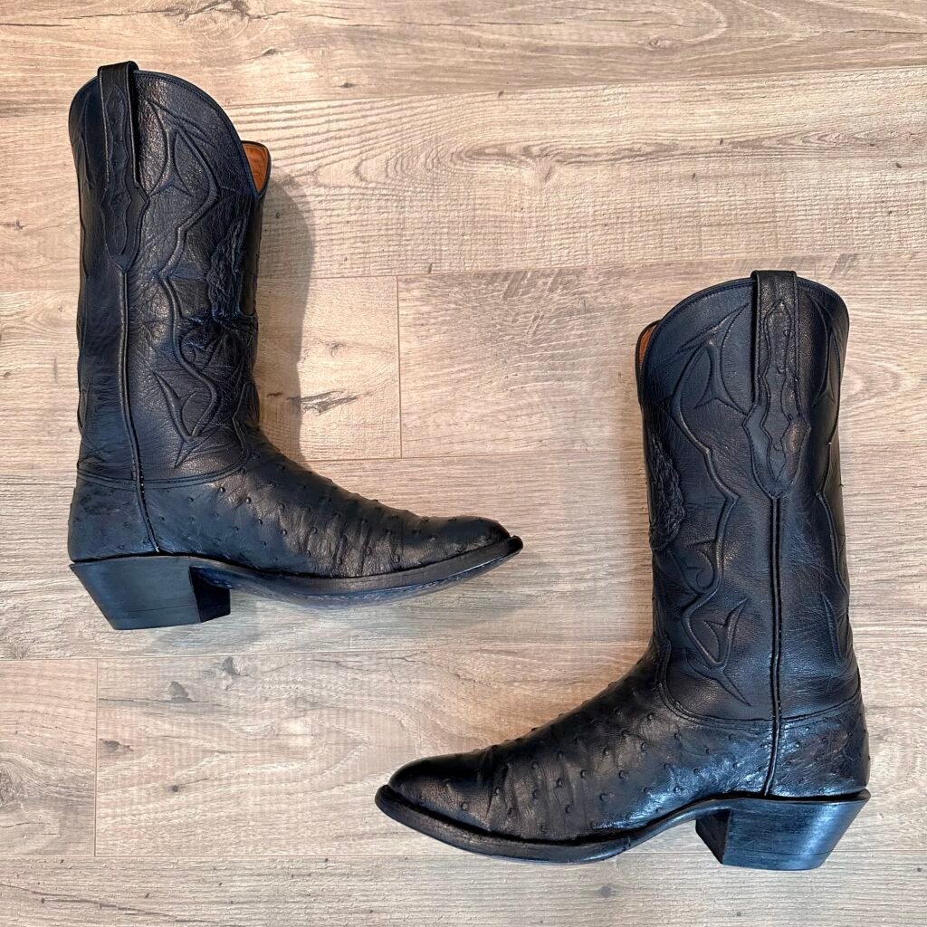 Type: These are men’s size 9.5 D Black Jack Ostrich Boots in color black. Black Jack Boots style 210 (BK 210-24). These boots have a full quill ostrich leather foot. There are also ostrich accents on the shaft pull tabs and there is an ostrich inlay on the front of the shaft. Made in USA. The ostrich leather is in good shape with no rips or tears.