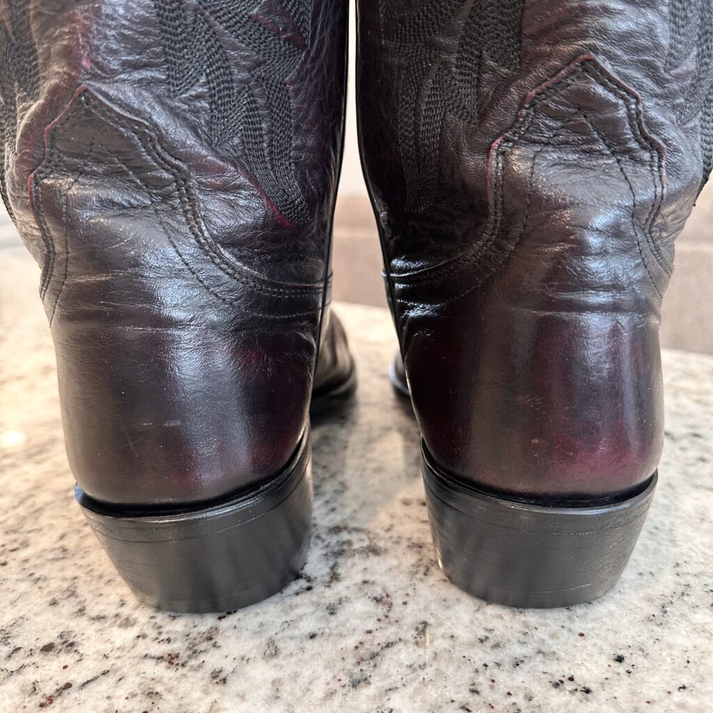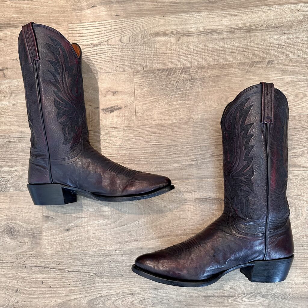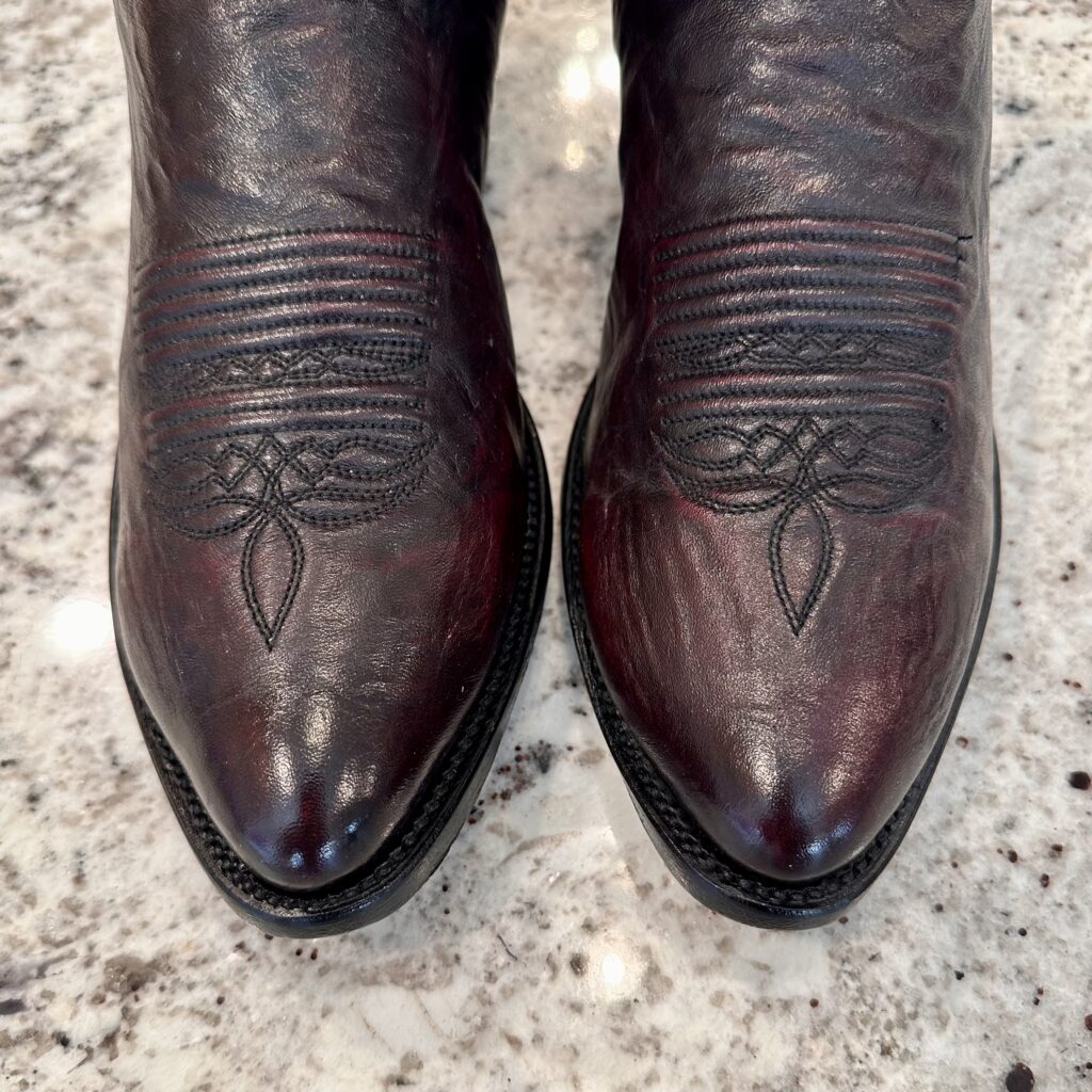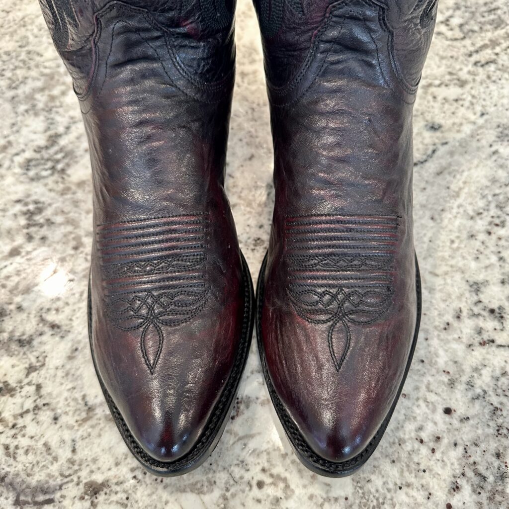Type: These are men’s size 10 D Lucchese 1883 Boots in color black cherry. Lucchese style M1021.J4. These boots are made with Lonestar Calfskin leather. Leather outsoles with decorative embroidery stitching on the shaft. Toe bug stitching on vamp. Leather lined. The calfskin leather is in good condition but does show creasing and wrinkling from use in the toe box and vamp area.