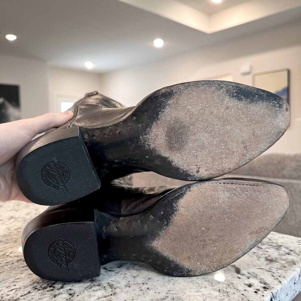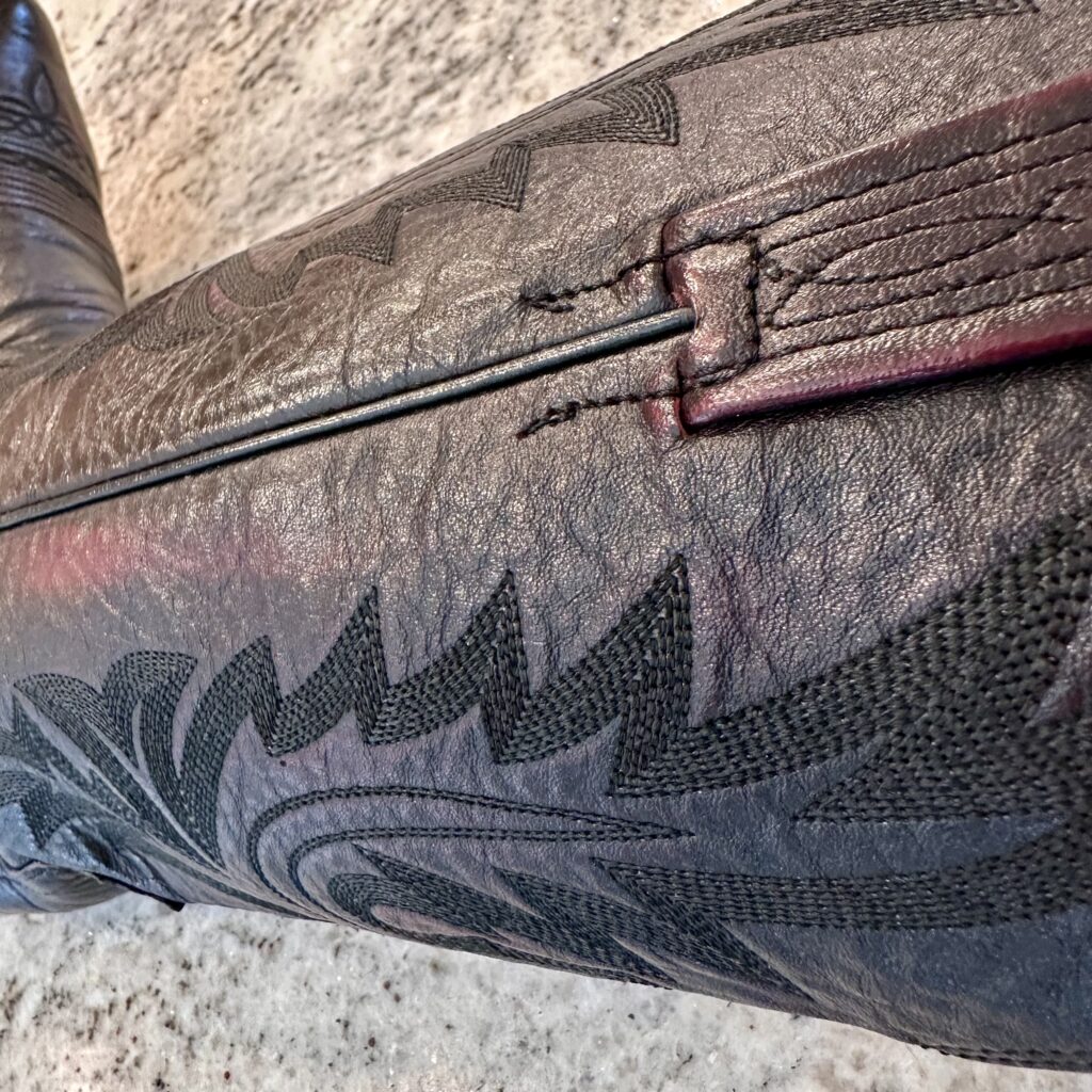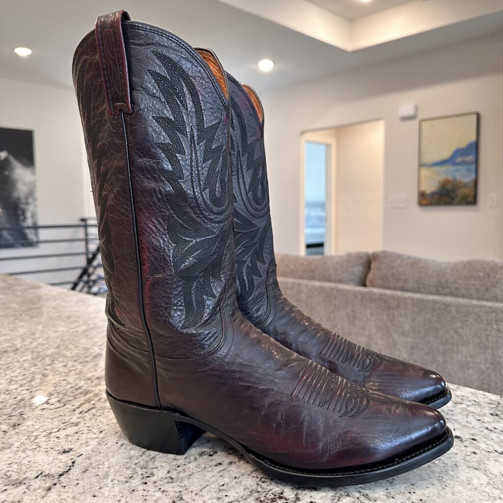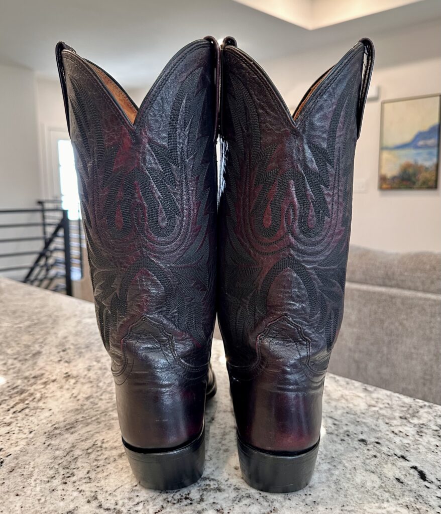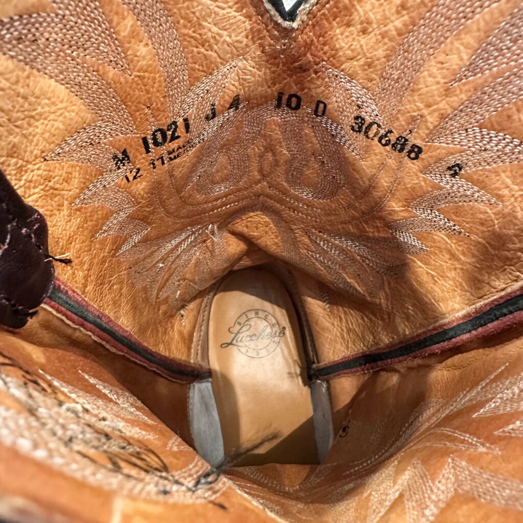 Type: These are men’s size 10 D Lucchese 1883 Boots in color black cherry. Lucchese style M1021.J4. These boots are made with Lonestar Calfskin leather. Leather outsoles with decorative embroidery stitching on the shaft. Toe bug stitching on vamp. Leather lined. The calfskin leather is in good condition but does show creasing and wrinkling from use in the toe box and vamp area.
