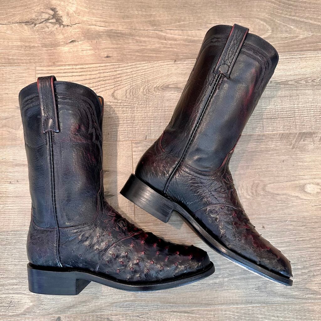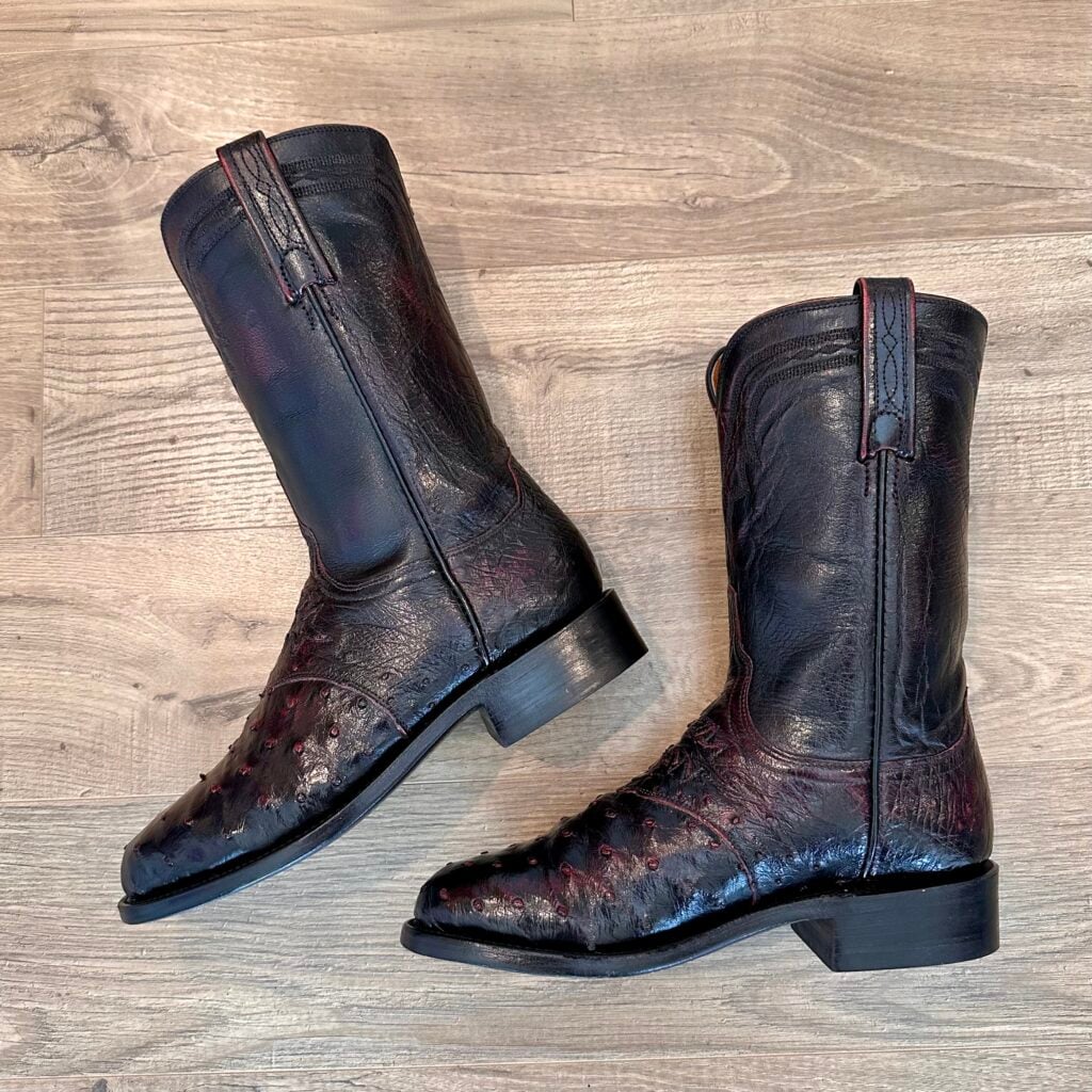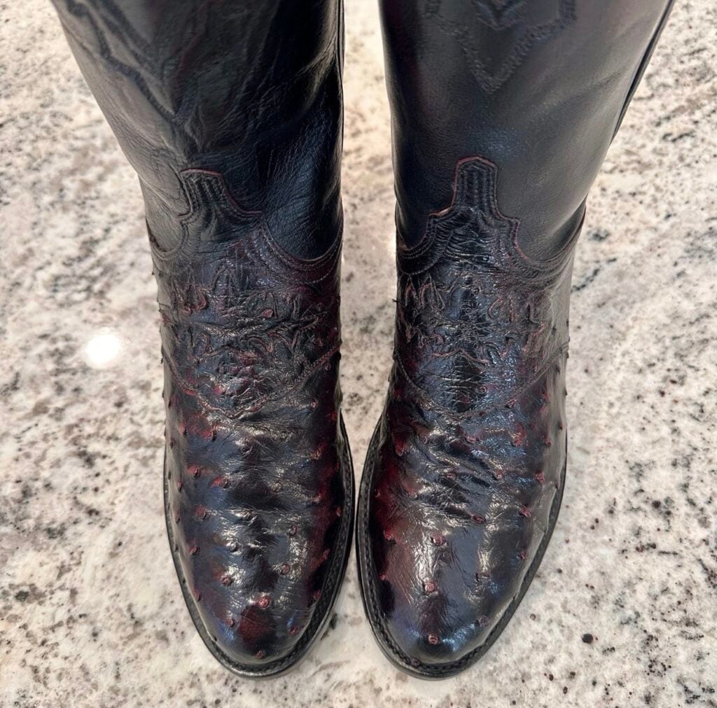 Type: These are women’s size 7 B Lucchese 1883 Ostrich Boots in color black cherry. These boots have a full quill ostrich leather toe and vamp area. Decorative cutout accent on vamp. Smooth ostrich leather heel (counter). Goat leather shaft. Leather outsoles with rubber heel caps. Accent stitching near the shaft collar. Lucchese style N7281.C2. These boots have a Lucchese C toe with a 2 heel. The C toe is a round toe that Lucchese describes as “a slightly less rounded u-shape”, and the 2 heel is a low-height straight-back heel (similar to a roper heel). These boots are in good pre-owned condition. The ostrich leather is in good condition with no rips or tears.