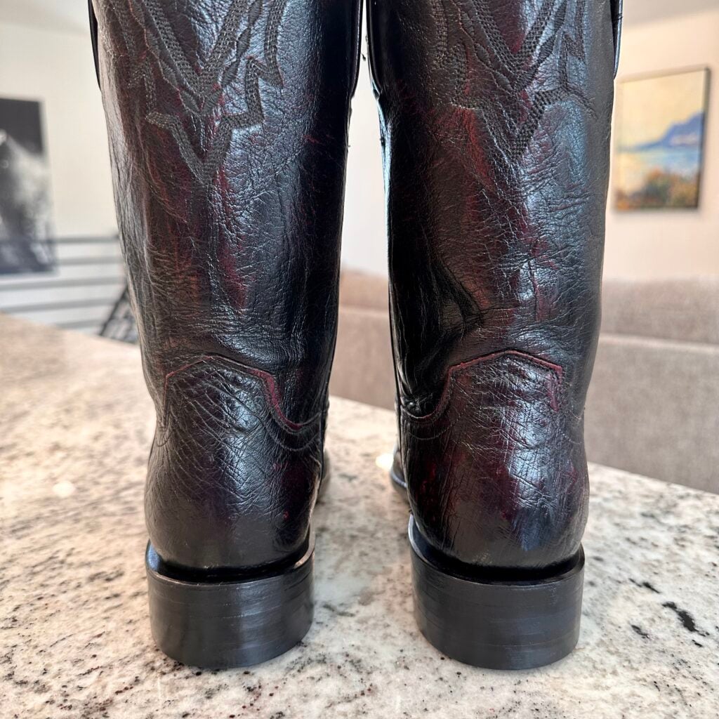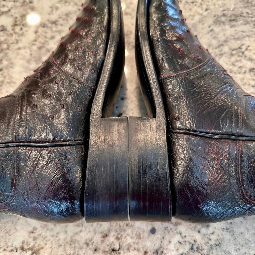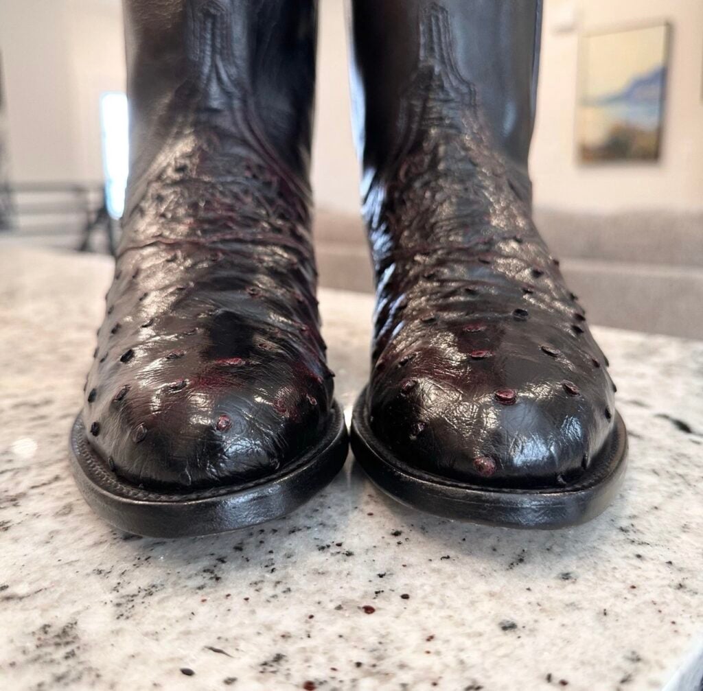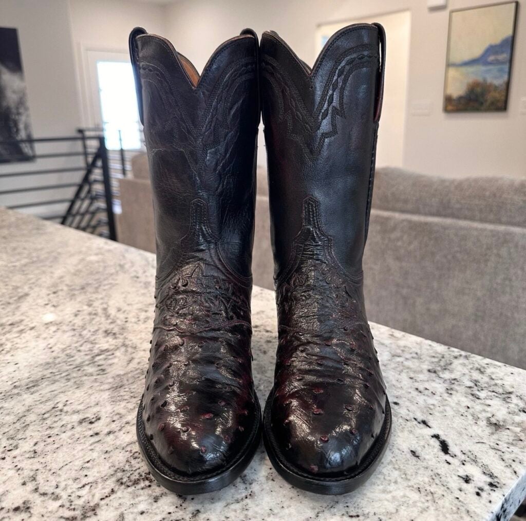 Type: These are women’s size 7 B Lucchese 1883 Ostrich Boots in color black cherry. These boots have a full quill ostrich leather toe and vamp area. Decorative cutout accent on vamp. Smooth ostrich leather heel (counter). Goat leather shaft. Leather outsoles with rubber heel caps. Accent stitching near the shaft collar. Lucchese style N7281.C2. These boots have a Lucchese C toe with a 2 heel. The C toe is a round toe that Lucchese describes as “a slightly less rounded u-shape”, and the 2 heel is a low-height straight-back heel (similar to a roper heel). These boots are in good pre-owned condition. The ostrich leather is in good condition with no rips or tears.