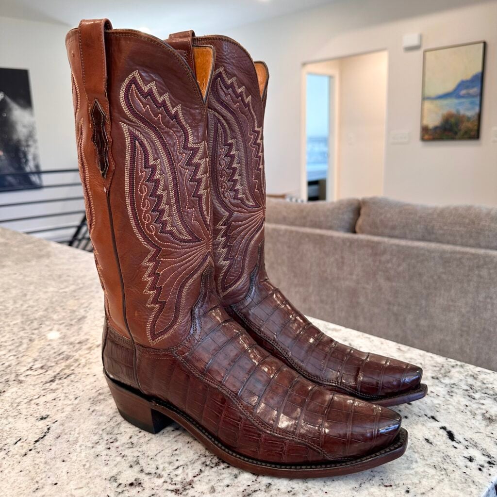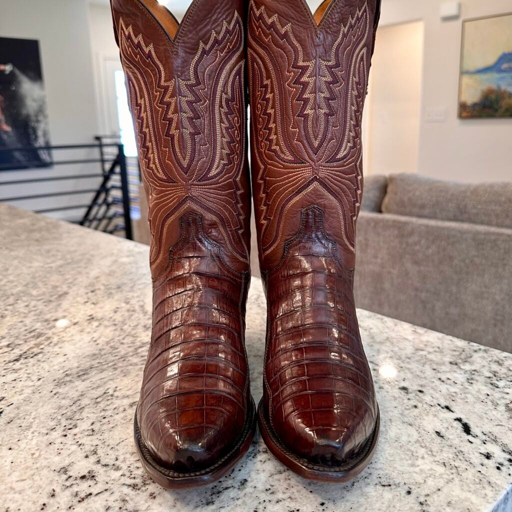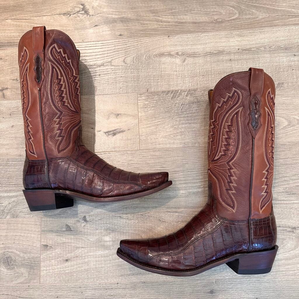 Type: These are men’s size 8 D Lucchese 1883 Caiman Boots in color cognac brown. Lucchese style N9242.54. These boots have a caiman leather foot. There are also caiman leather accents on the shaft pull tabs. Leather outsoles with rubber heel caps. This is one of the Lucchese styles that has the two-tone brown shafts where the front shaft is slightly darker shade of brown than the back shaft. These boots have a Lucchese 5 toe with a 4 heel. The 5 toe is their snip toe and the 4 heel is their traditional cowboy heel. These boots are in good condition and have been well cared for and well kept. There is gentle scuffing near the toes but overall the caiman leather is in good shape.