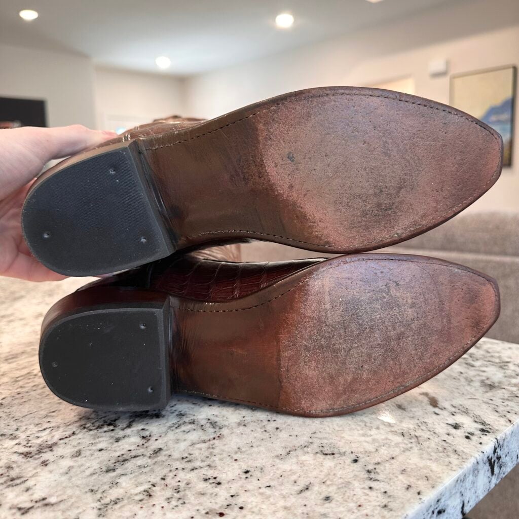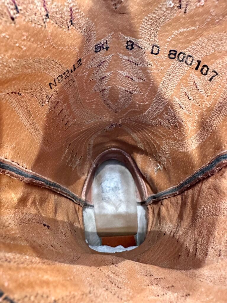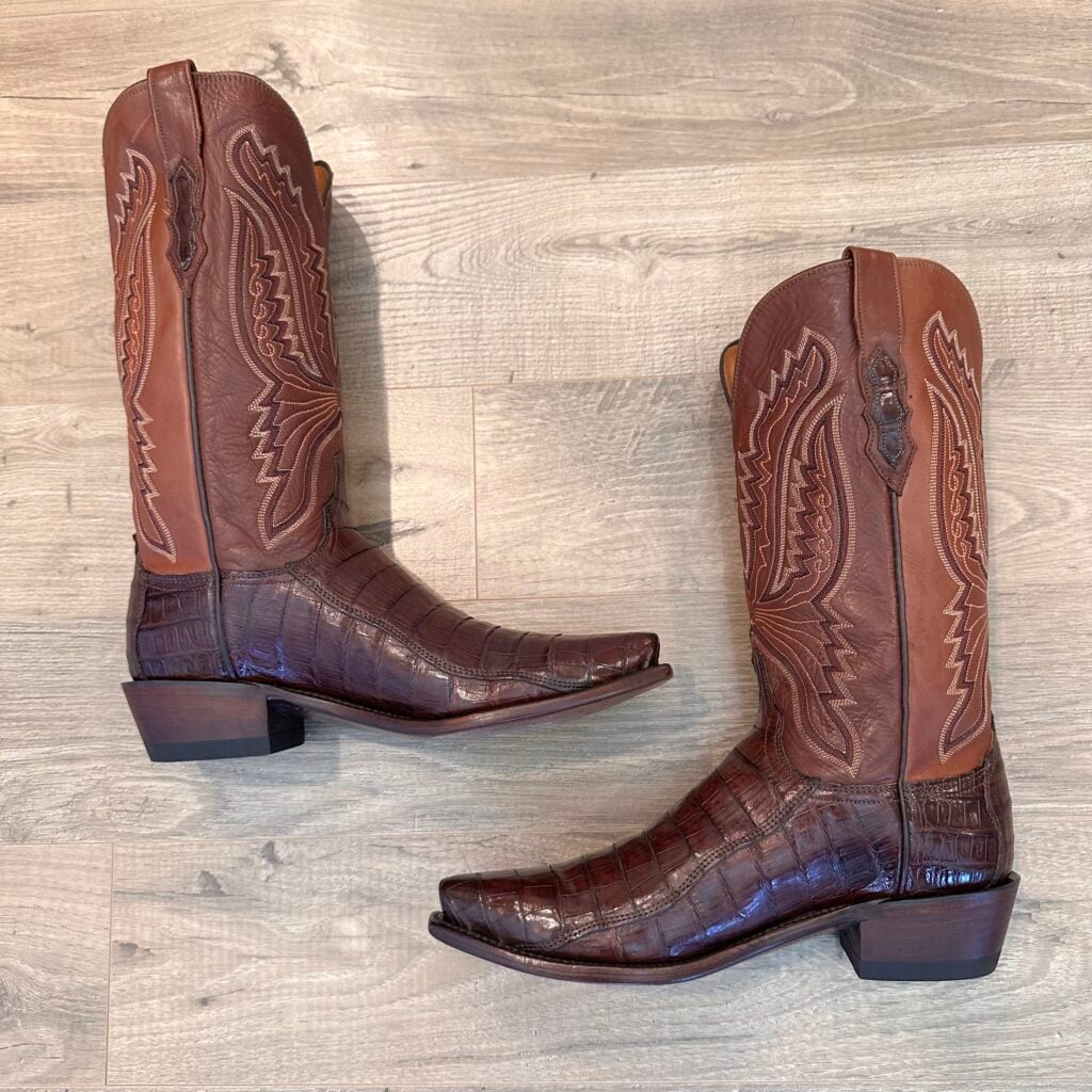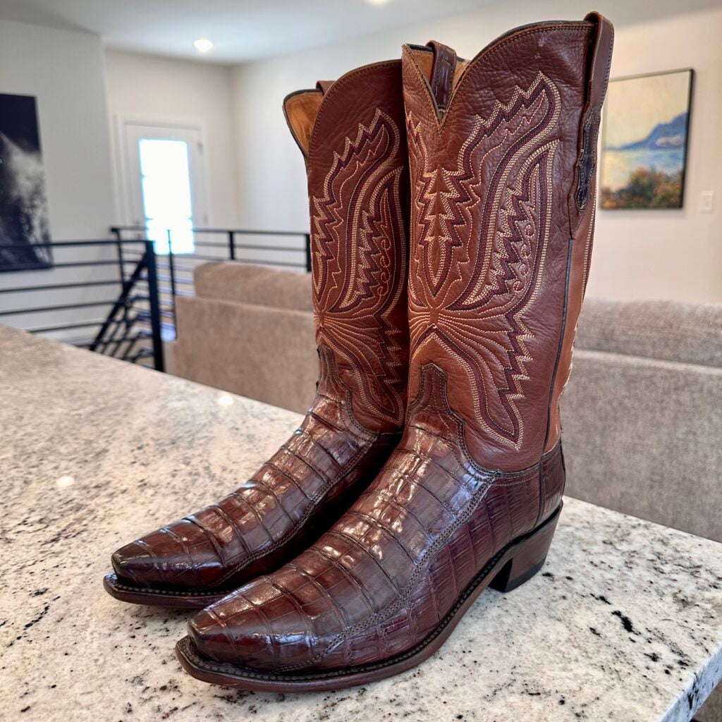Type: These are men’s size 8 D Lucchese 1883 Caiman Boots in color cognac brown. Lucchese style N9242.54. These boots have a caiman leather foot. There are also caiman leather accents on the shaft pull tabs. Leather outsoles with rubber heel caps. This is one of the Lucchese styles that has the two-tone brown shafts where the front shaft is slightly darker shade of brown than the back shaft. These boots have a Lucchese 5 toe with a 4 heel. The 5 toe is their snip toe and the 4 heel is their traditional cowboy heel. These boots are in good condition and have been well cared for and well kept. There is gentle scuffing near the toes but overall the caiman leather is in good shape.
