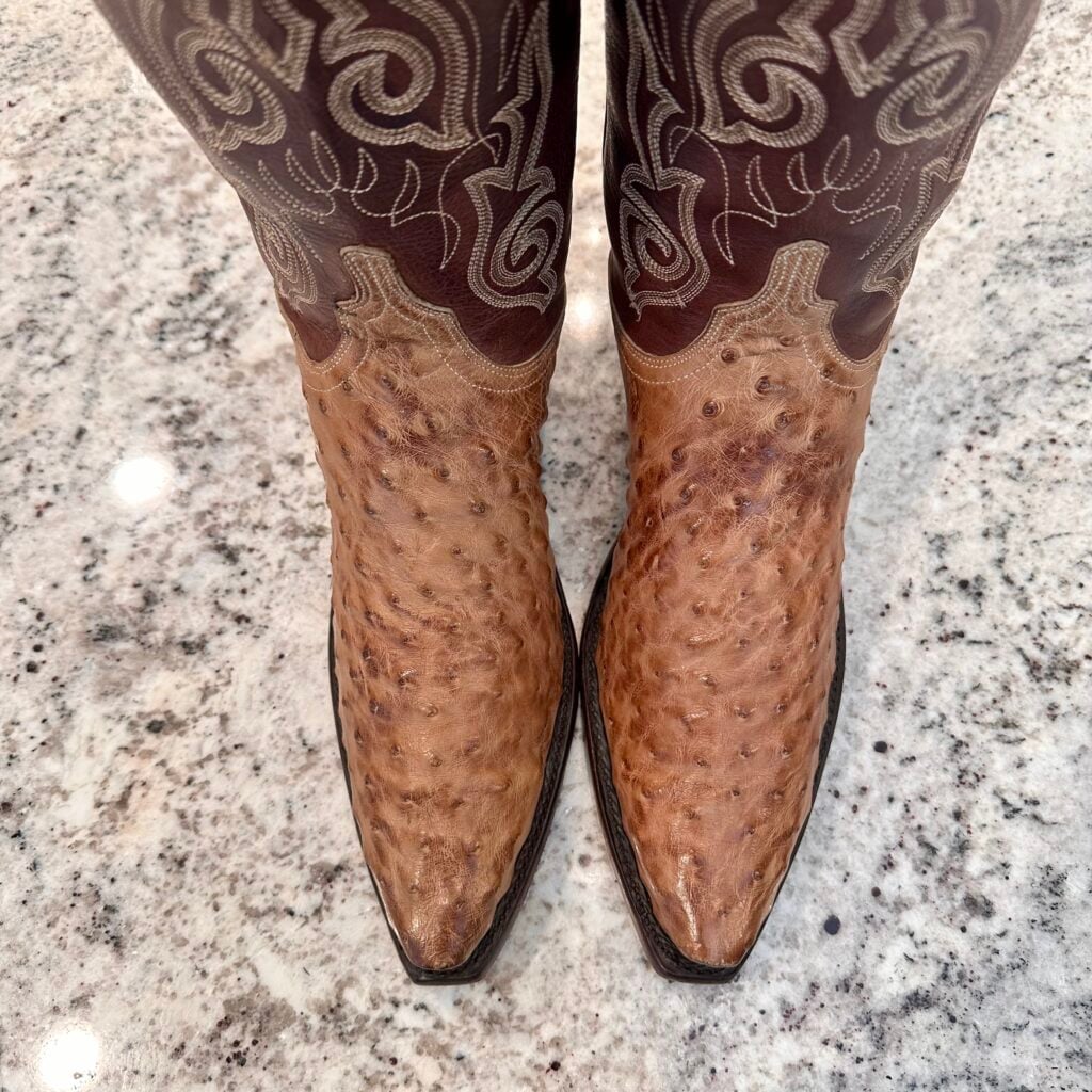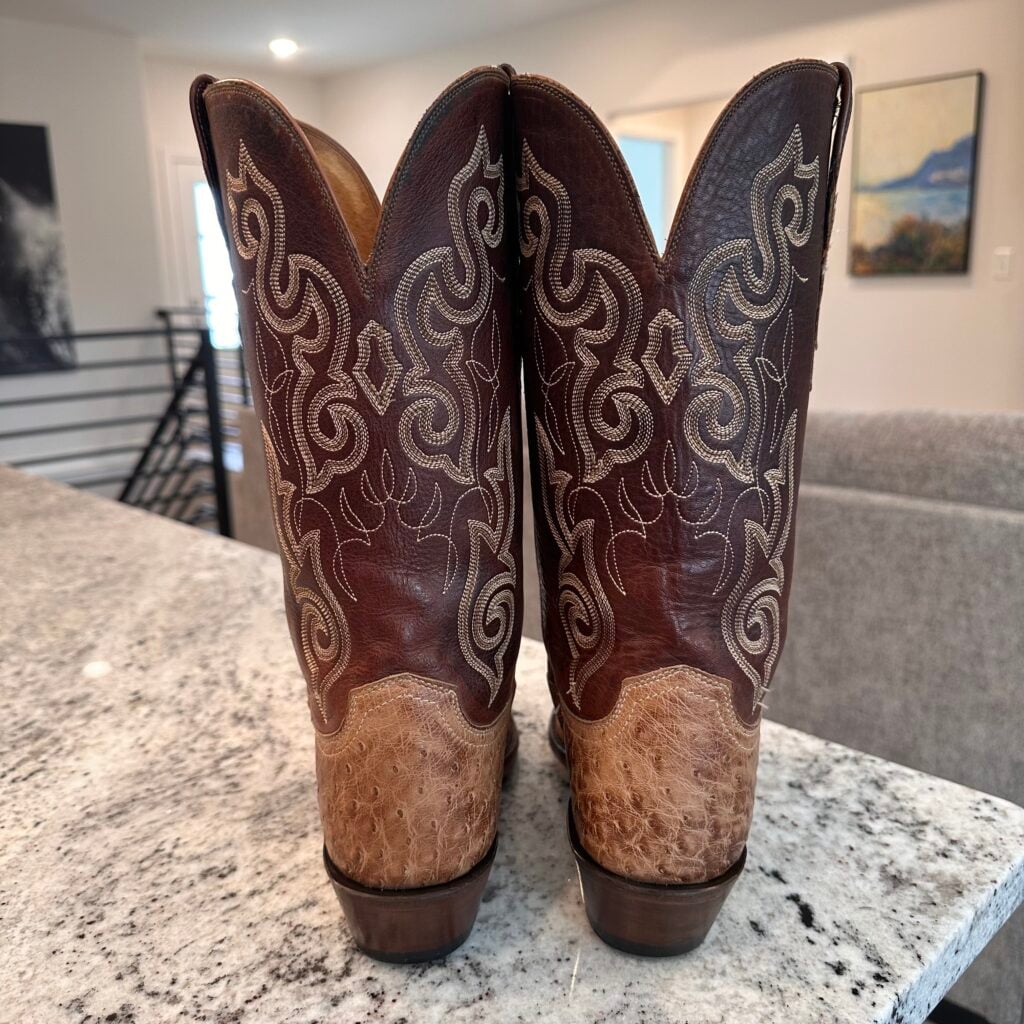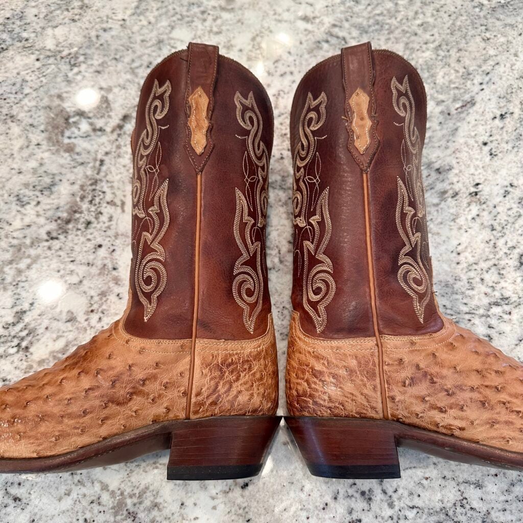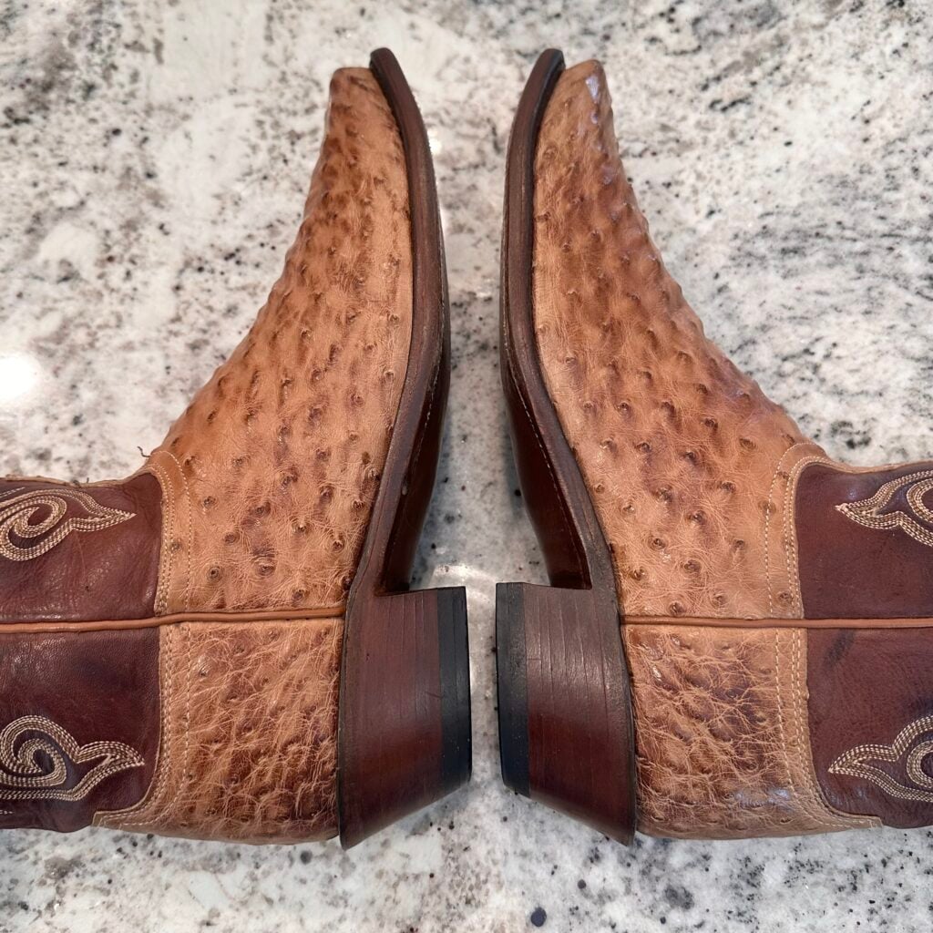 Type: These are women’s size 10 B Lucchese 1883 Full Quill Ostrich boots in color tan/brown. These boots have a full quill ostrich leather foot. There are also ostrich leather accents on the shaft pull tabs. Decorative embroidery stitching on shaft. Lucchese style N4061.54. These boots have a Lucchese 5 toe with a 4 heel. The 5 toe is their snip toe and the 4 heel is their traditional cowboy heel. Leather outsoles with rubber heel caps. Made in USA series. The ostrich leather is in good shape with gentle scuffing near the toes.