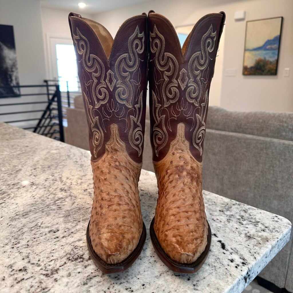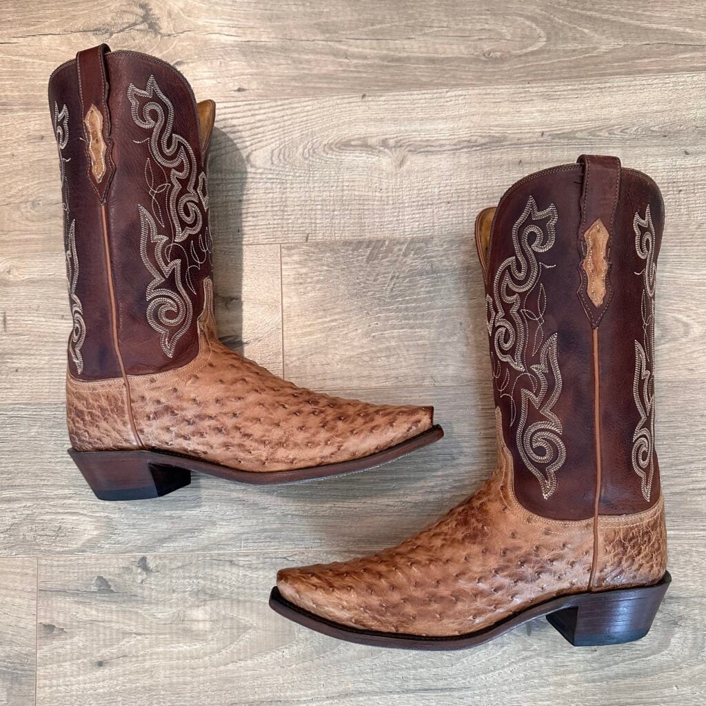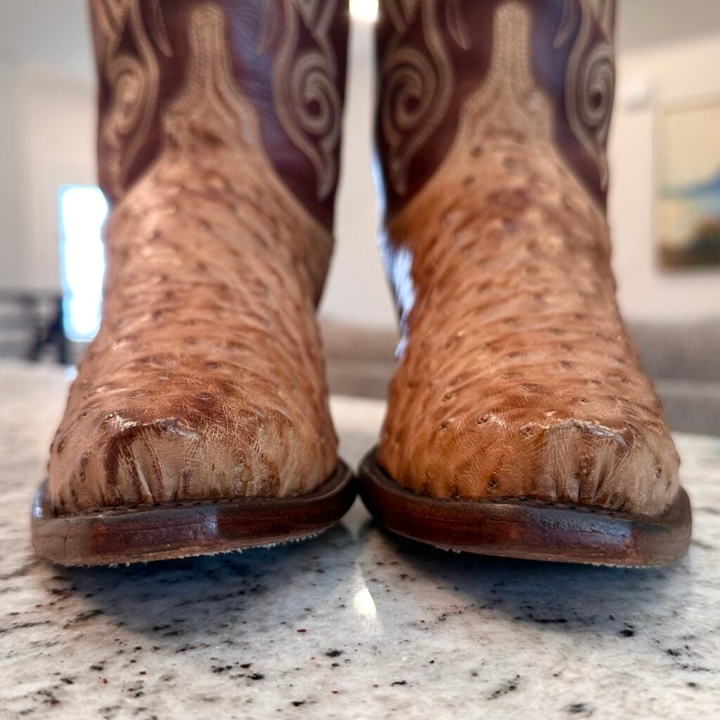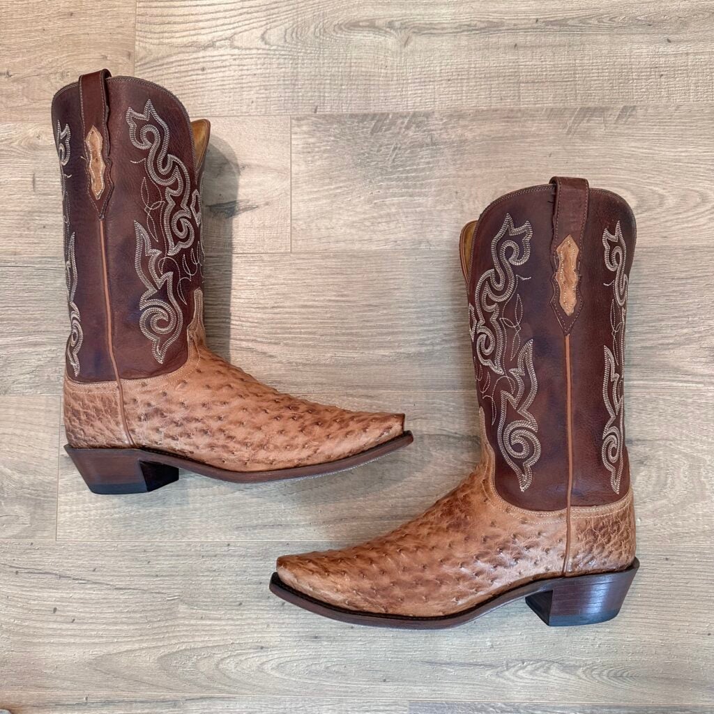 Type: These are women’s size 10 B Lucchese 1883 Full Quill Ostrich boots in color tan/brown. These boots have a full quill ostrich leather foot. There are also ostrich leather accents on the shaft pull tabs. Decorative embroidery stitching on shaft. Lucchese style N4061.54. These boots have a Lucchese 5 toe with a 4 heel. The 5 toe is their snip toe and the 4 heel is their traditional cowboy heel. Leather outsoles with rubber heel caps. Made in USA series. The ostrich leather is in good shape with gentle scuffing near the toes.