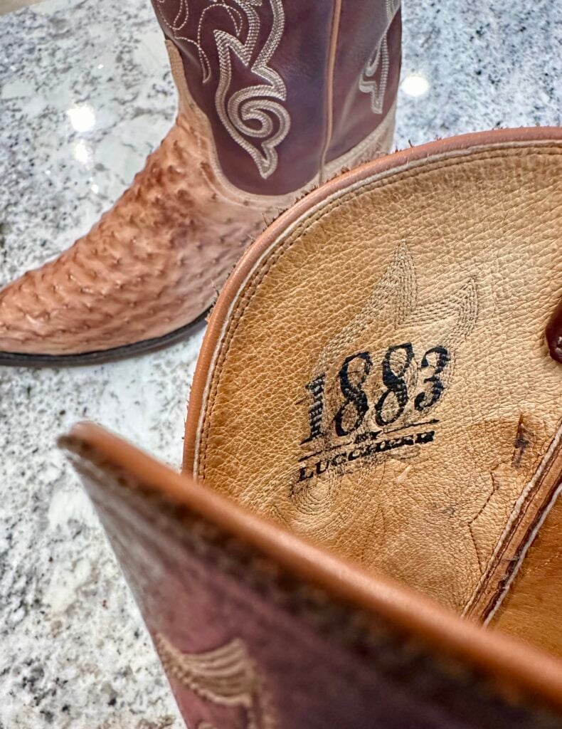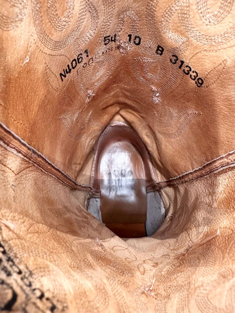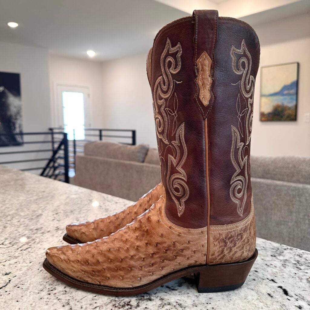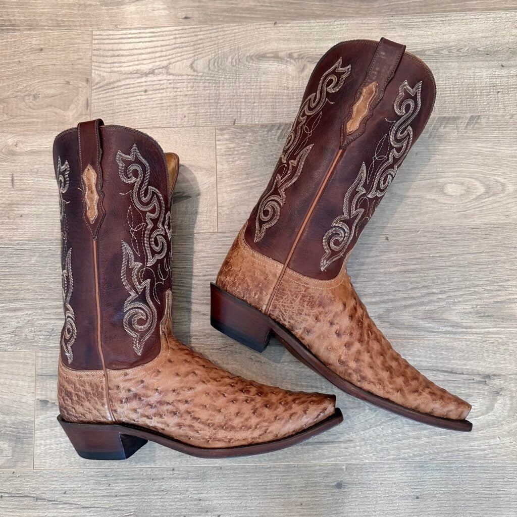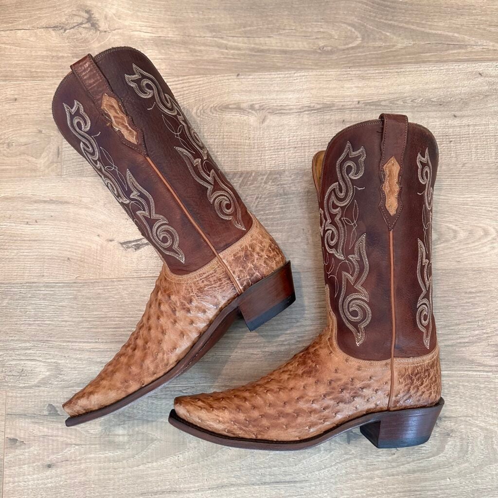 Type: These are women’s size 10 B Lucchese 1883 Full Quill Ostrich boots in color tan/brown. These boots have a full quill ostrich leather foot. There are also ostrich leather accents on the shaft pull tabs. Decorative embroidery stitching on shaft. Lucchese style N4061.54. These boots have a Lucchese 5 toe with a 4 heel. The 5 toe is their snip toe and the 4 heel is their traditional cowboy heel. Leather outsoles with rubber heel caps. Made in USA series. The ostrich leather is in good shape with gentle scuffing near the toes.
