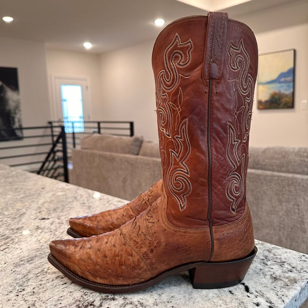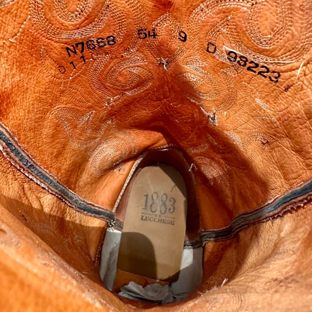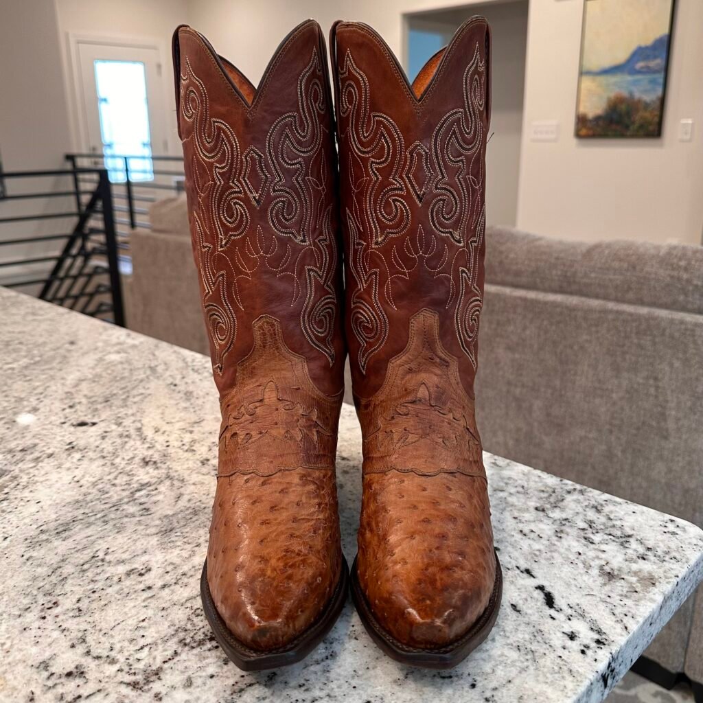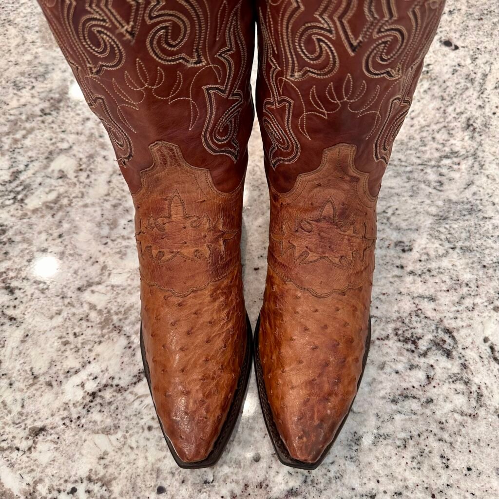 Type: These are men’s size 9 D Lucchese 1883 Ostrich Boots in color brown. These boots have a full quill ostrich leather vamp and toe area. Leather outsoles with rubber heel caps. These boots have a snip toe design. Lucchese style N7668.54. These boots have a Lucchese 5 toe with a 4 heel. The Lucchese 5 toe is their snip toe and the 4 heel is their traditional cowboy heel. The ostrich leather is in good shape and has a really nice brown patina across the foot area.
