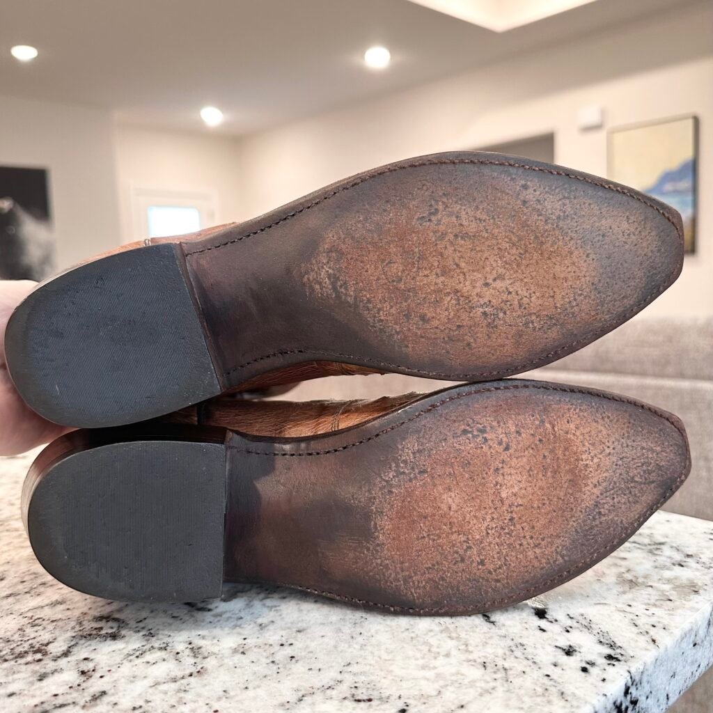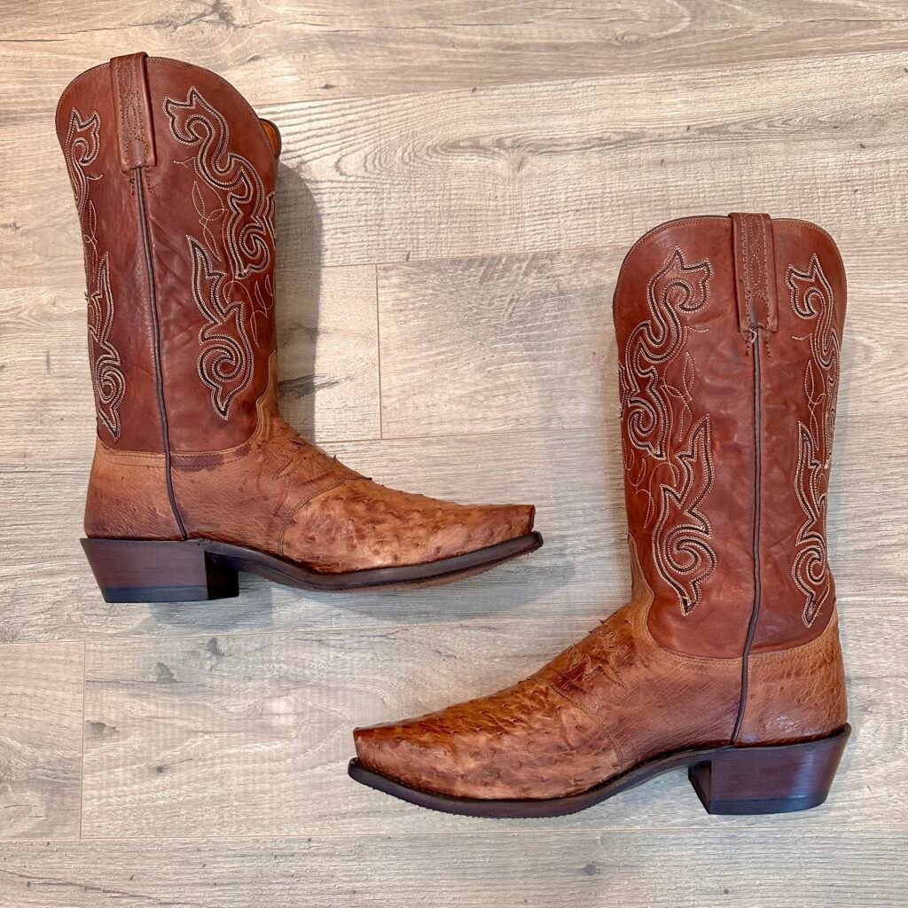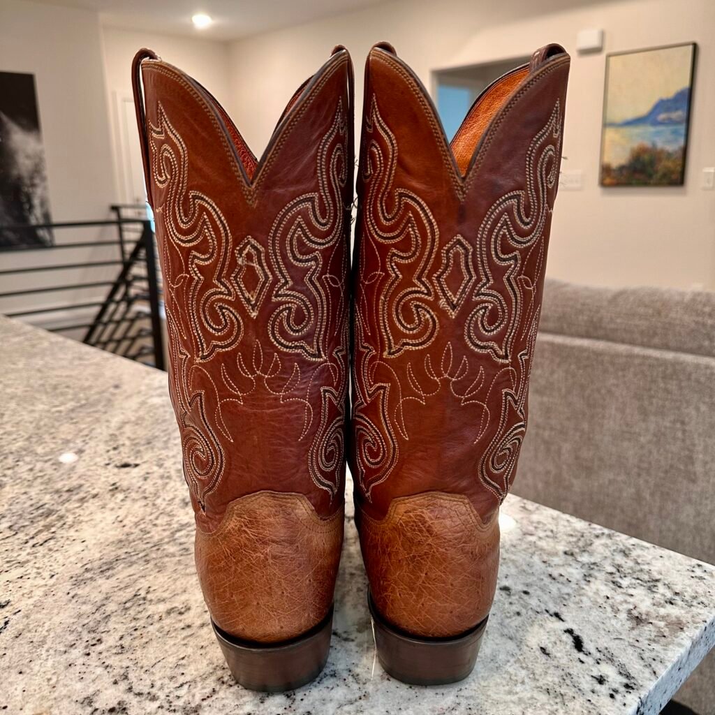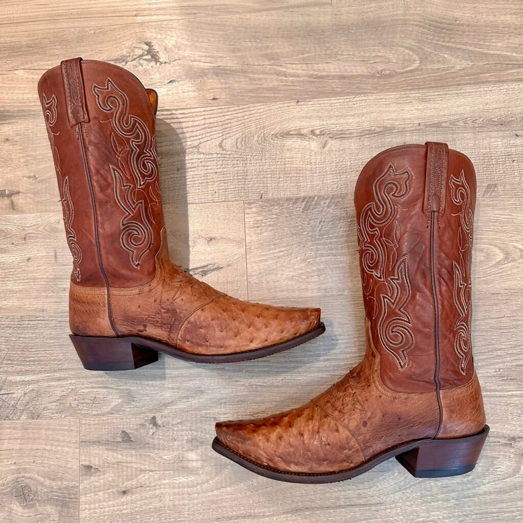Type: These are men’s size 9 D Lucchese 1883 Ostrich Boots in color brown. These boots have a full quill ostrich leather vamp and toe area. Leather outsoles with rubber heel caps. These boots have a snip toe design. Lucchese style N7668.54. These boots have a Lucchese 5 toe with a 4 heel. The Lucchese 5 toe is their snip toe and the 4 heel is their traditional cowboy heel. The ostrich leather is in good shape and has a really nice brown patina across the foot area.