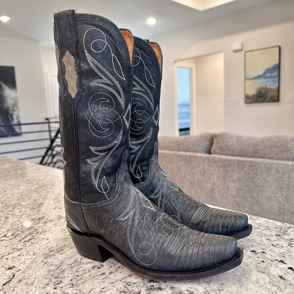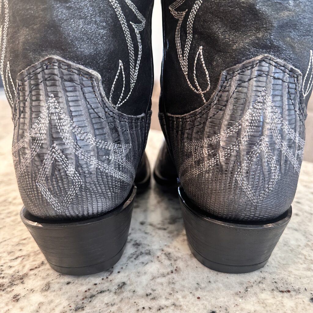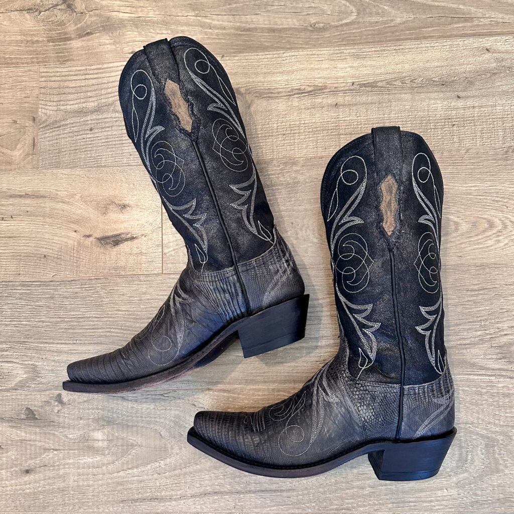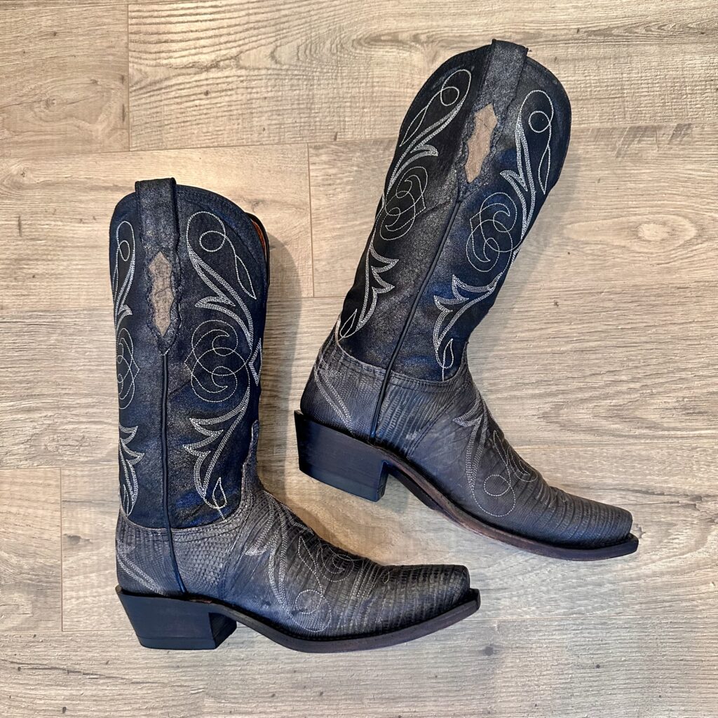 Type: These are women’s size 6.5 B Lucchese 1883 Lizard Boots style N4077 in color Gray + Black. These boots have a lizard leather vamp and counter with a pig leather shaft. The vamp area is a dark gray color and the shaft is a sort of shiny, metallic black. There are brown leather accents on the shaft pull tabs. There is accent stitching on both the shaft and the vamp. Snip toe design with leather outsoles. The collar area has a deeper scallop on front and back for easier on/off.
