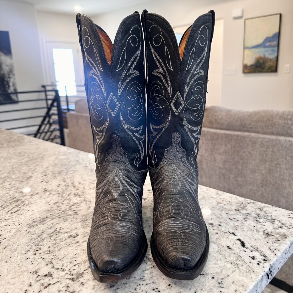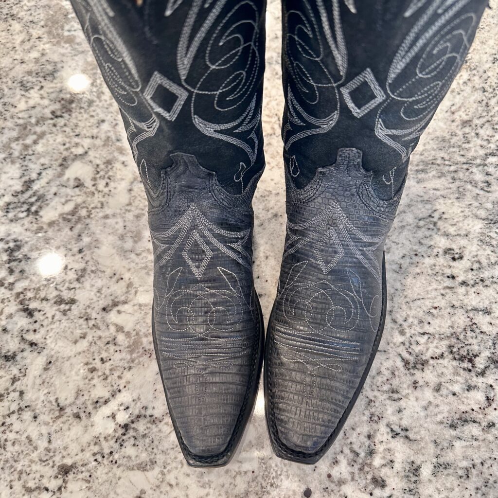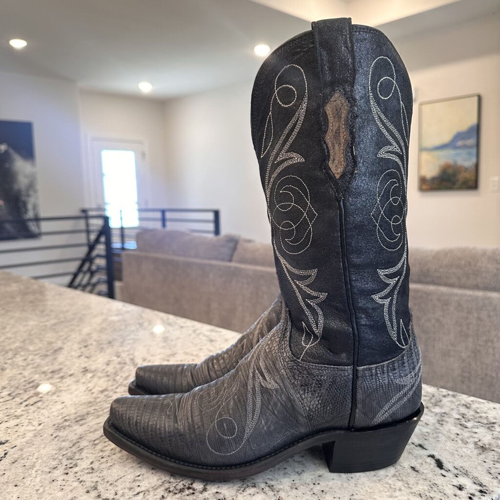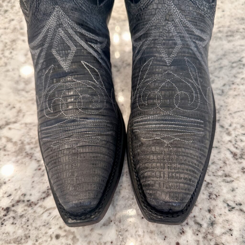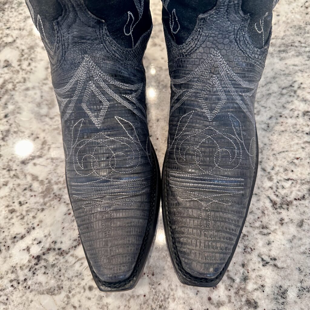 Type: These are women’s size 6.5 B Lucchese 1883 Lizard Boots style N4077 in color Gray + Black. These boots have a lizard leather vamp and counter with a pig leather shaft. The vamp area is a dark gray color and the shaft is a sort of shiny, metallic black. There are brown leather accents on the shaft pull tabs. There is accent stitching on both the shaft and the vamp. Snip toe design with leather outsoles. The collar area has a deeper scallop on front and back for easier on/off.
