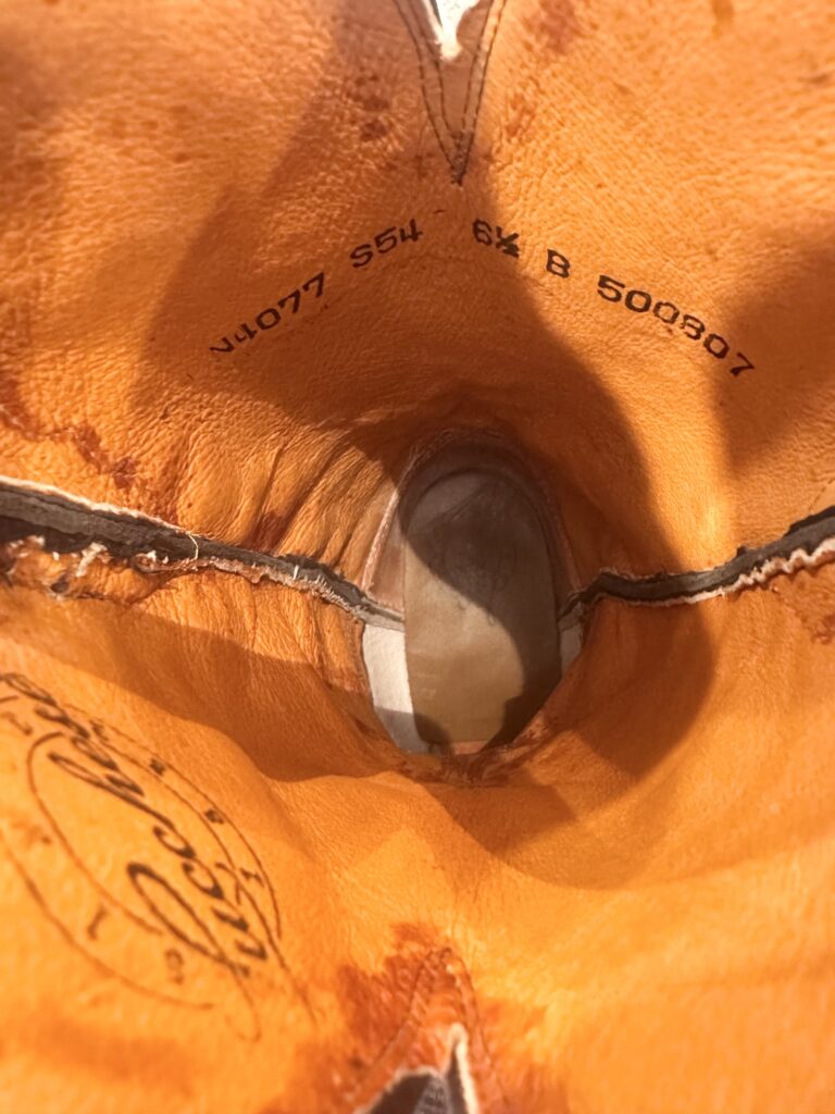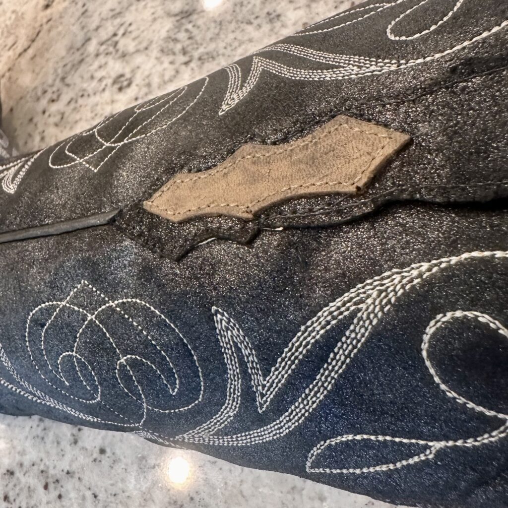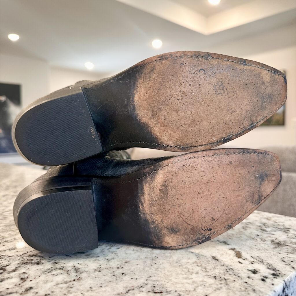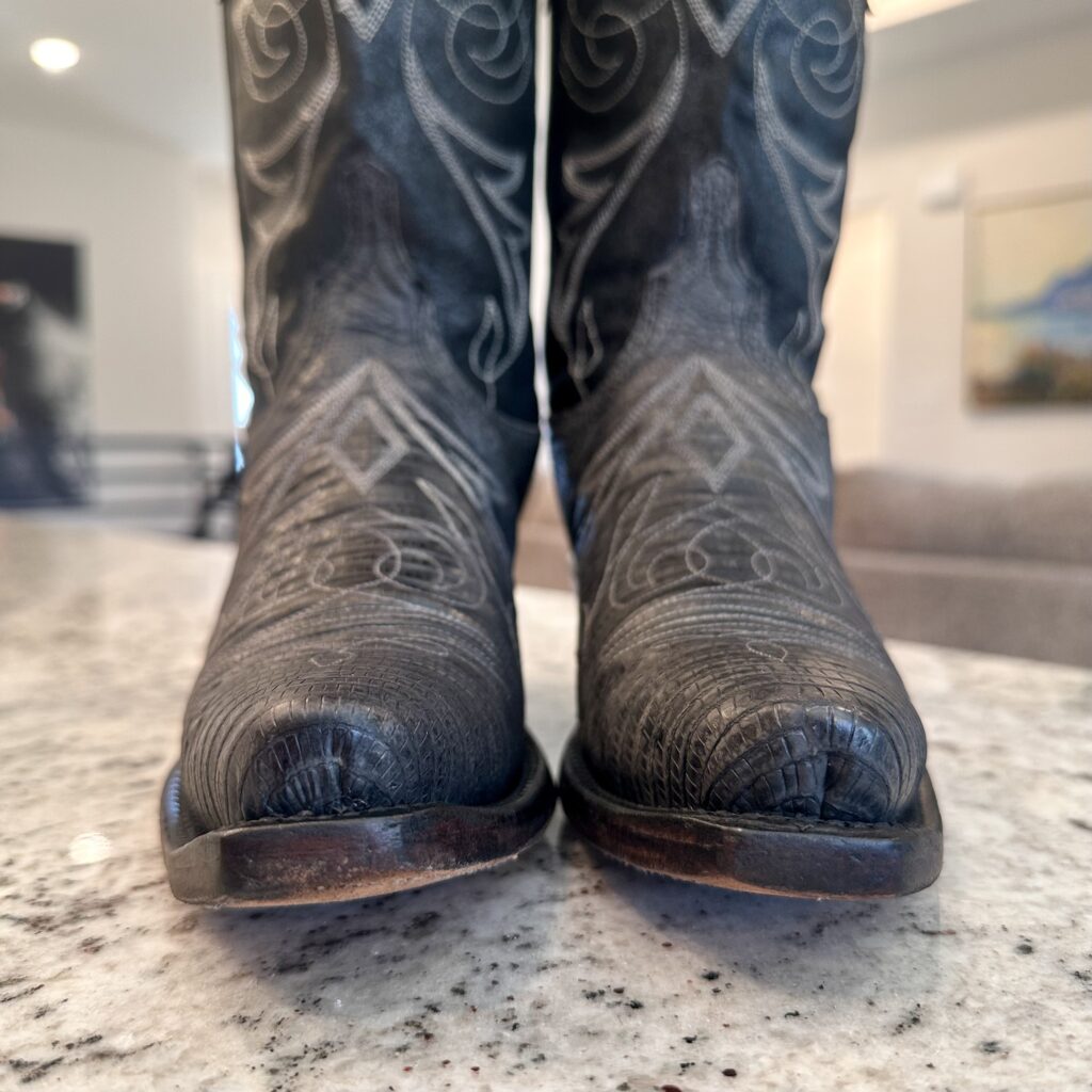 Type: These are women’s size 6.5 B Lucchese 1883 Lizard Boots style N4077 in color Gray + Black. These boots have a lizard leather vamp and counter with a pig leather shaft. The vamp area is a dark gray color and the shaft is a sort of shiny, metallic black. There are brown leather accents on the shaft pull tabs. There is accent stitching on both the shaft and the vamp. Snip toe design with leather outsoles. The collar area has a deeper scallop on front and back for easier on/off.