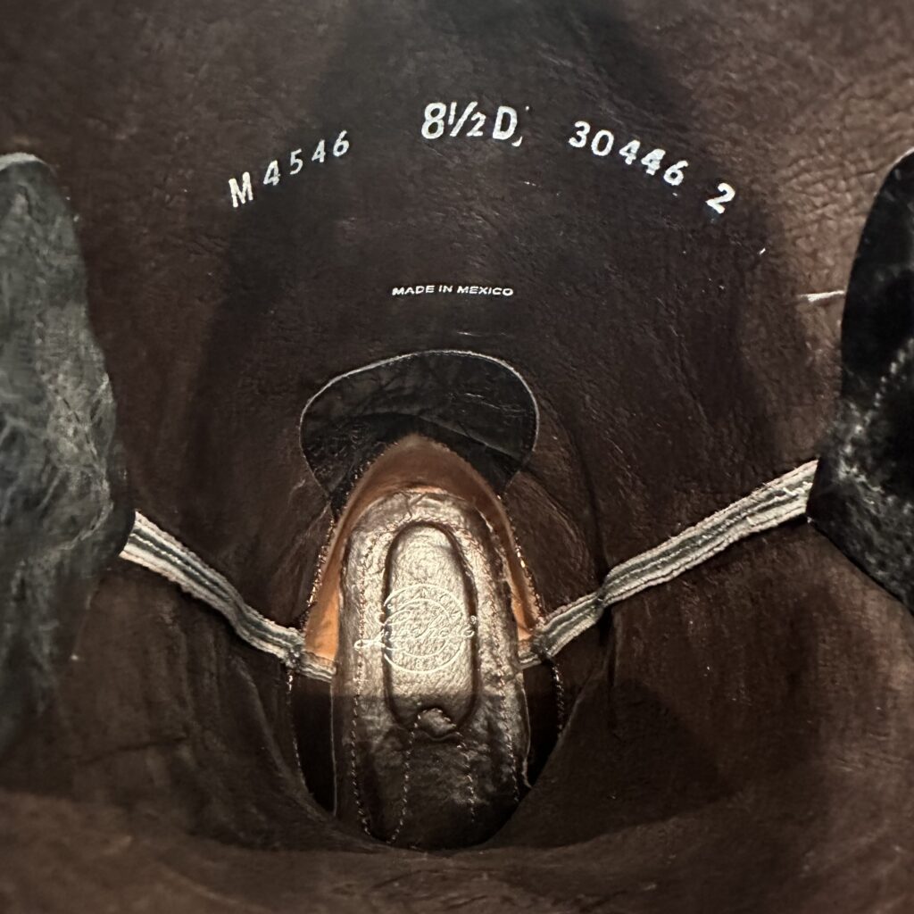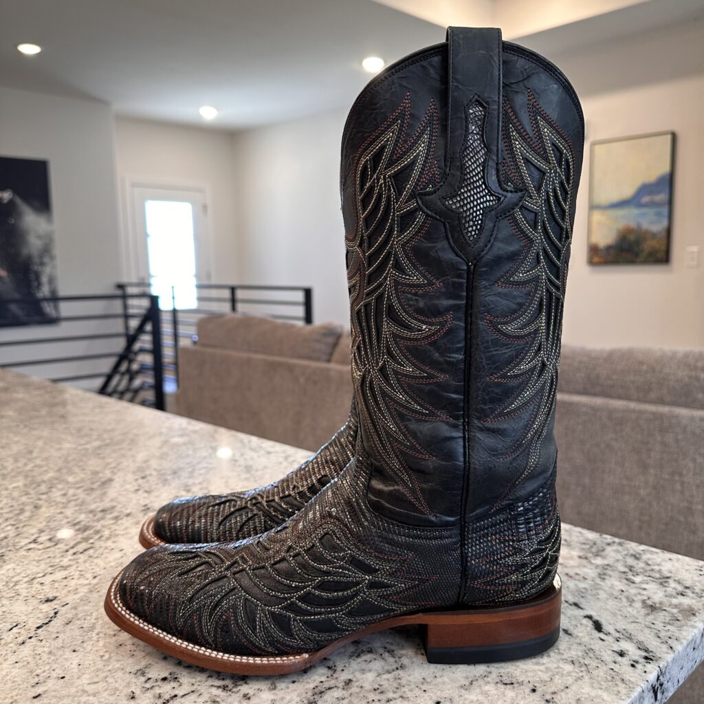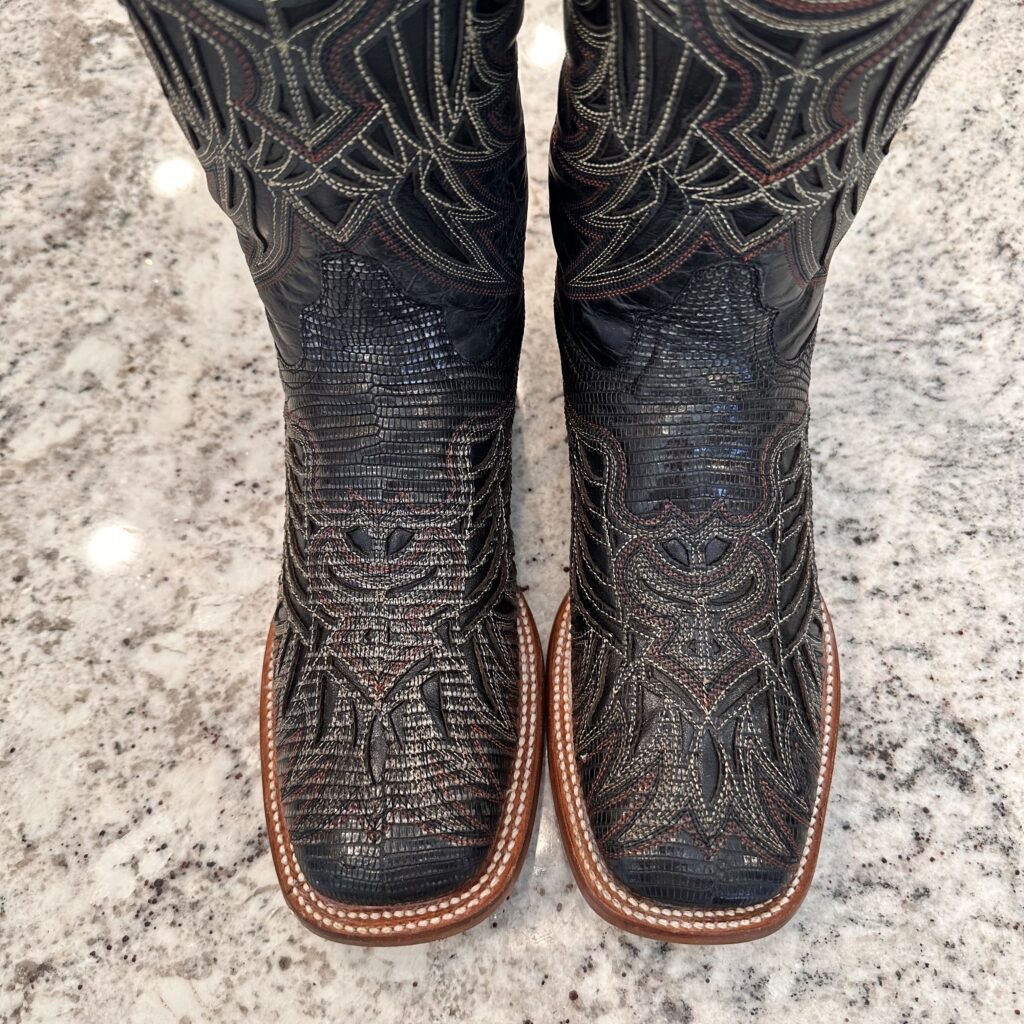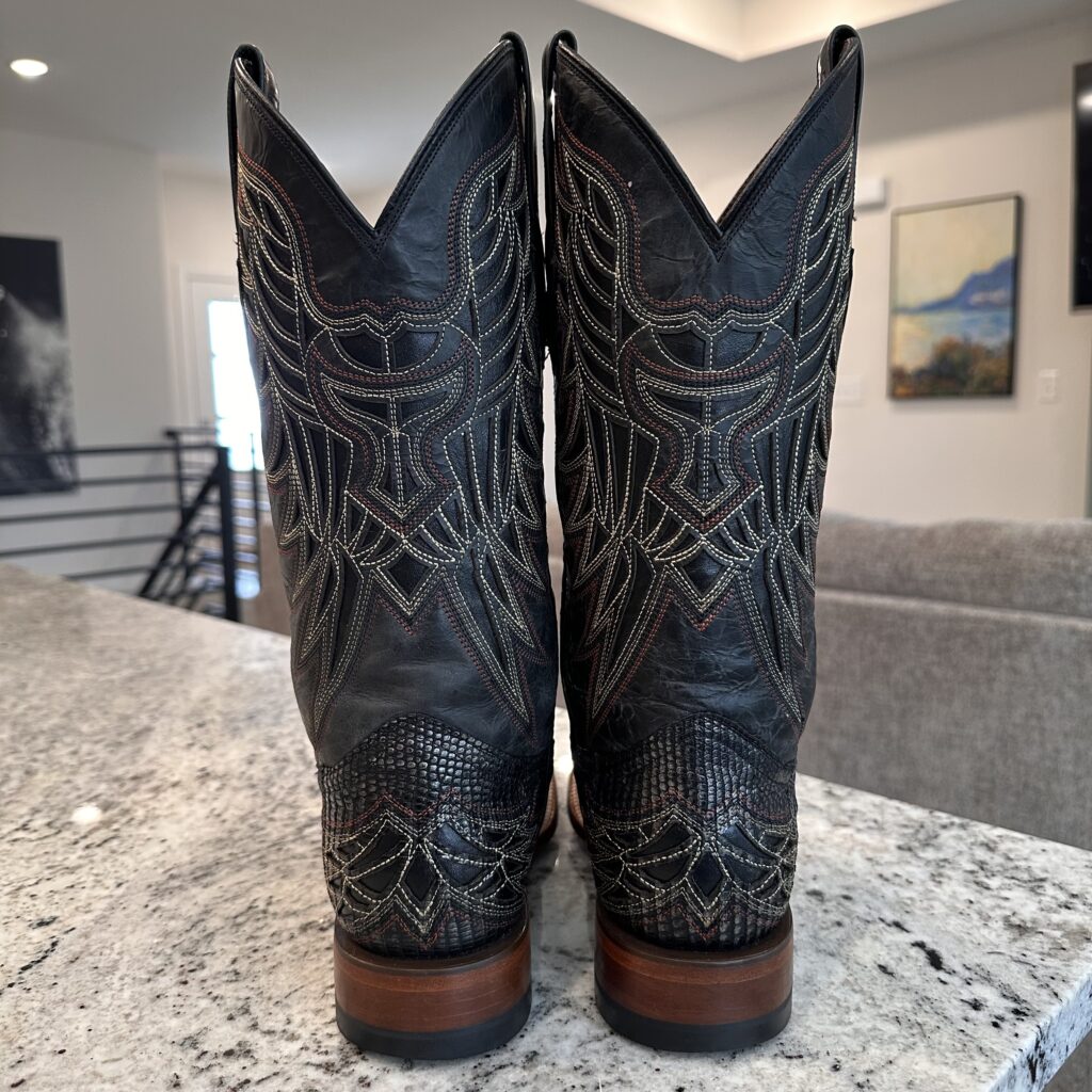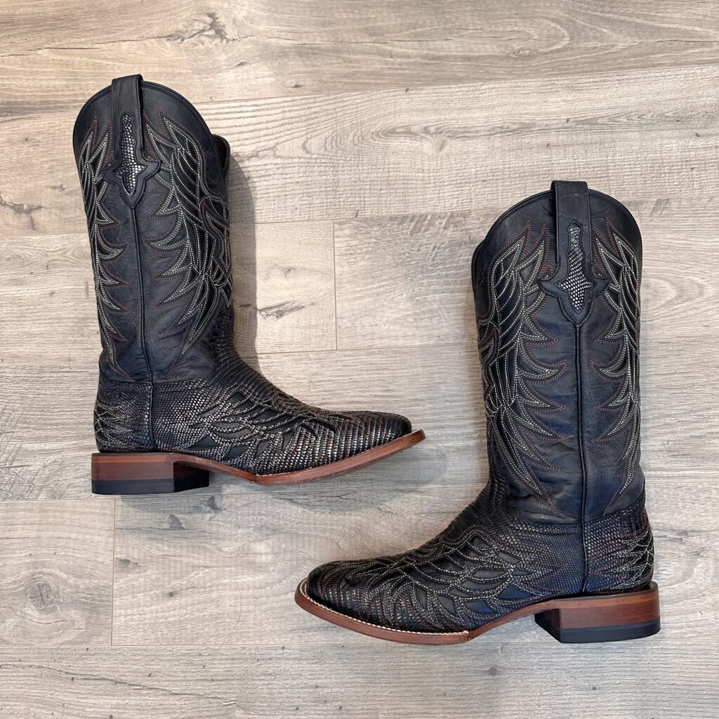 Type: These are men’s size 8.5 D Lucchese Boots style M4546. These boots have a black/silver lizard leather overlay with a calfskin shaft and foot. Lizard leather accents also on the shaft pull tabs. Decorative embroidery. Lizard leather is black with silver metallic patina. The color is black but in some lights the silver metallic really shows. Leather outsoles with rubber heel caps. Square Toe design. These boots are in good condition.