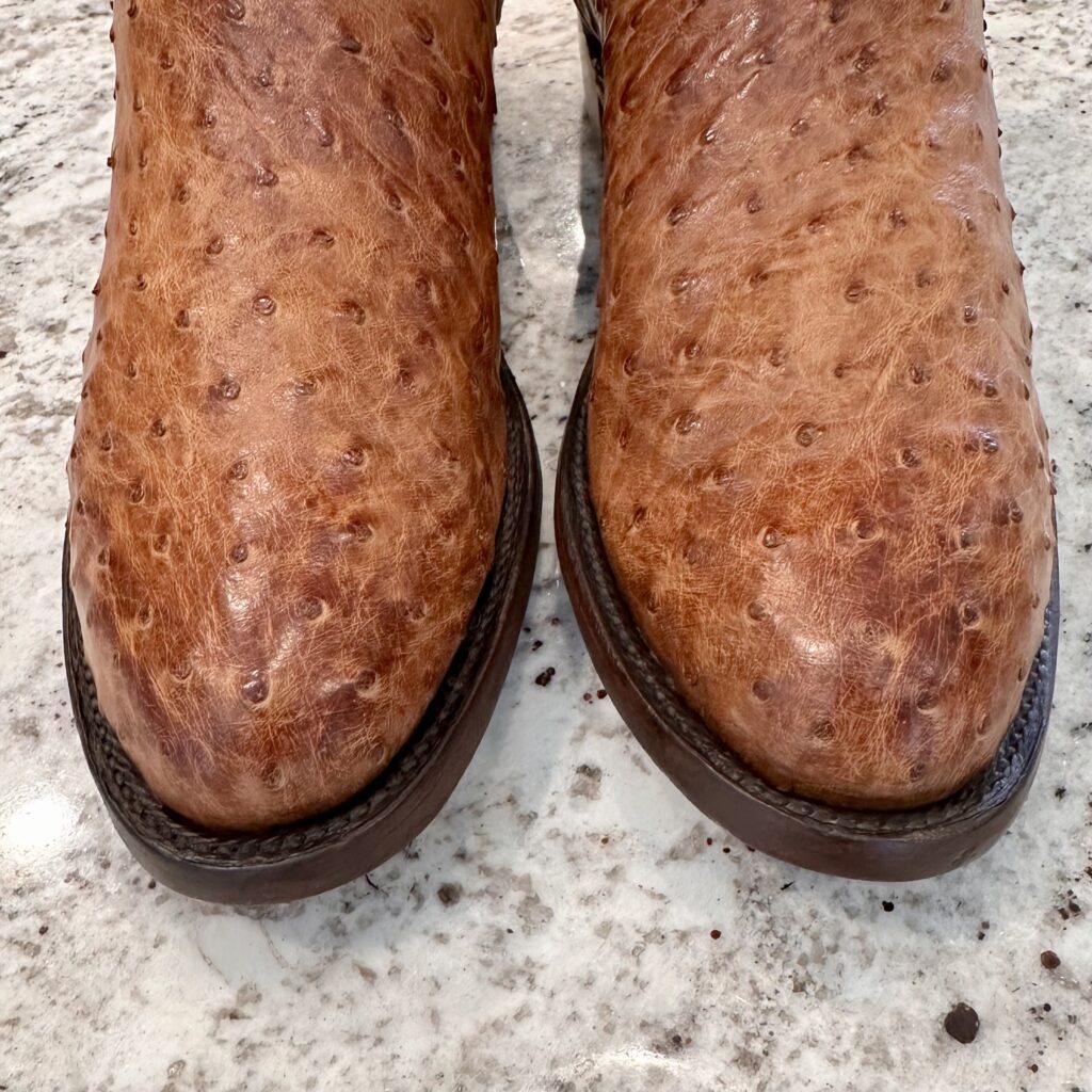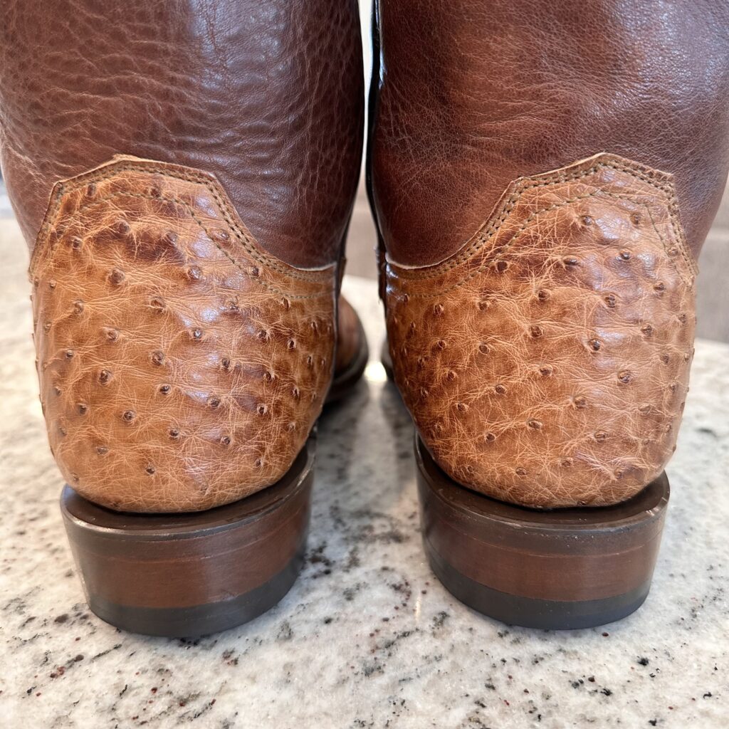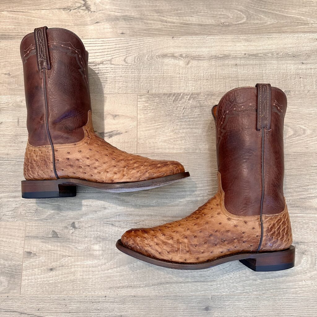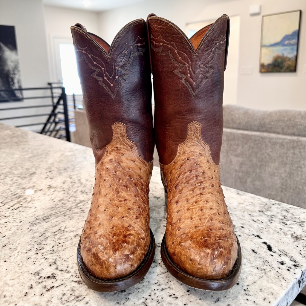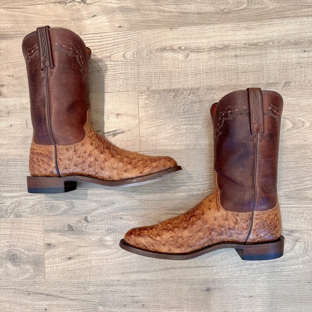 Type: These are men’s size 10 D Lucchese 1883 Full Quill Roper Cowboy Boots. These boots have a full quill ostrich leather foot. Roper heel. Leather outsoles, rounded toe. Made in USA. Lucchese style N3032.C2. The ostrich leather is in great shape and has a really nice brown patina.