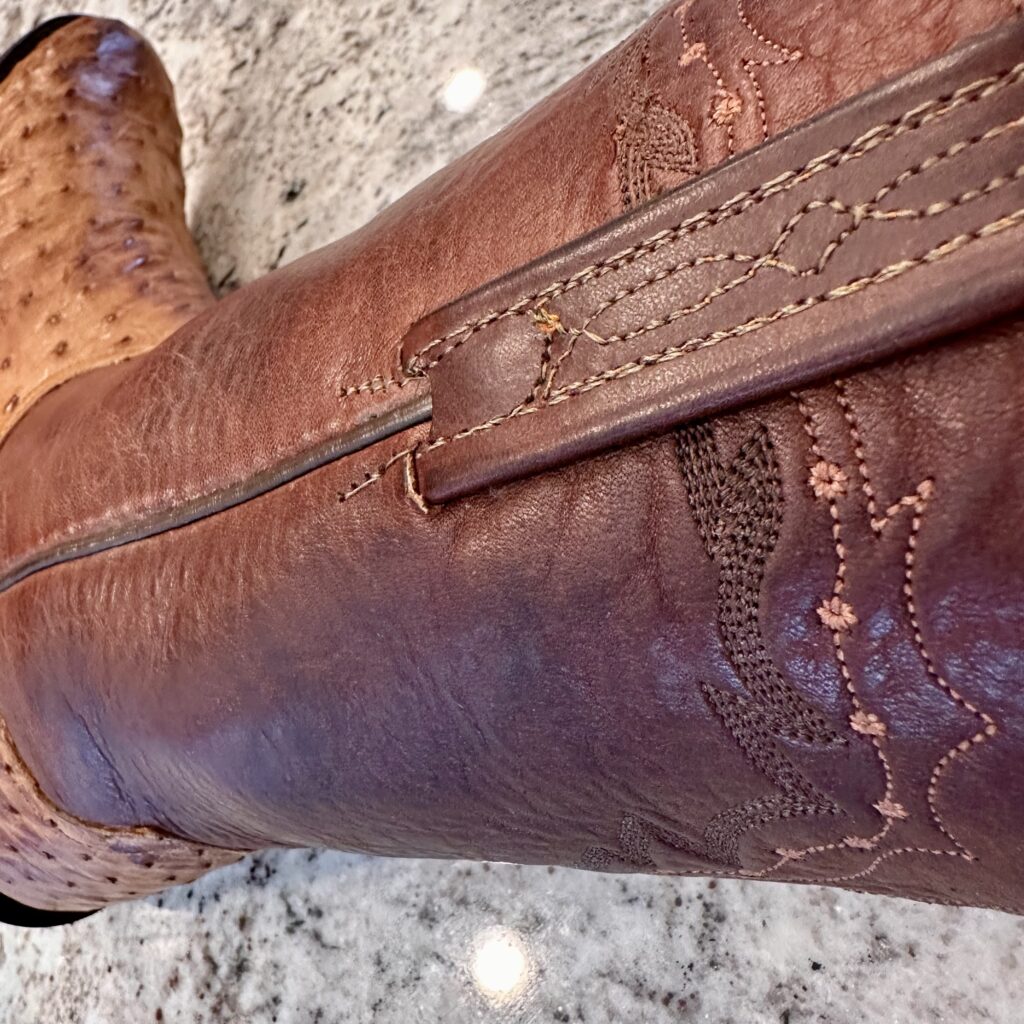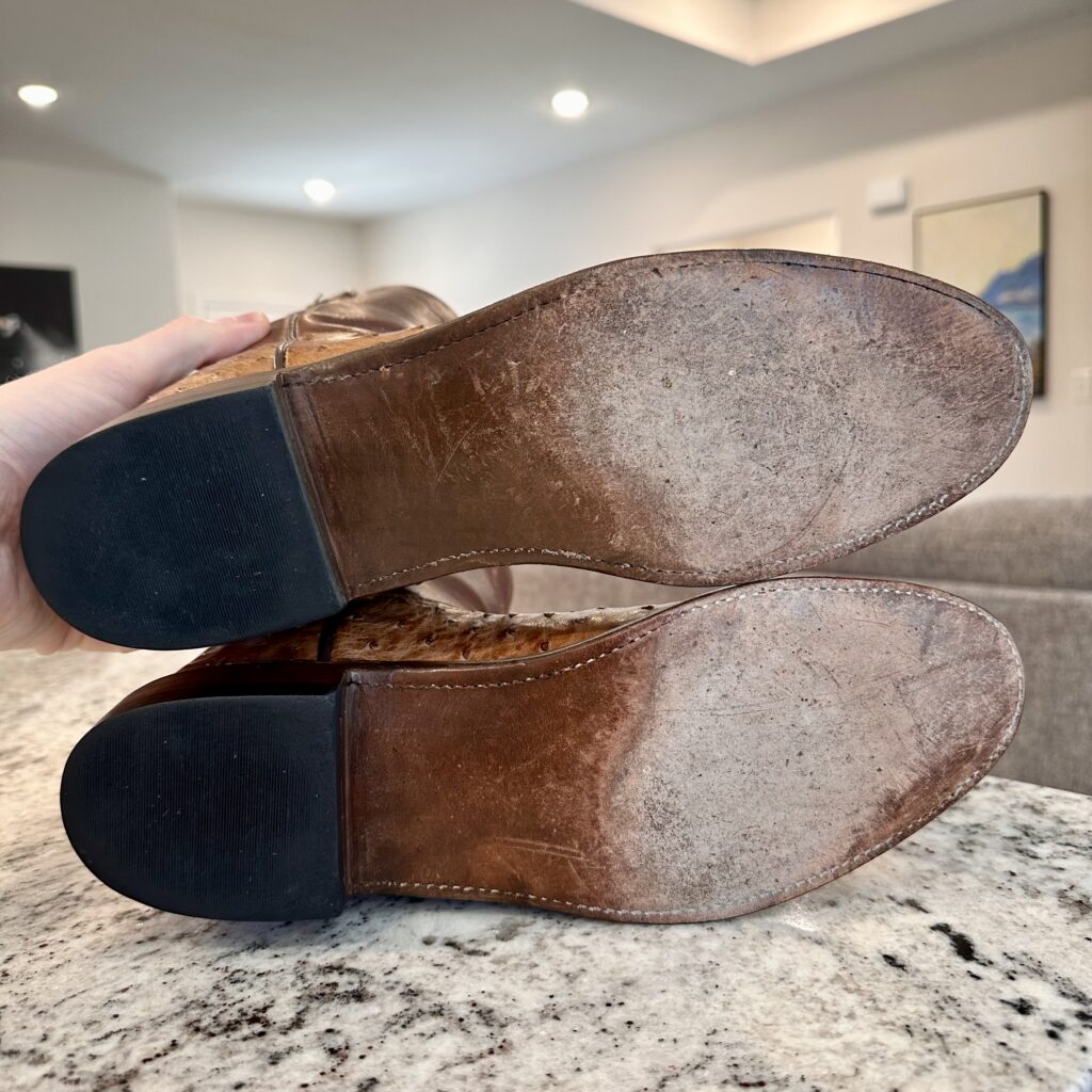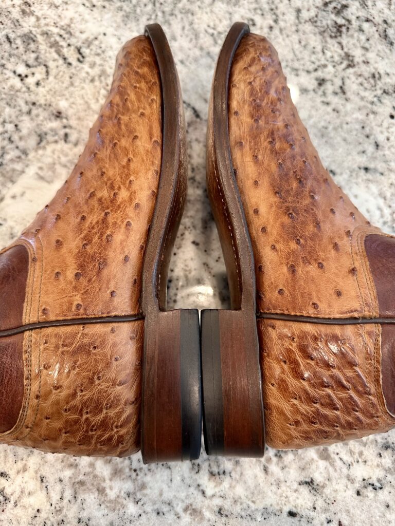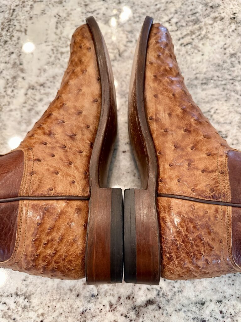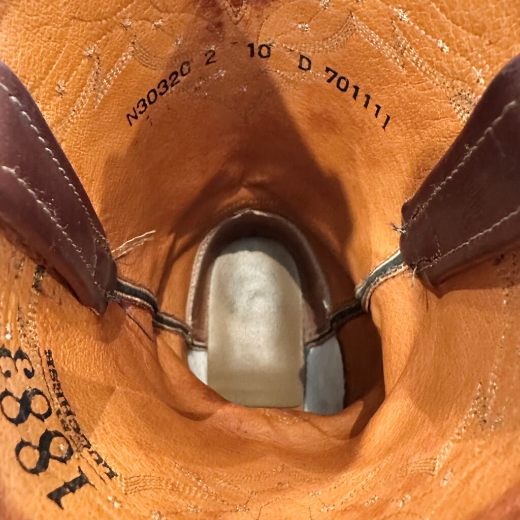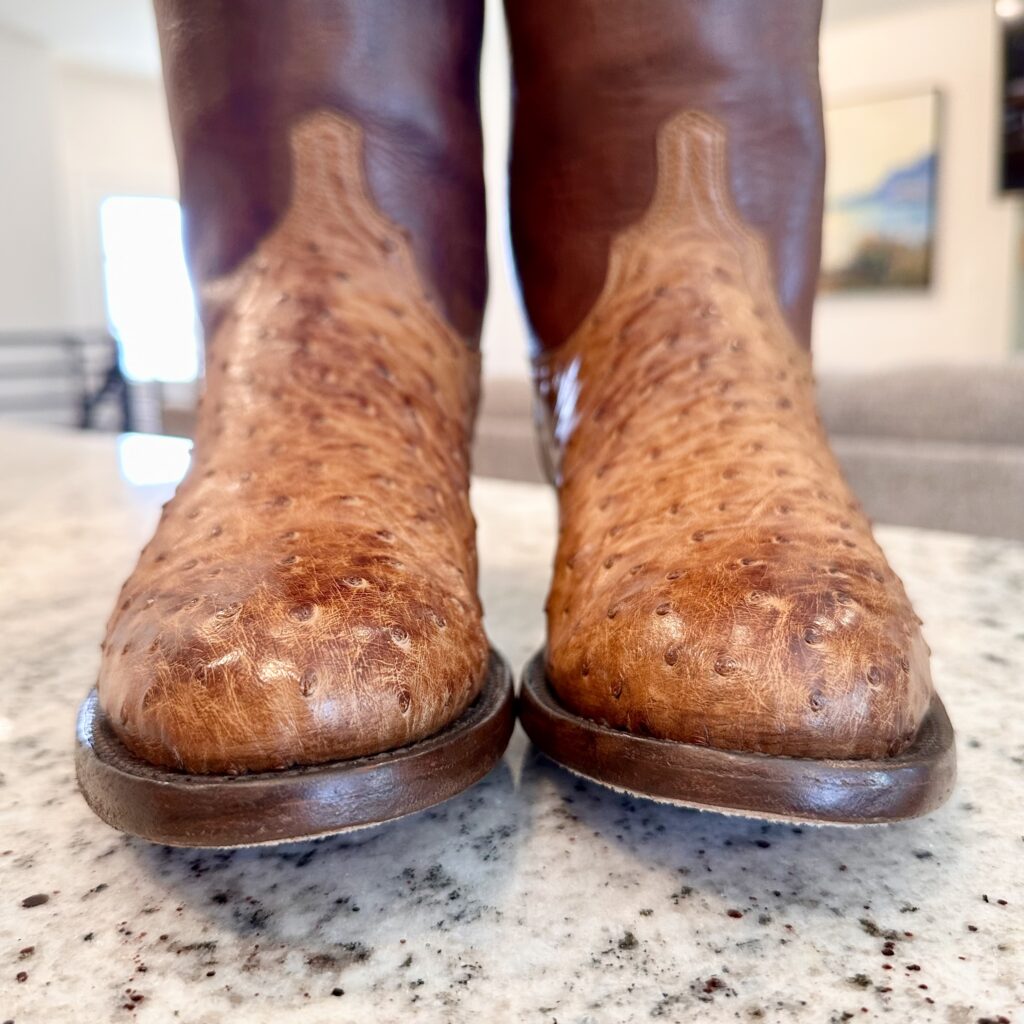 Type: These are men’s size 10 D Lucchese 1883 Full Quill Roper Cowboy Boots. These boots have a full quill ostrich leather foot. Roper heel. Leather outsoles, rounded toe. Made in USA. Lucchese style N3032.C2. The ostrich leather is in great shape and has a really nice brown patina.