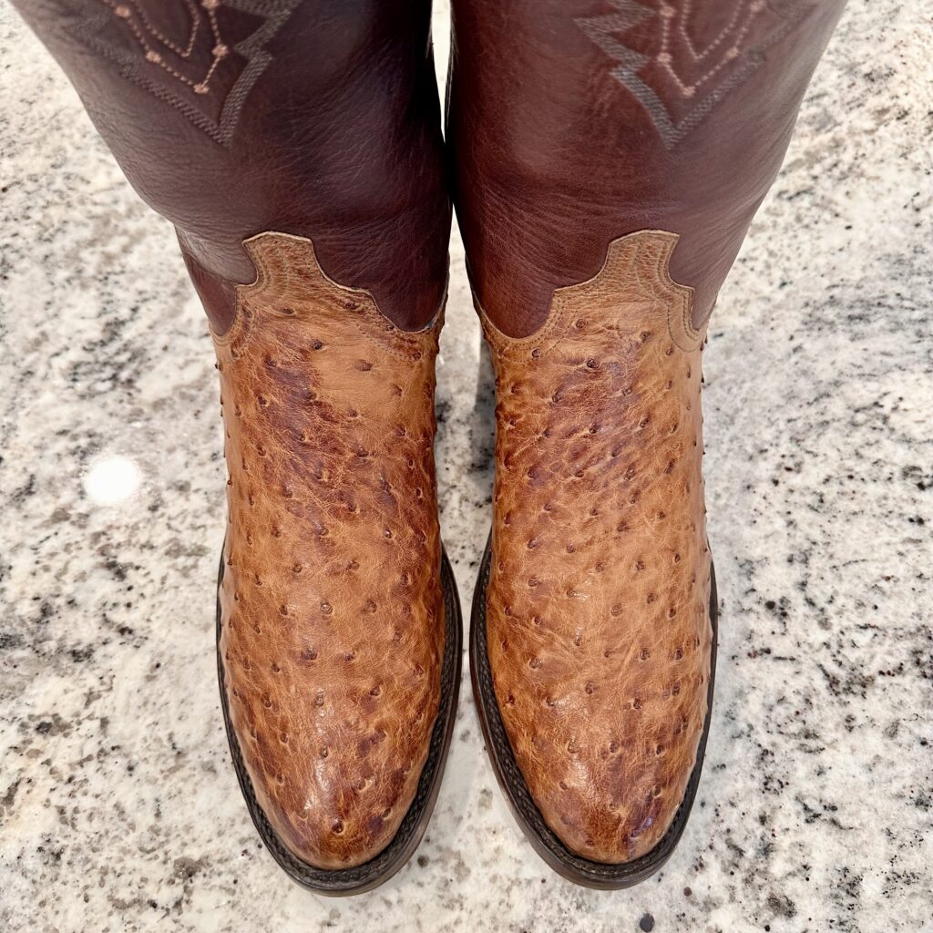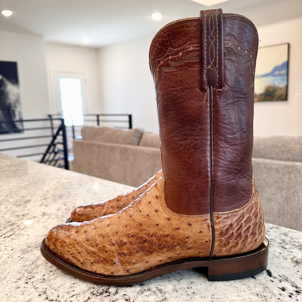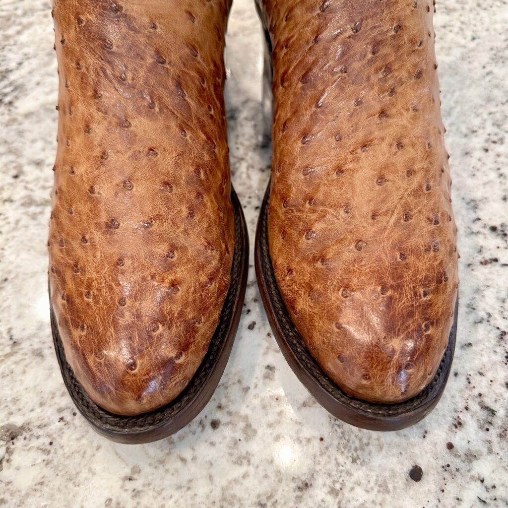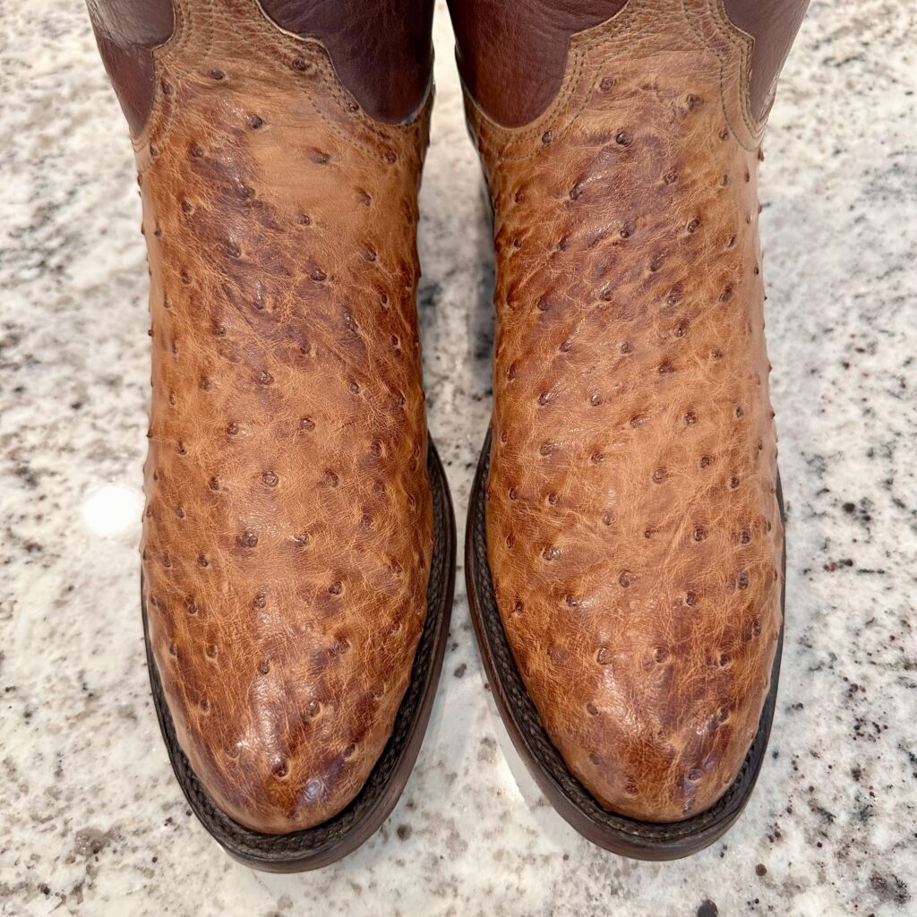 Type: These are men’s size 10 D Lucchese 1883 Full Quill Roper Cowboy Boots. These boots have a full quill ostrich leather foot. Roper heel. Leather outsoles, rounded toe. Made in USA. Lucchese style N3032.C2. The ostrich leather is in great shape and has a really nice brown patina.