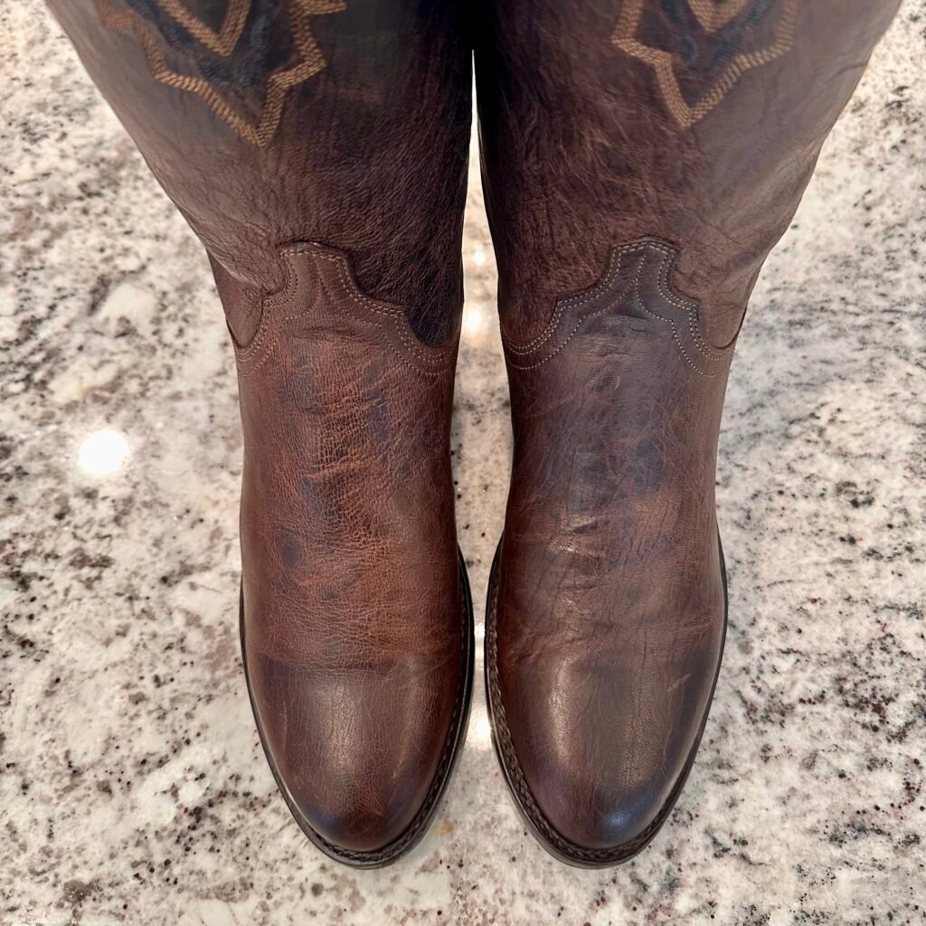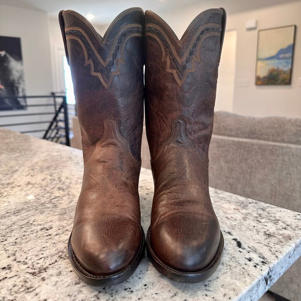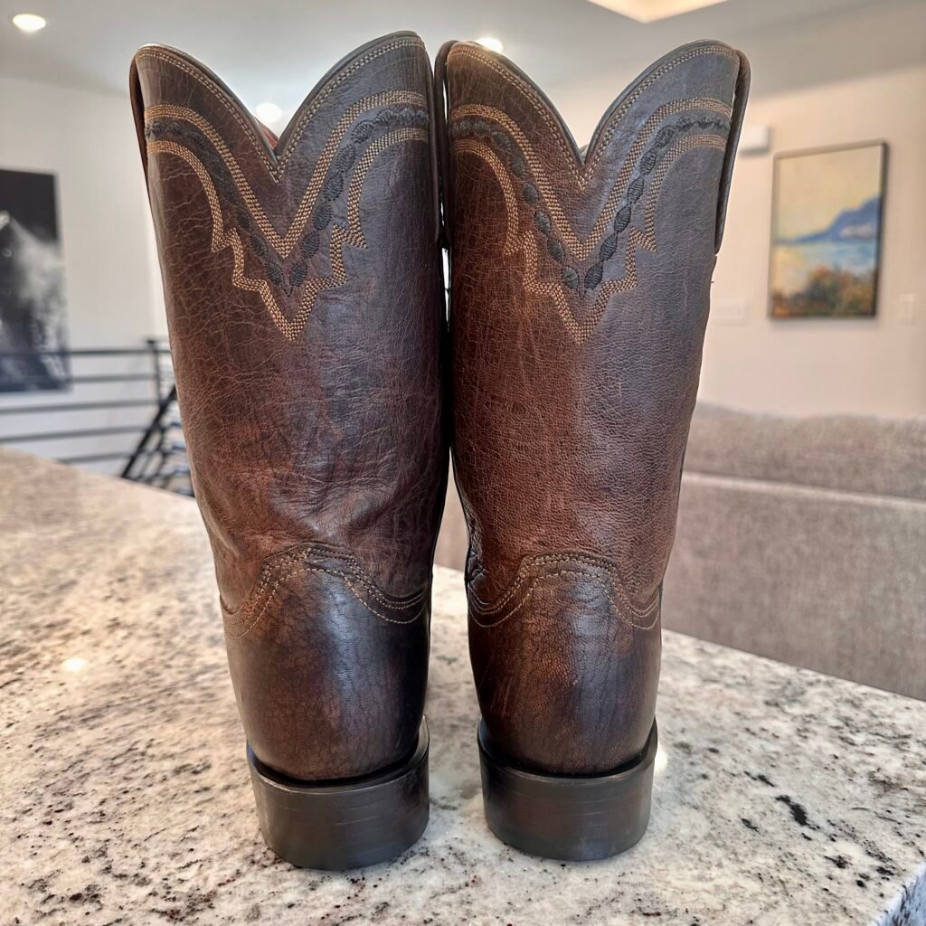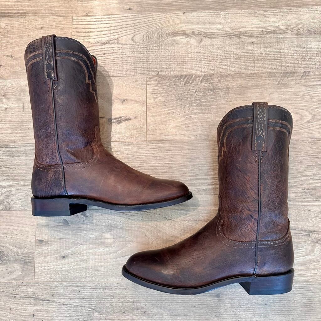 Type: These are men’s size 8.5 D Lucchese 2000 Goat Ropers in color brown. Lucchese 2000 T series. These boots are made with goat leather uppers. Roper heel with rounded toe. Leather outsoles with rubber heel caps. There is accent stitching near the collar of the shaft. Lucchese style T0122.C2. The goat leather is in good condition, but does have some gentle scuffing near the toes and heels from use.