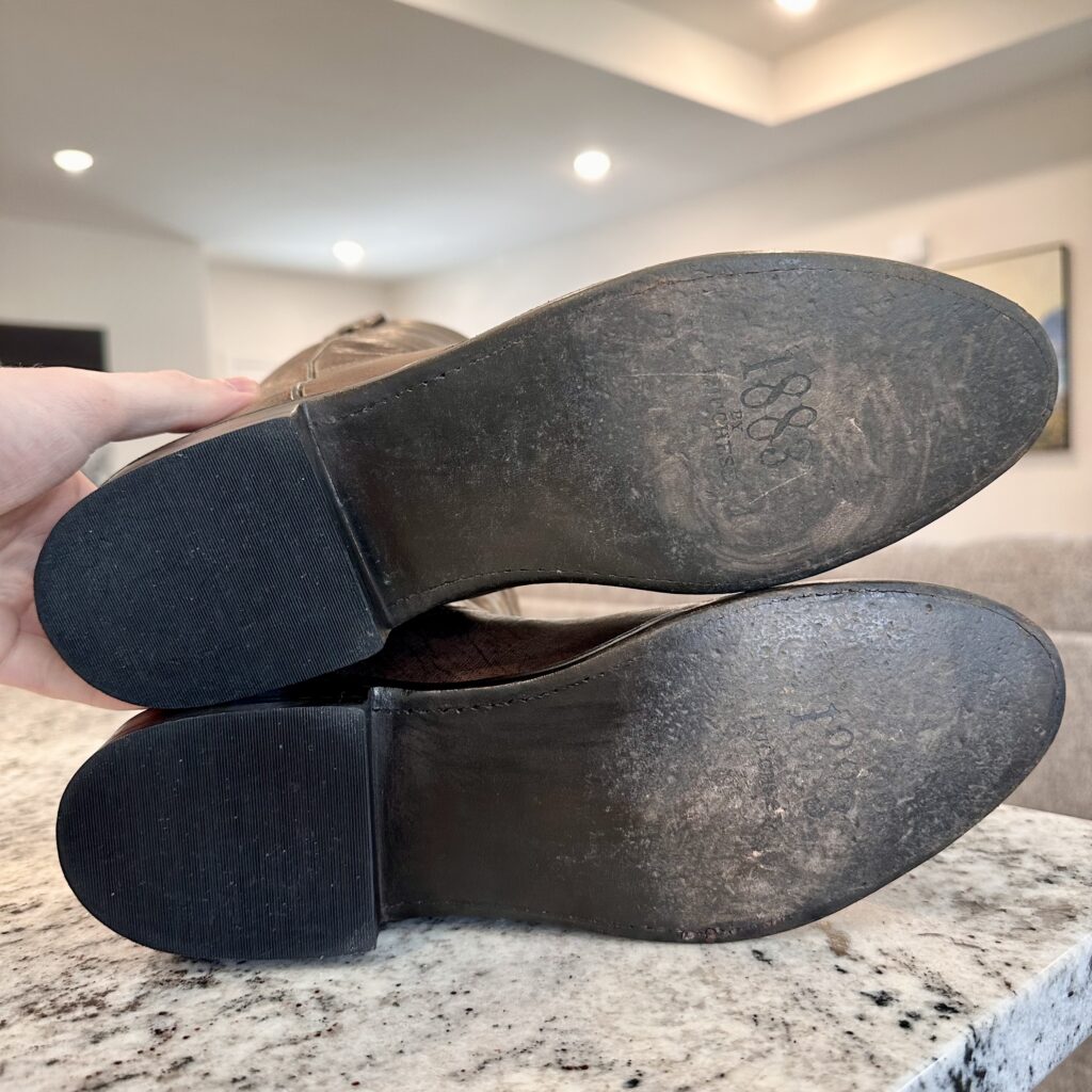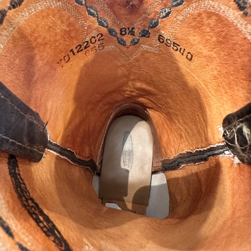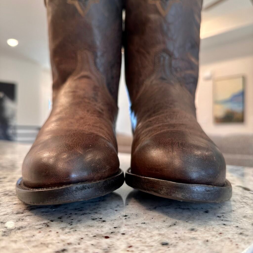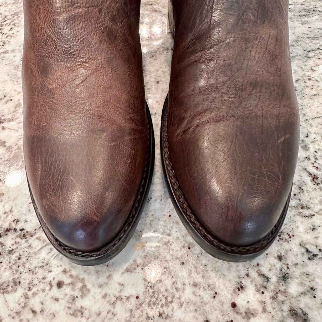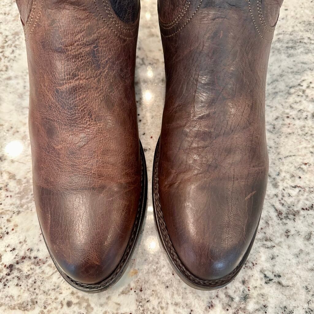 Type: These are men’s size 8.5 D Lucchese 2000 Goat Ropers in color brown. Lucchese 2000 T series. These boots are made with goat leather uppers. Roper heel with rounded toe. Leather outsoles with rubber heel caps. There is accent stitching near the collar of the shaft. Lucchese style T0122.C2. The goat leather is in good condition, but does have some gentle scuffing near the toes and heels from use.