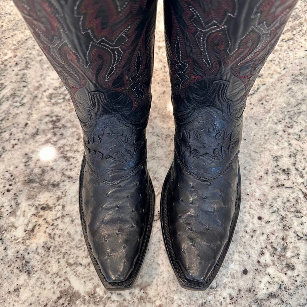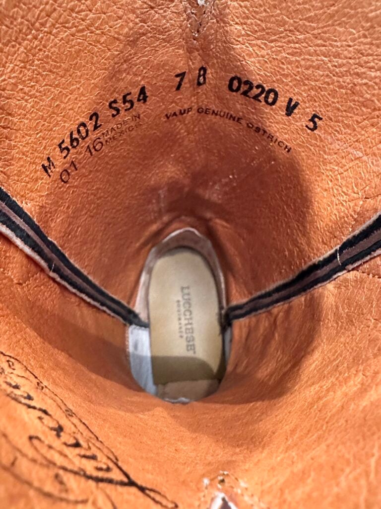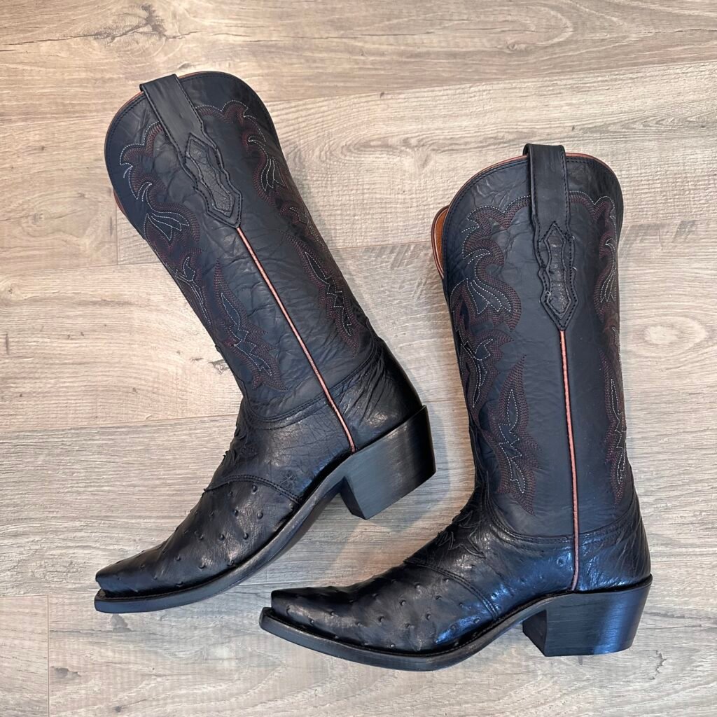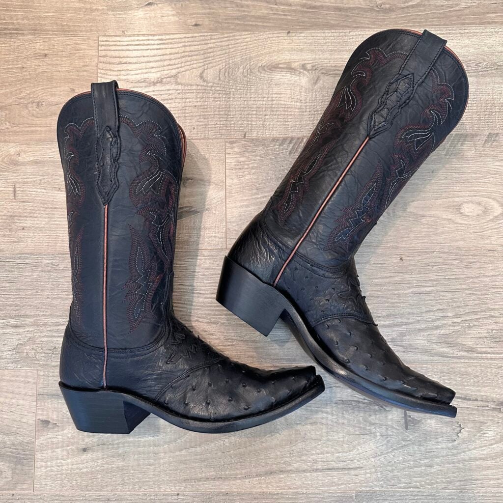 Type: These are women’s size 7 B Lucchese “Augusta” Full Quill Ostrich boots in colorway black. Lucchese style M5602.S54. These boots have a full quill ostrich foot with decorative saddle vamp cutout. There are ostrich leather accents on the shaft pull tabs. Calfskin leather shafts with contrast stitching and contrast side piping. Leather outsoles with rubber heel caps. These boots have a Lucchese S5 toe with 4 heel. The S5 is their snip toe and the 4 is their traditional cowboy heel. These boots have seen very little use and only have gentle signs of wear.