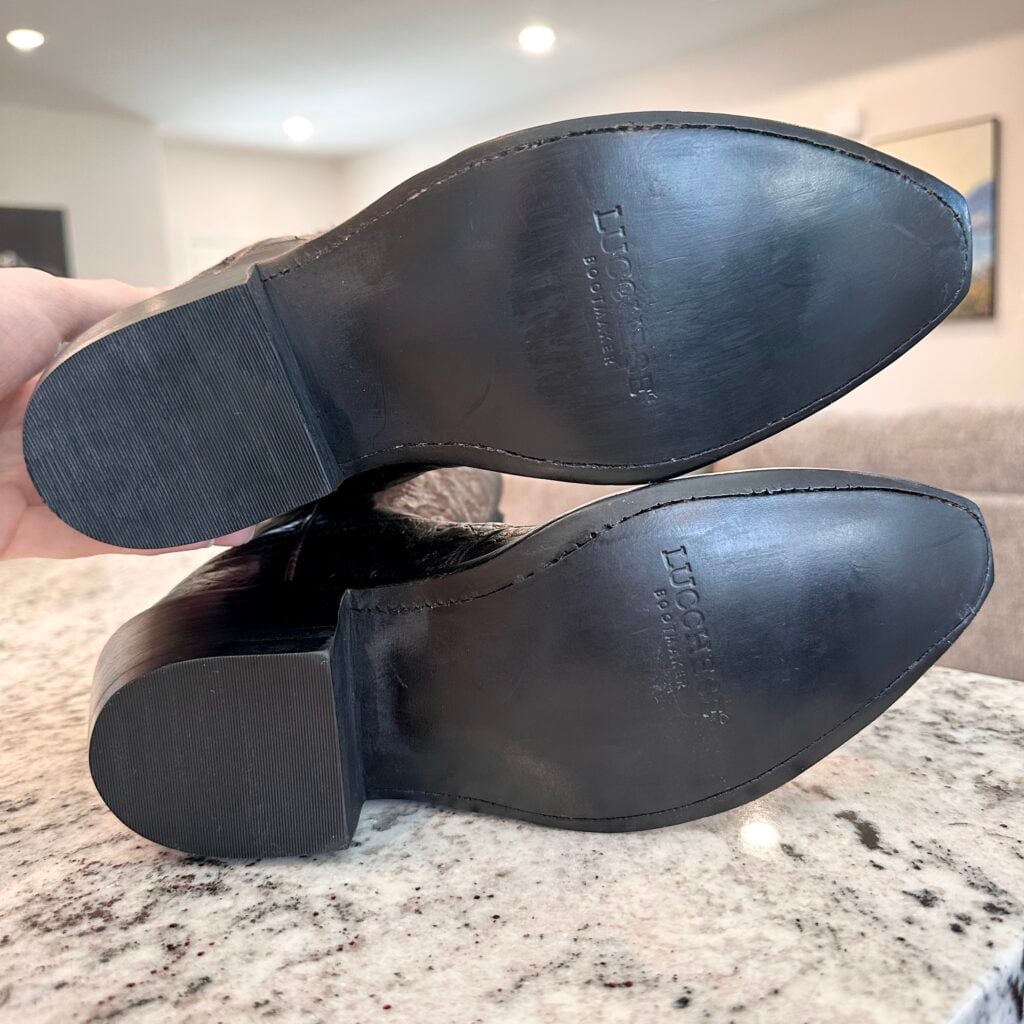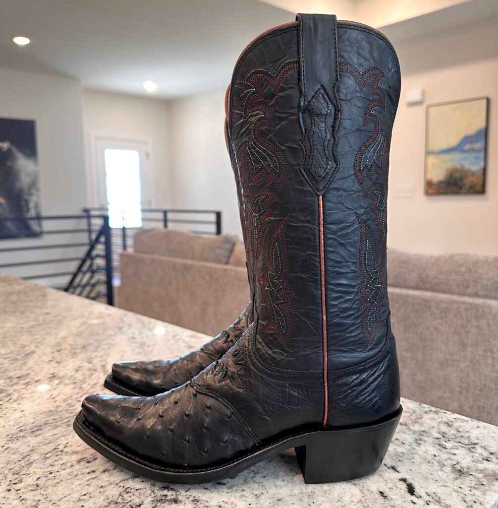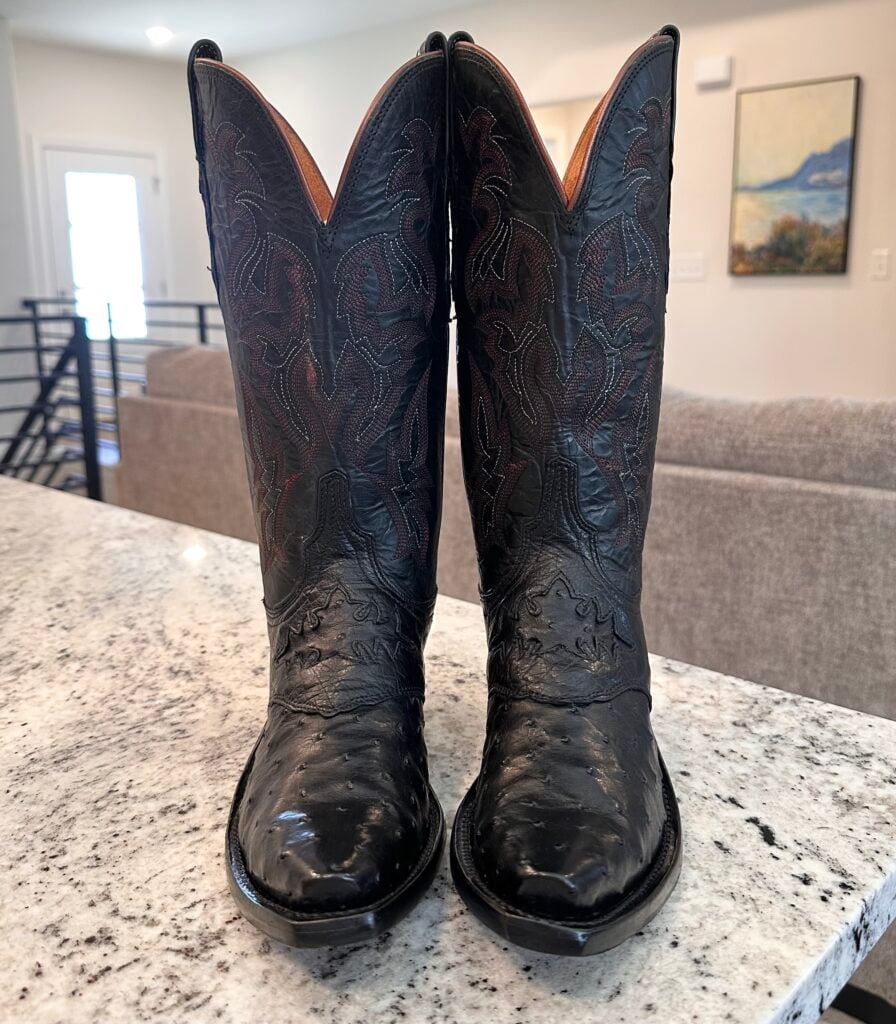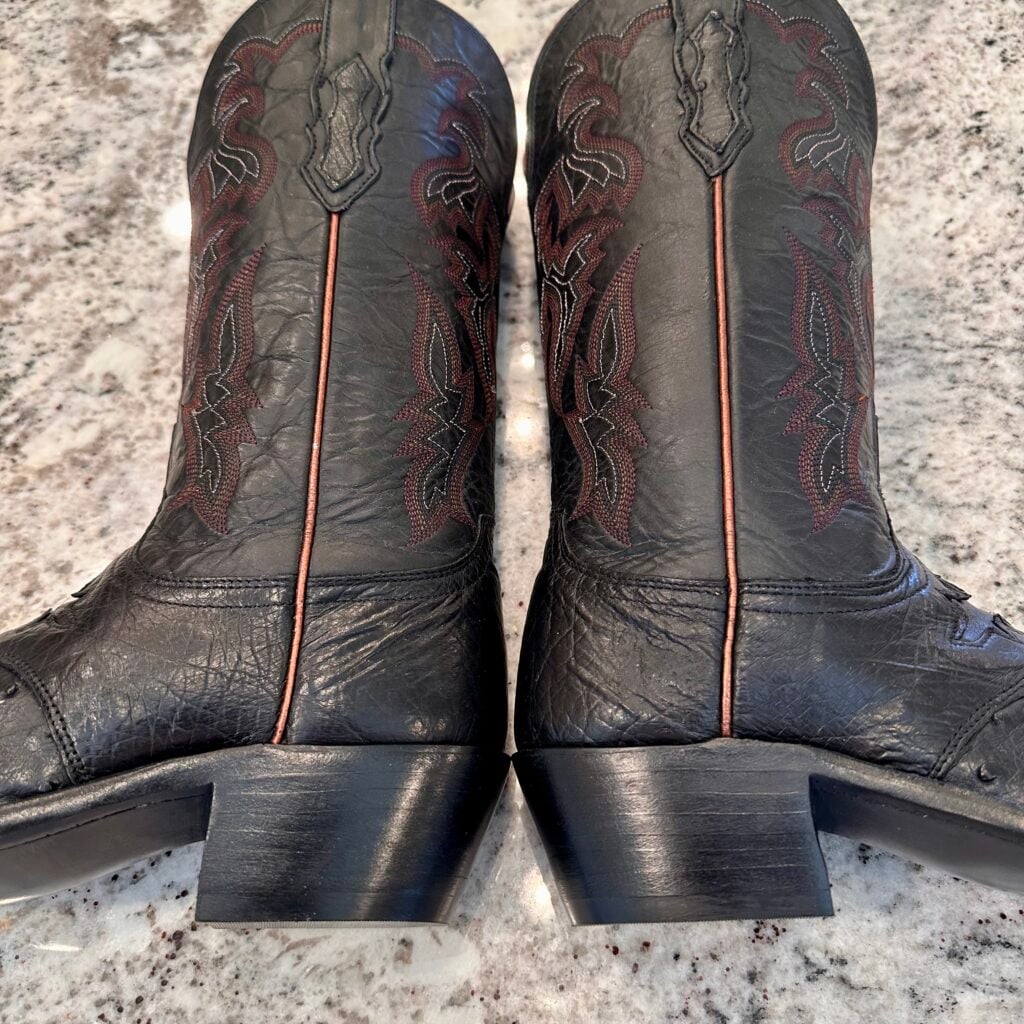Type: These are women’s size 7 B Lucchese “Augusta” Full Quill Ostrich boots in colorway black. Lucchese style M5602.S54. These boots have a full quill ostrich foot with decorative saddle vamp cutout. There are ostrich leather accents on the shaft pull tabs. Calfskin leather shafts with contrast stitching and contrast side piping. Leather outsoles with rubber heel caps. These boots have a Lucchese S5 toe with 4 heel. The S5 is their snip toe and the 4 is their traditional cowboy heel. These boots have seen very little use and only have gentle signs of wear.