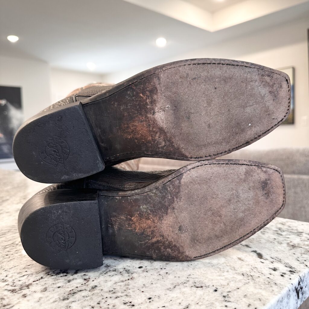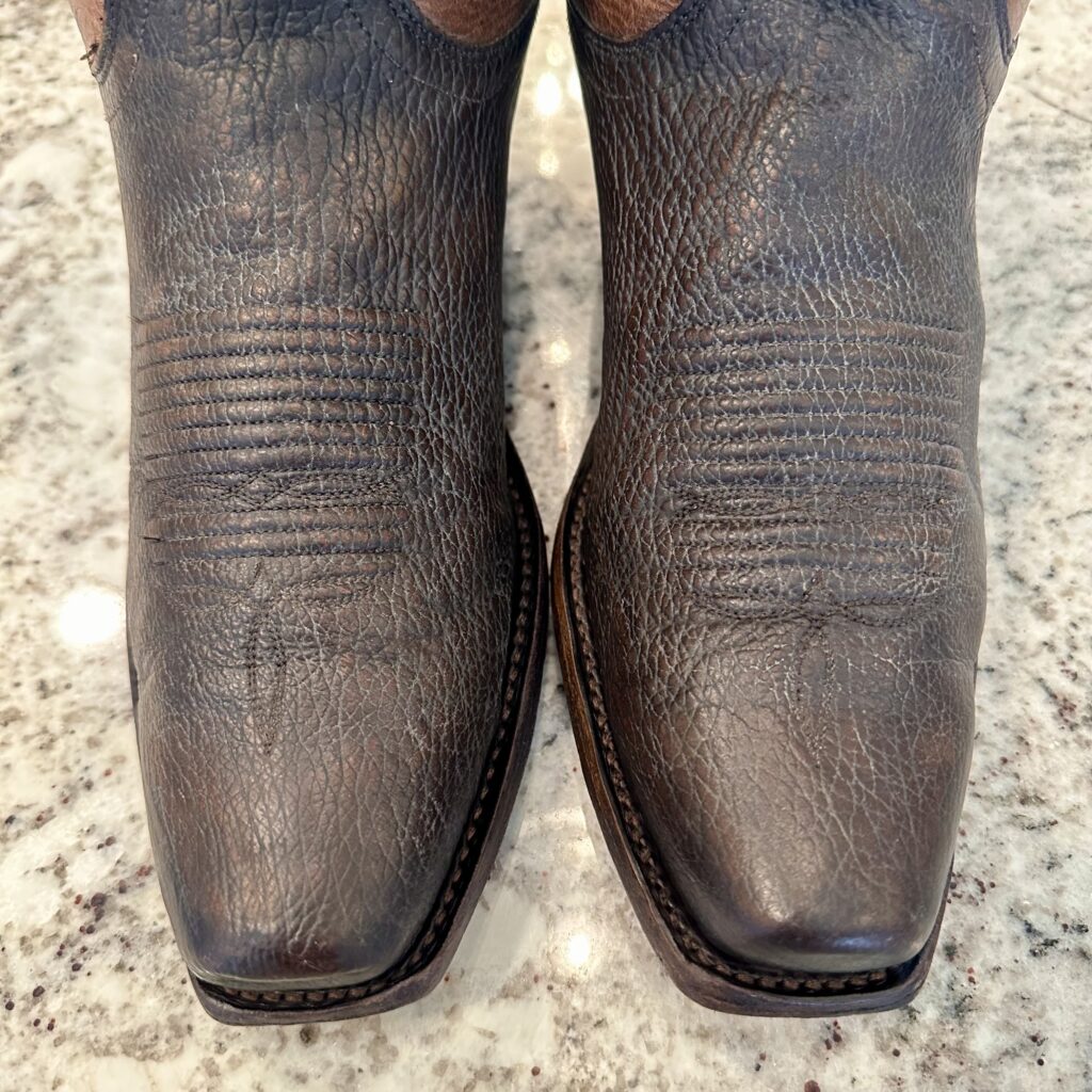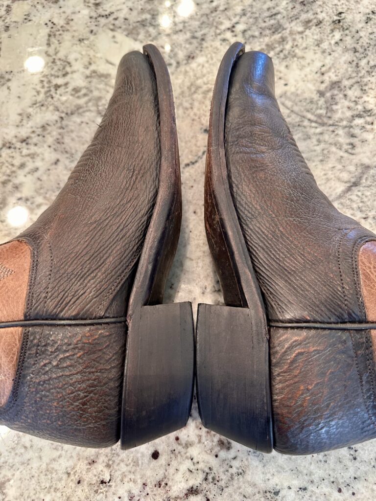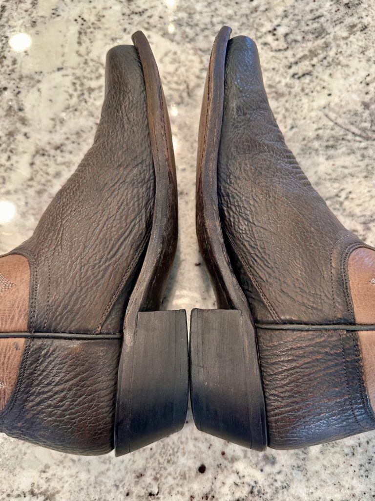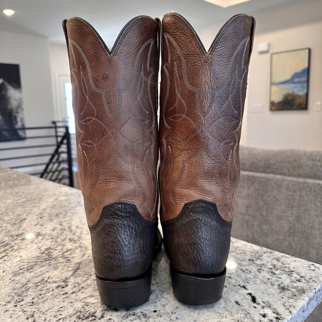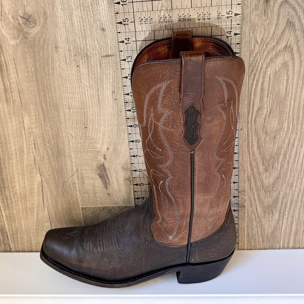 Type: These are men’s size 9 D Lucchese 1883 ‘Carl’ Chocolate Sanded Shark Boots style M3105. These boots have a sanded shark vamp (chocolate brown) with a sanded calfskin leather shaft (tan brown). There are shark leather accents on the shaft pull tabs. These boots have a narrow square toe. Leather outsoles.