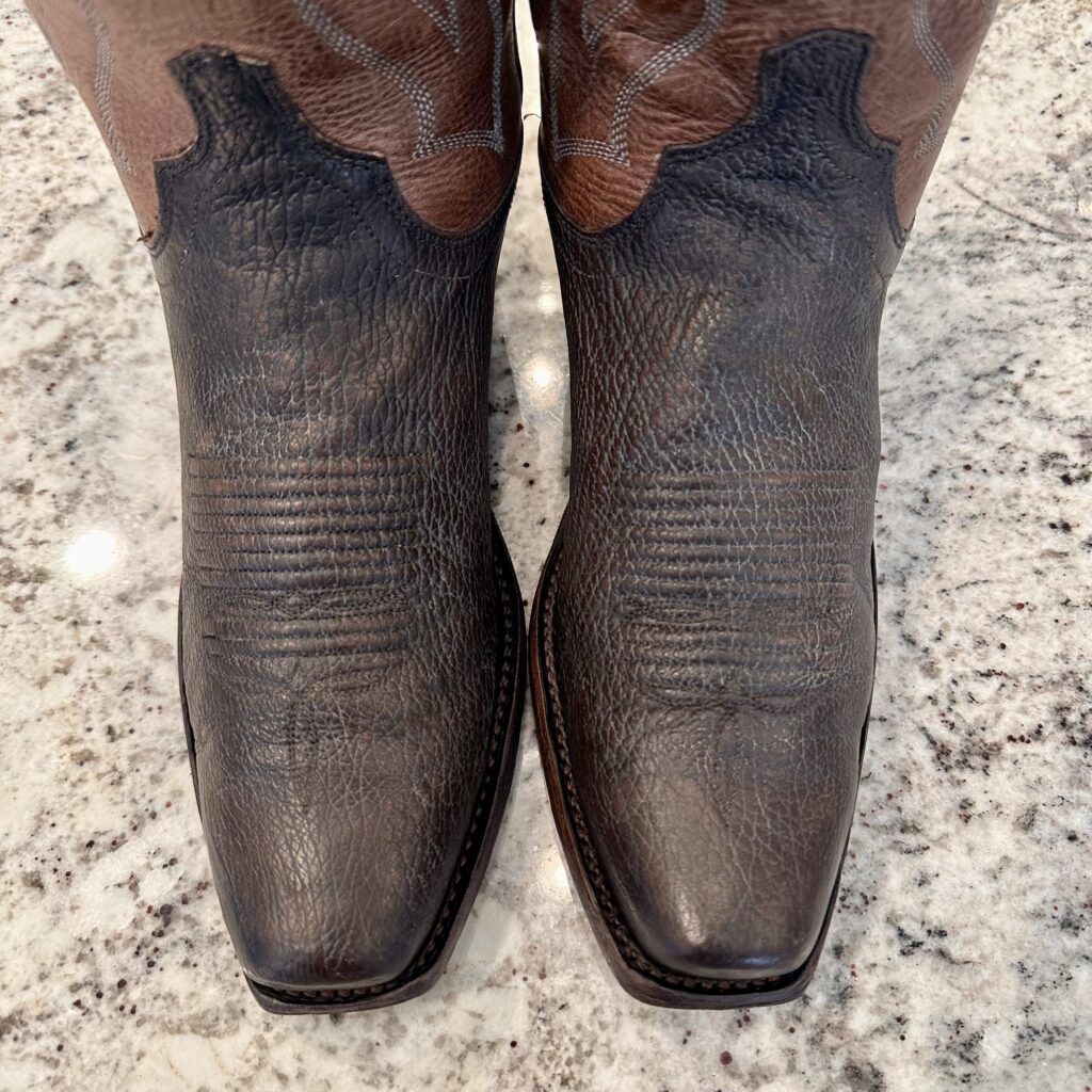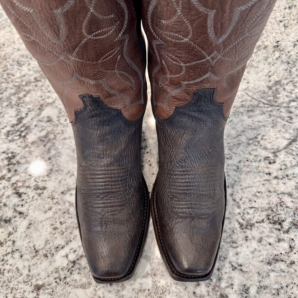 Type: These are men’s size 9 D Lucchese 1883 ‘Carl’ Chocolate Sanded Shark Boots style M3105. These boots have a sanded shark vamp (chocolate brown) with a sanded calfskin leather shaft (tan brown). There are shark leather accents on the shaft pull tabs. These boots have a narrow square toe. Leather outsoles.