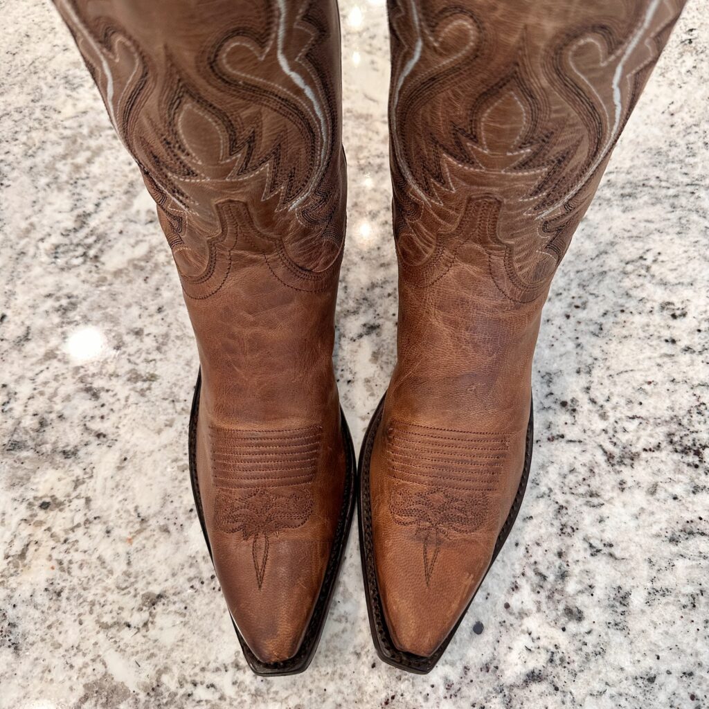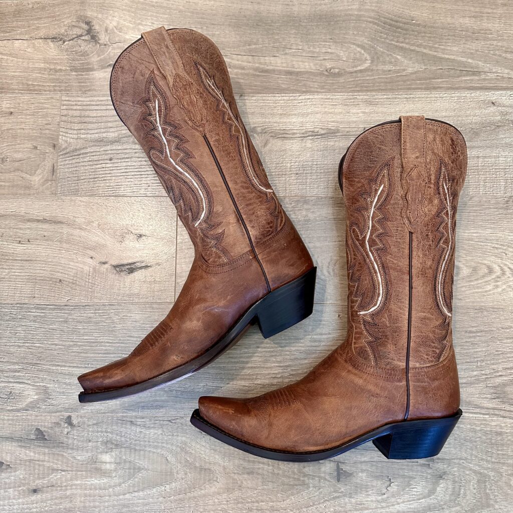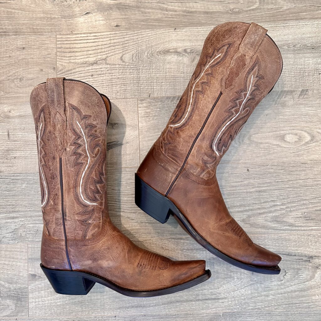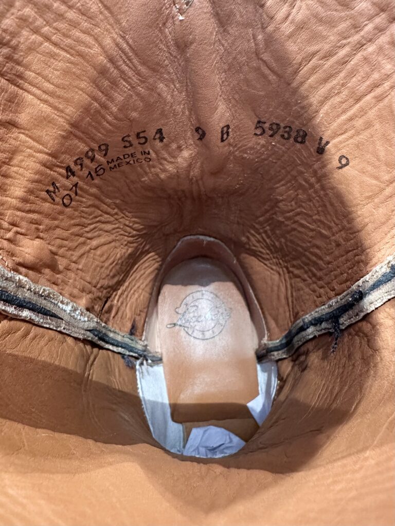 Type: These are size 9 B Lucchese Women’s “Cassidy” Boots style M4999.S54. These boots have a tan colored Mad Dog Goat shaft and foot. There is decorative stitching on the shaft and toe bug stitching on the vamp. Leather lining and leather outsoles. These boots have a Lucchese S5 toe and 4 heel. The S5 toe is their snip toe and the 4 heel is their traditional cowboy heel. These boots are in good condition with gentle scuffing near toe and heel.