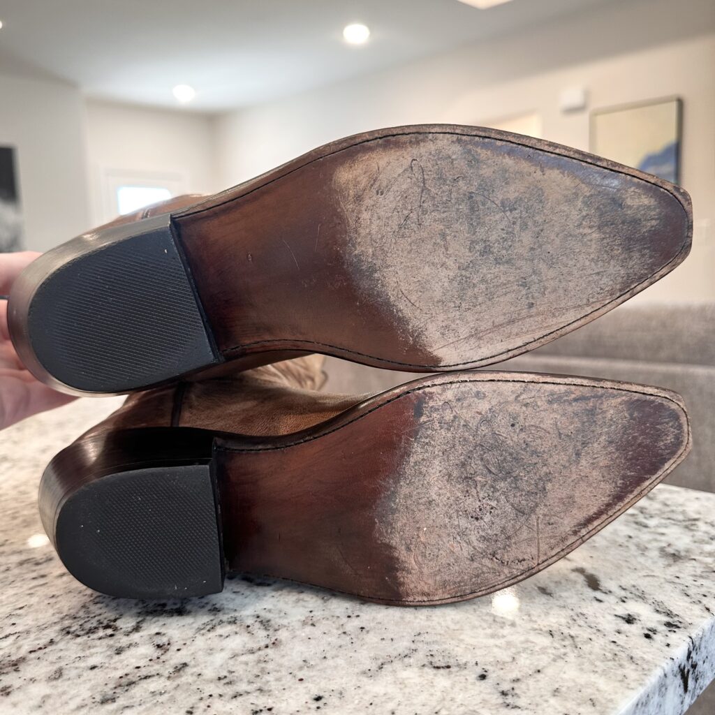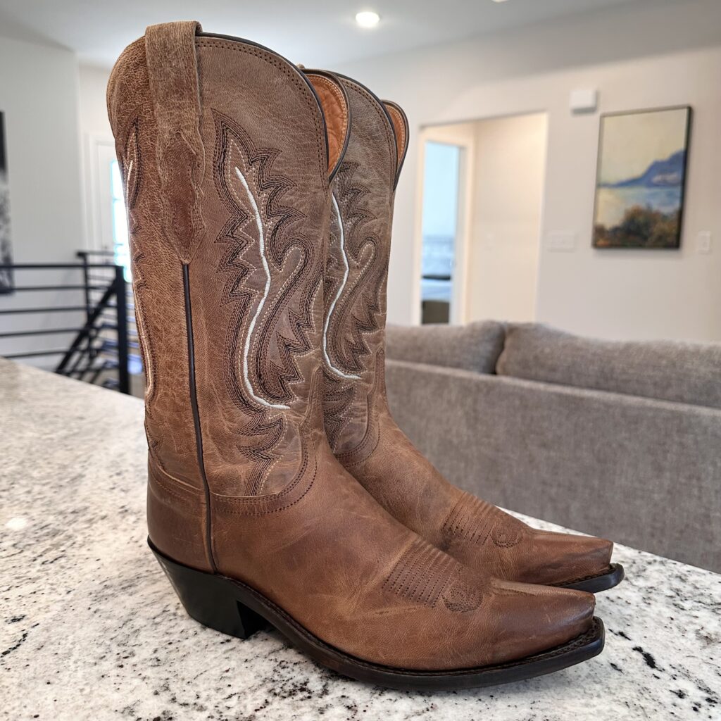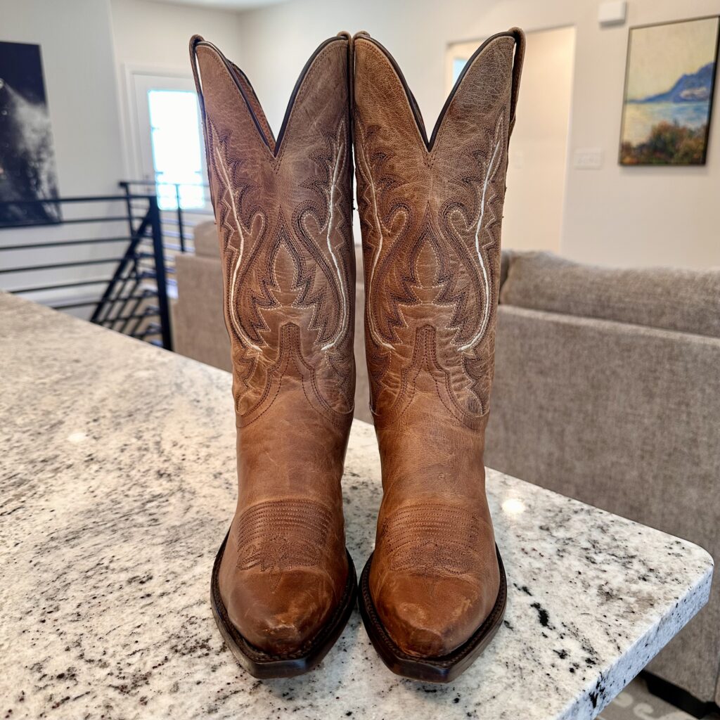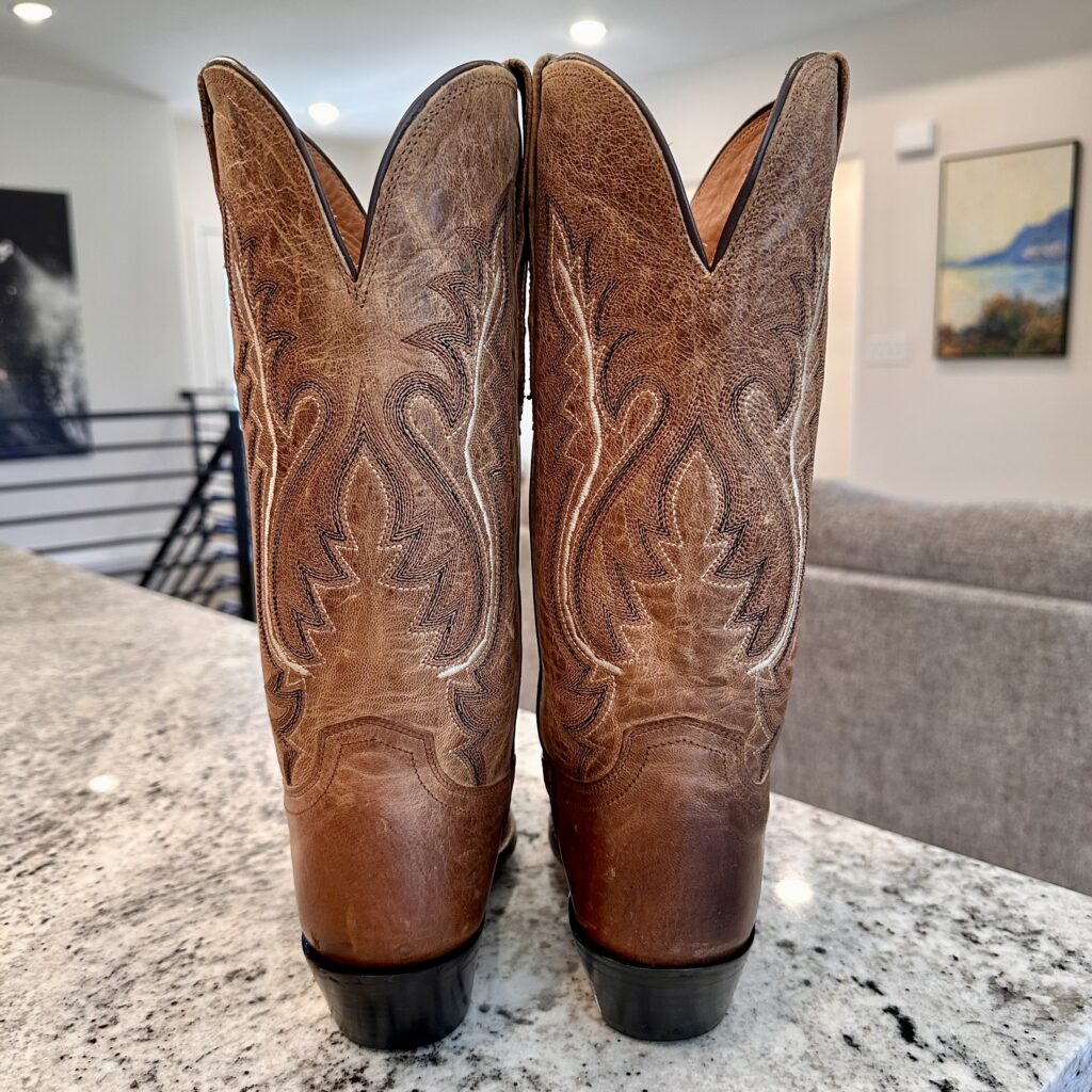 Type: These are size 9 B Lucchese Women’s “Cassidy” Boots style M4999.S54. These boots have a tan colored Mad Dog Goat shaft and foot. There is decorative stitching on the shaft and toe bug stitching on the vamp. Leather lining and leather outsoles. These boots have a Lucchese S5 toe and 4 heel. The S5 toe is their snip toe and the 4 heel is their traditional cowboy heel. These boots are in good condition with gentle scuffing near toe and heel.