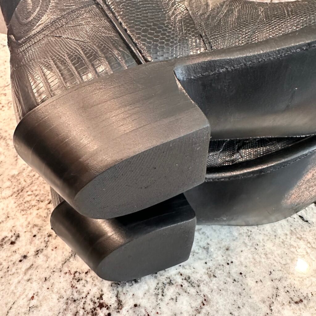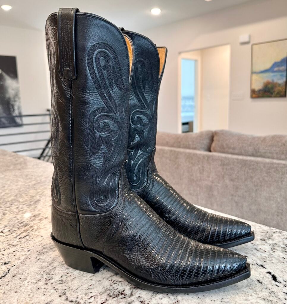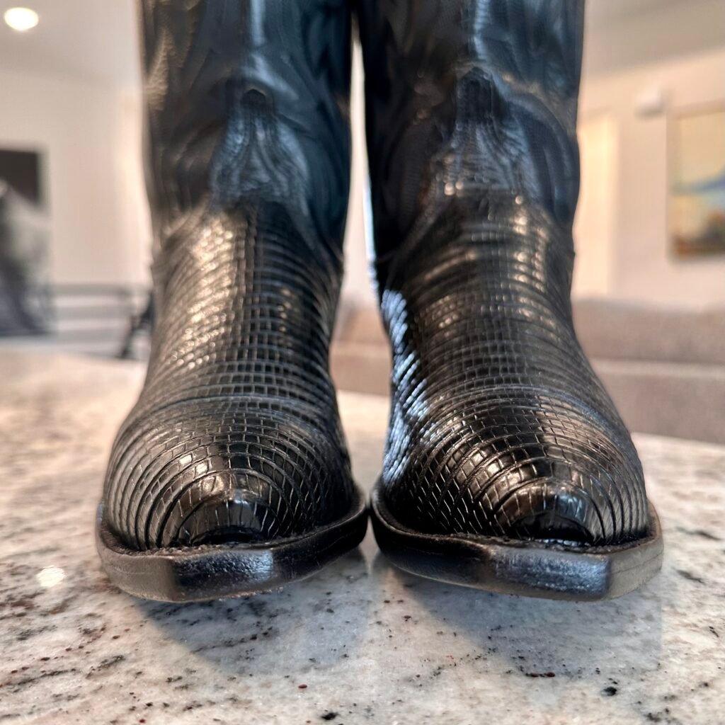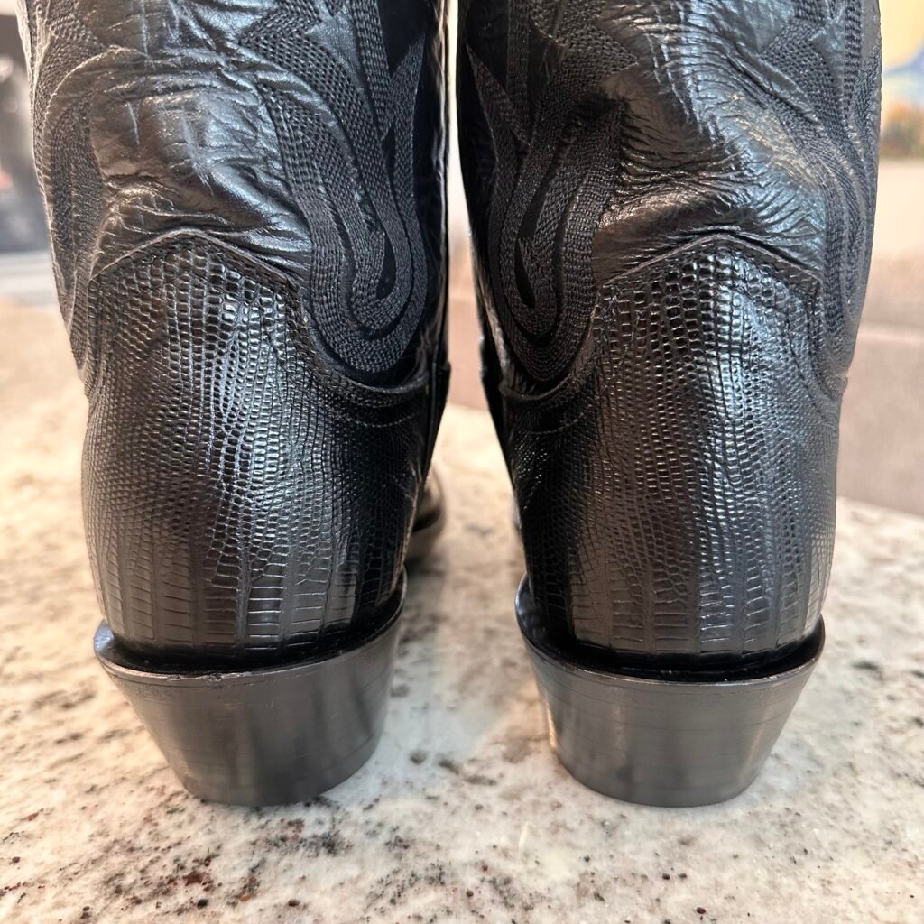 Type: These are women’s size 8.5 B Lucchese 1883 Lizard Boots in color black. Lizard Leather vamp and counter. Pointed toe design with leather outsoles. Decorative shaft embroidery. Lucchese style N4012.44. Made in USA. Lizard leather is in good condition with no cracks or tears.