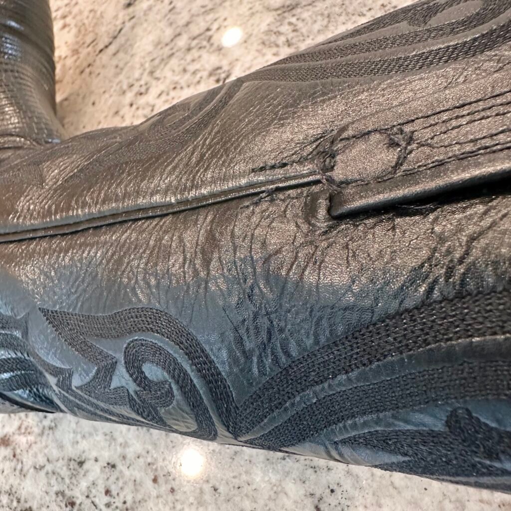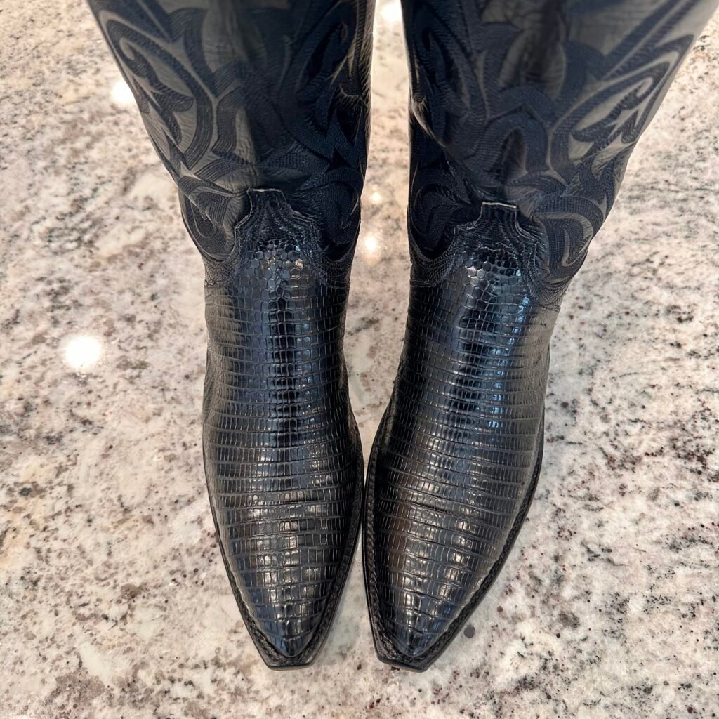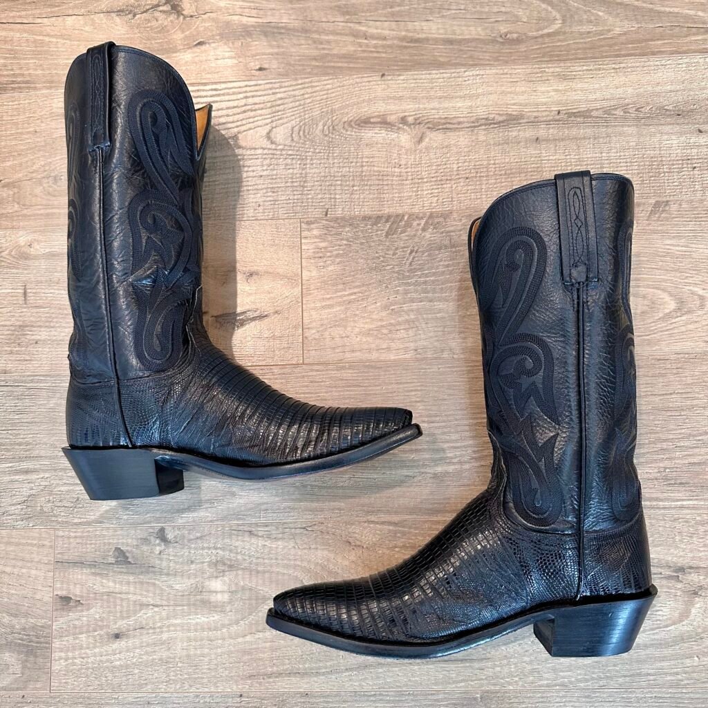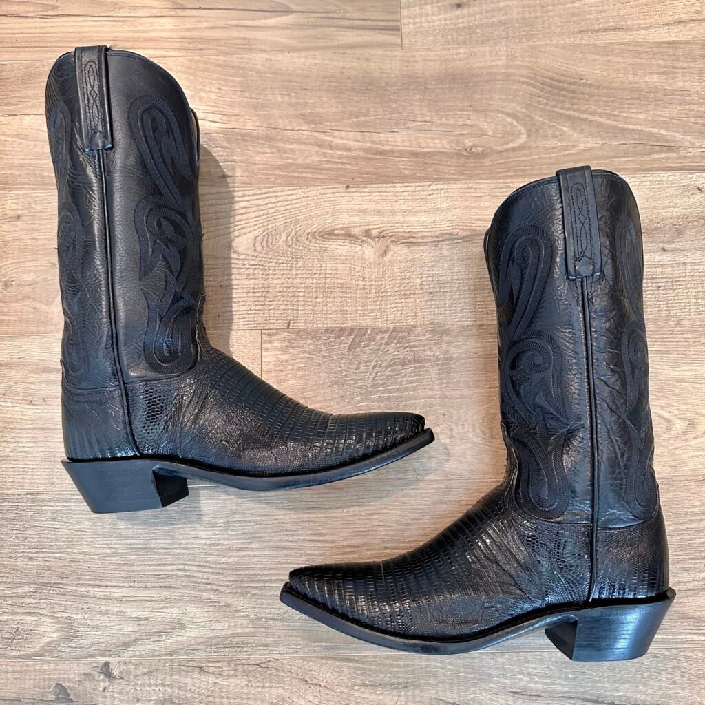 Type: These are women’s size 8.5 B Lucchese 1883 Lizard Boots in color black. Lizard Leather vamp and counter. Pointed toe design with leather outsoles. Decorative shaft embroidery. Lucchese style N4012.44. Made in USA. Lizard leather is in good condition with no cracks or tears.