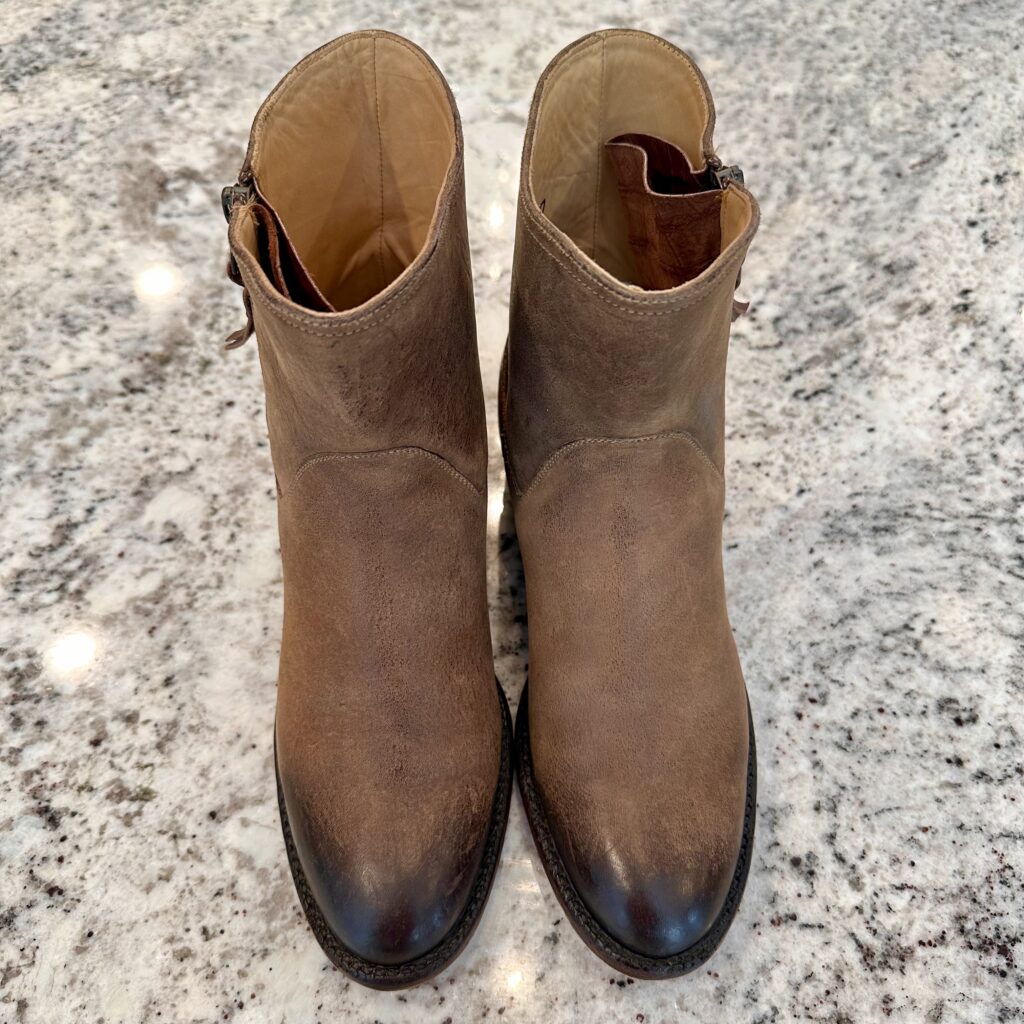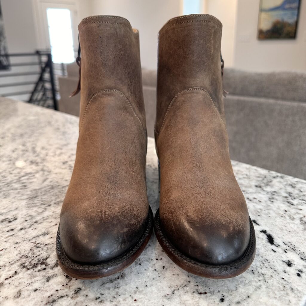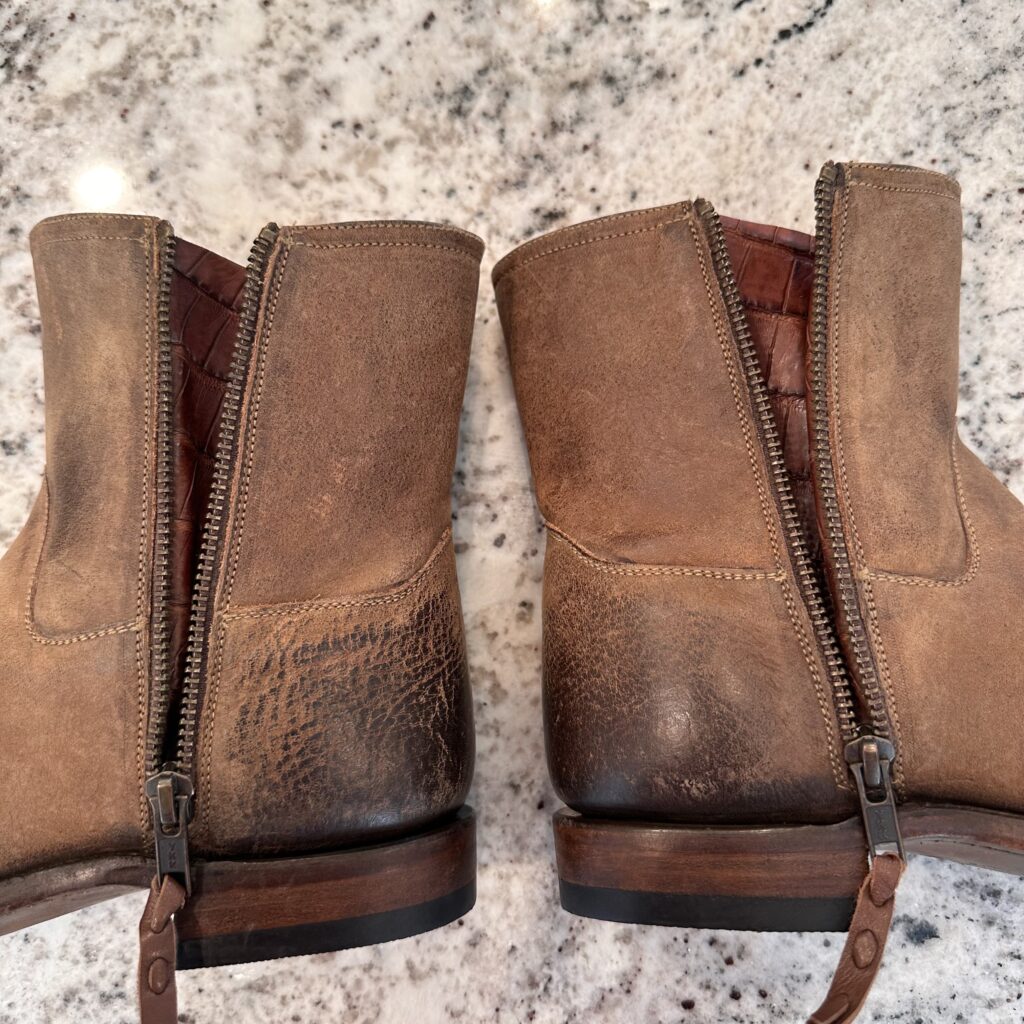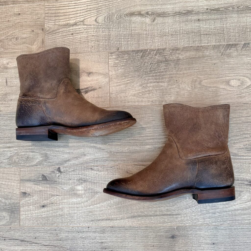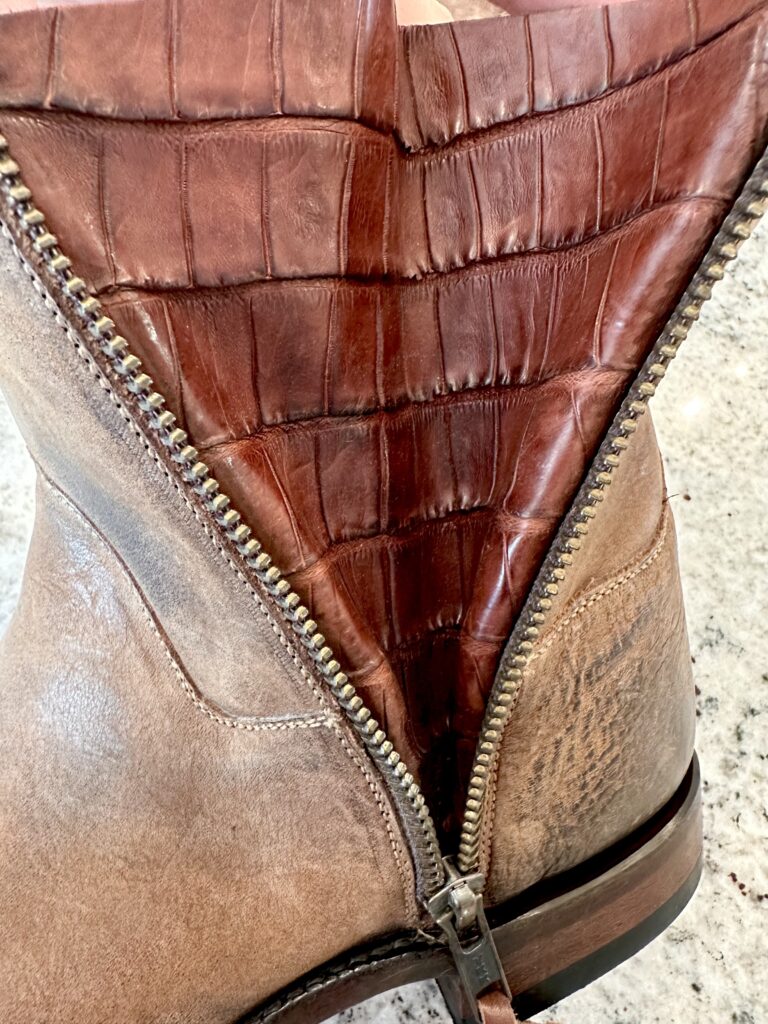 Type: These are women’s size 6.5 B Lucchese side zip leather ankle boots. These boots have caiman leather inserts – the zipper gussets are made of caiman leather. Side zip (outer side), leather outsoles. Lucchese Style GY6202. Made in USA.