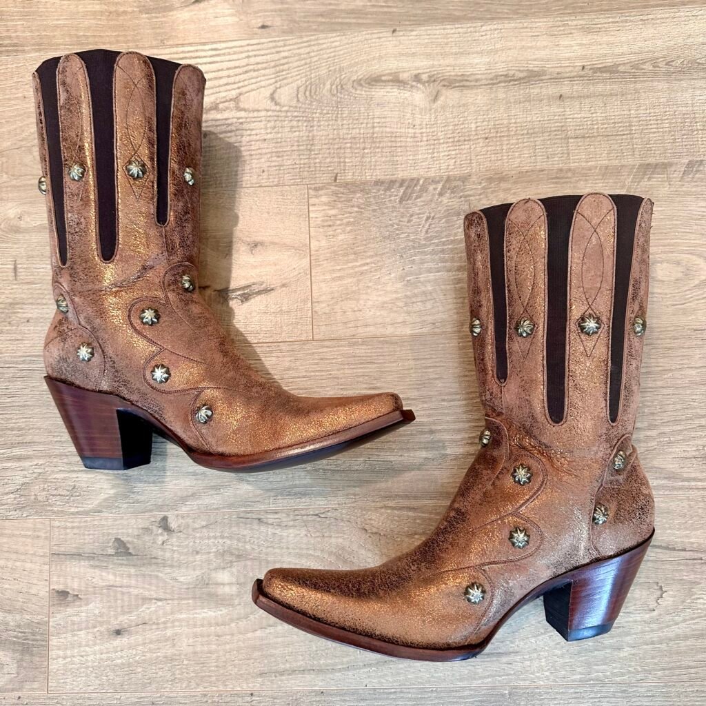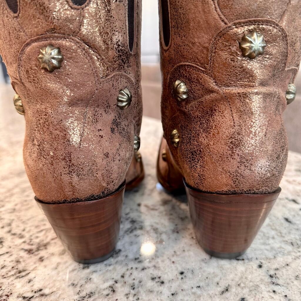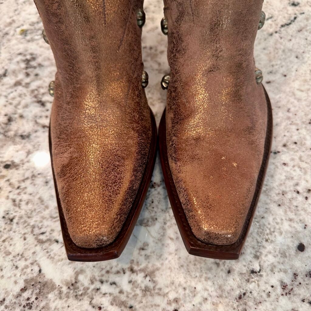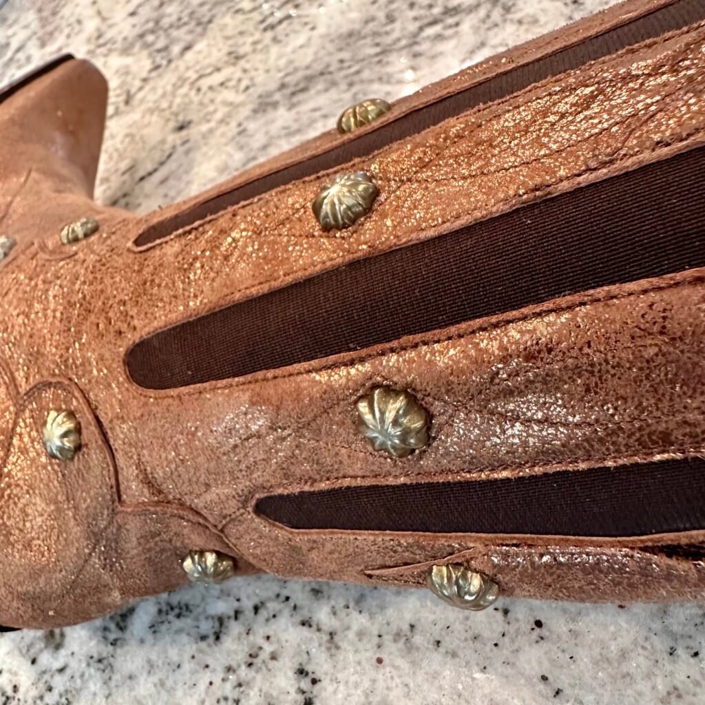 Type: These are women’s size 7.5 B Old Gringo Boots in color gold metallic. They have leather outsoles with rubber heel caps. Snip toe design. Leather upper with elastic paneling on the shaft. Studded accents on the vamp and shaft.