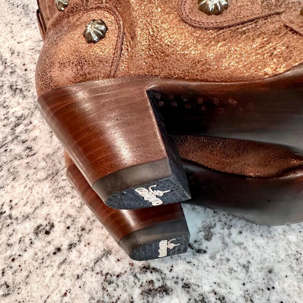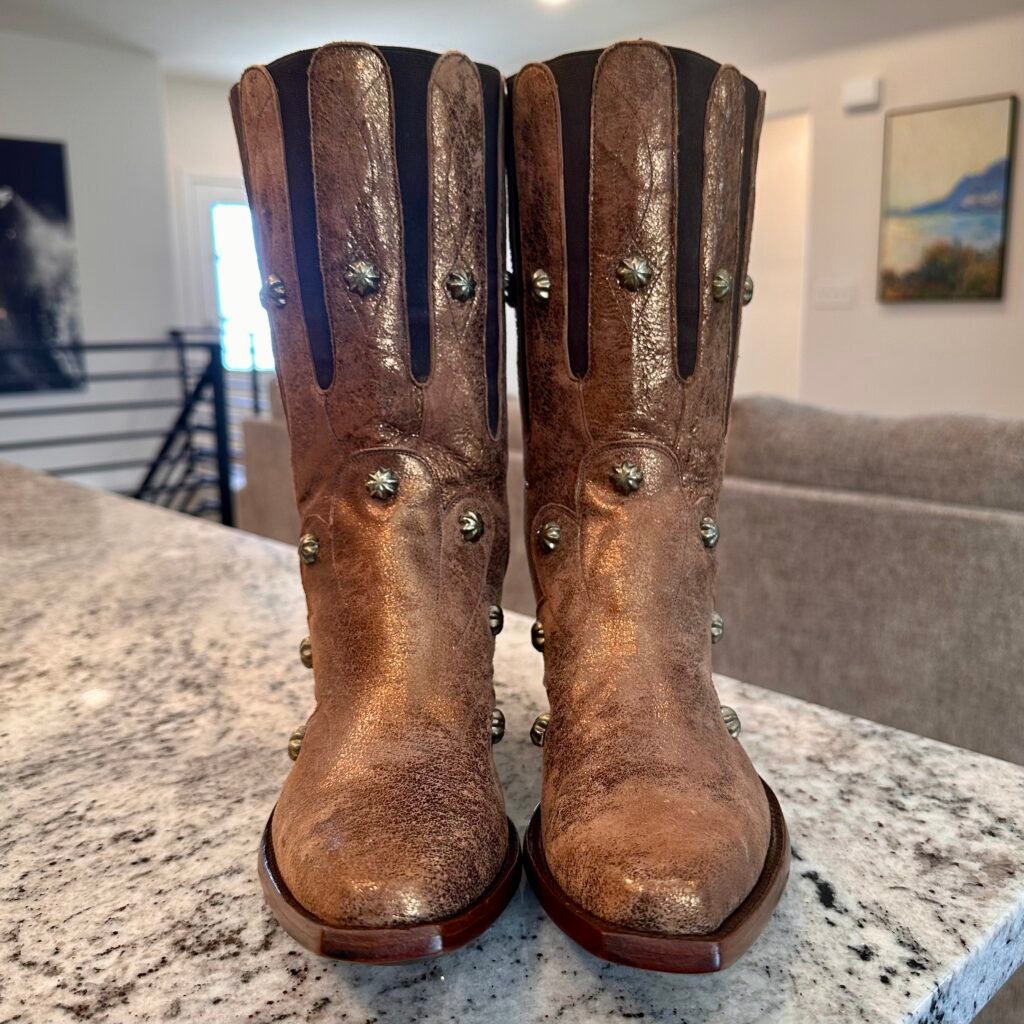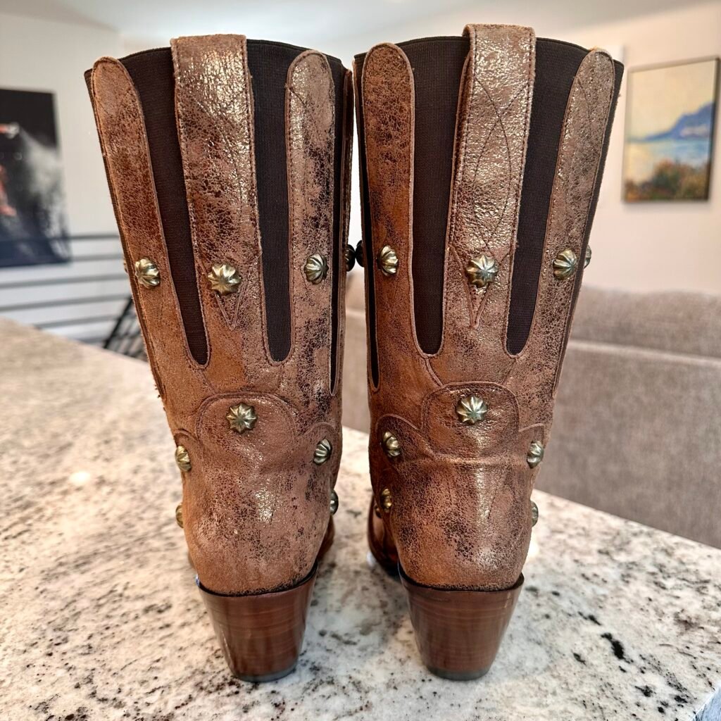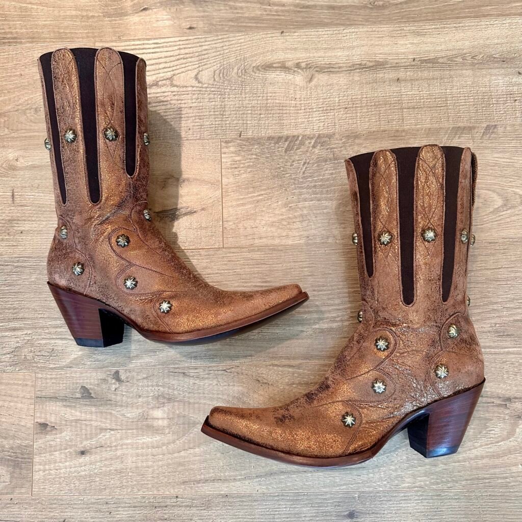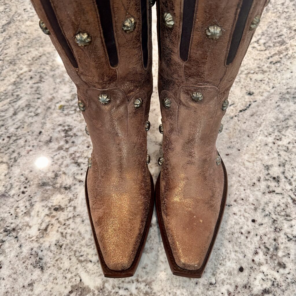 Type: These are women’s size 7.5 B Old Gringo Boots in color gold metallic. They have leather outsoles with rubber heel caps. Snip toe design. Leather upper with elastic paneling on the shaft. Studded accents on the vamp and shaft.