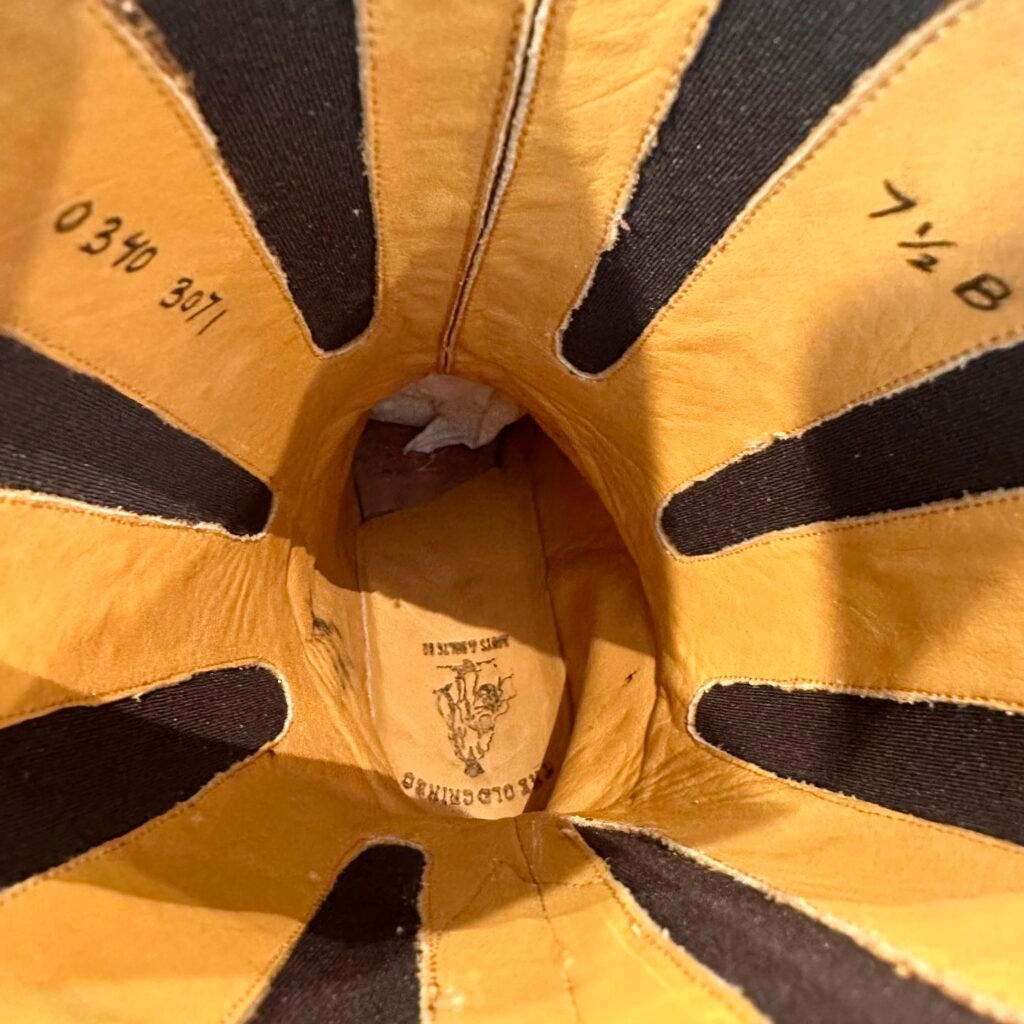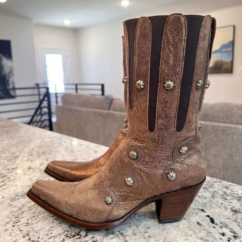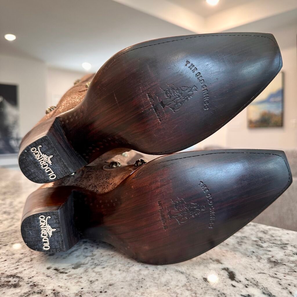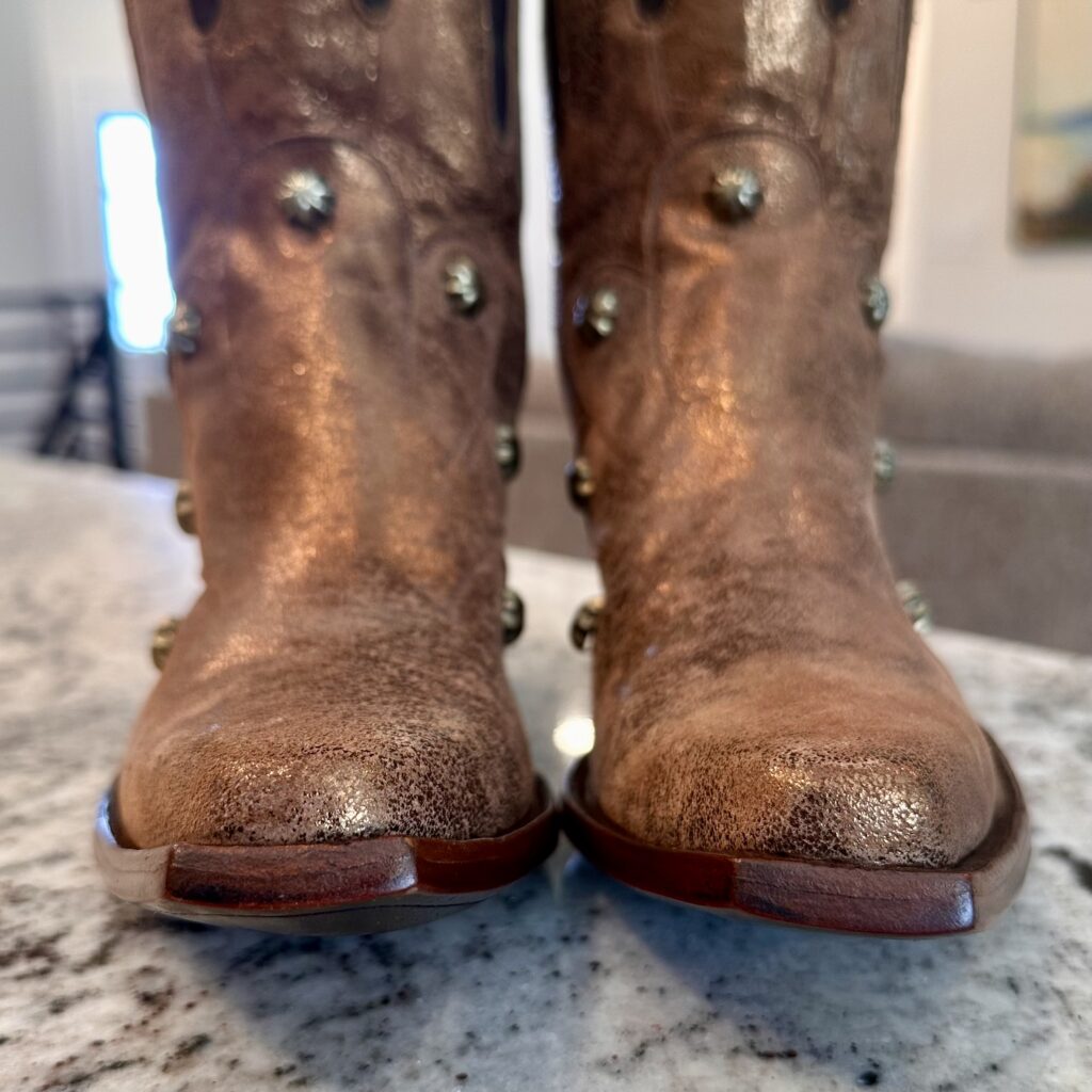 Type: These are women’s size 7.5 B Old Gringo Boots in color gold metallic. They have leather outsoles with rubber heel caps. Snip toe design. Leather upper with elastic paneling on the shaft. Studded accents on the vamp and shaft.