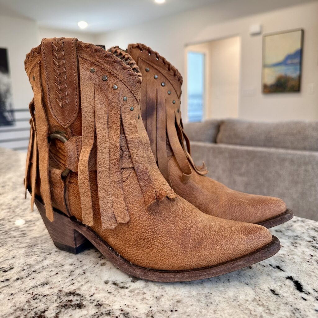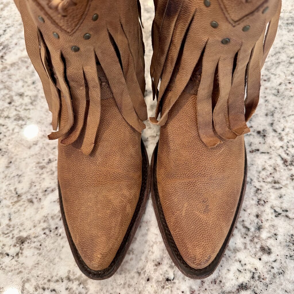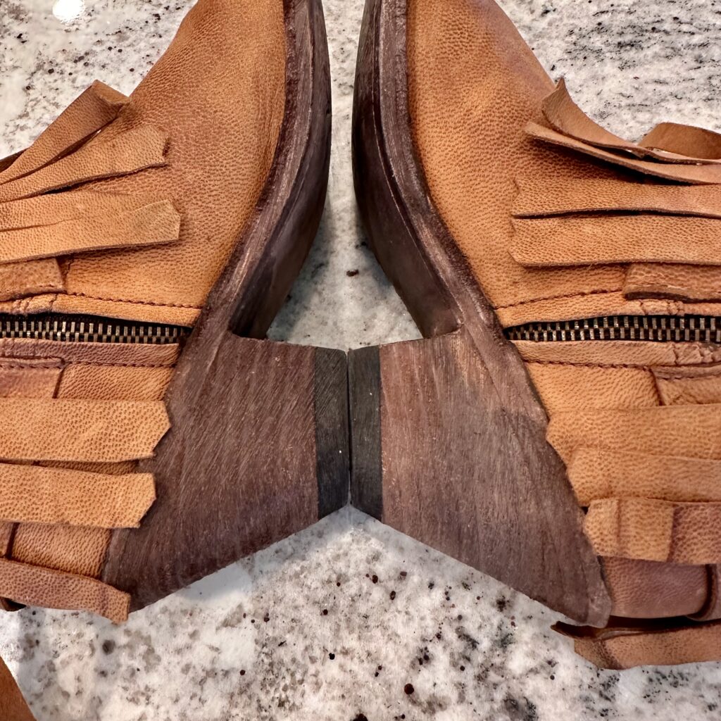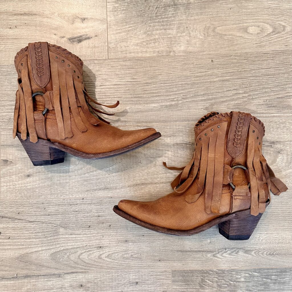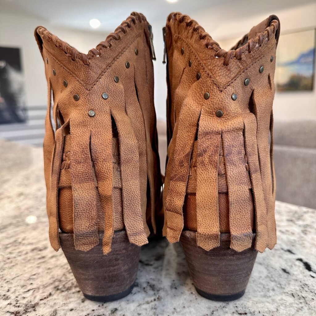 Type: These are women’s size 6.5 B Old Gringo Fringed Ankle Zip Up Boots. The zip closure is on the inner side of the boot. The outer side of the boot has a harness detail. There are metal stud accents near the collar. Leather outsoles.