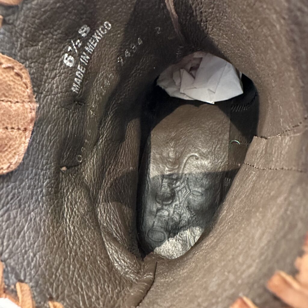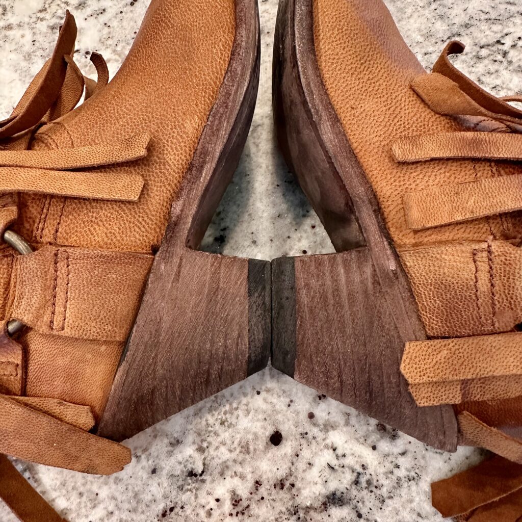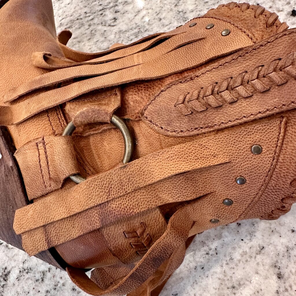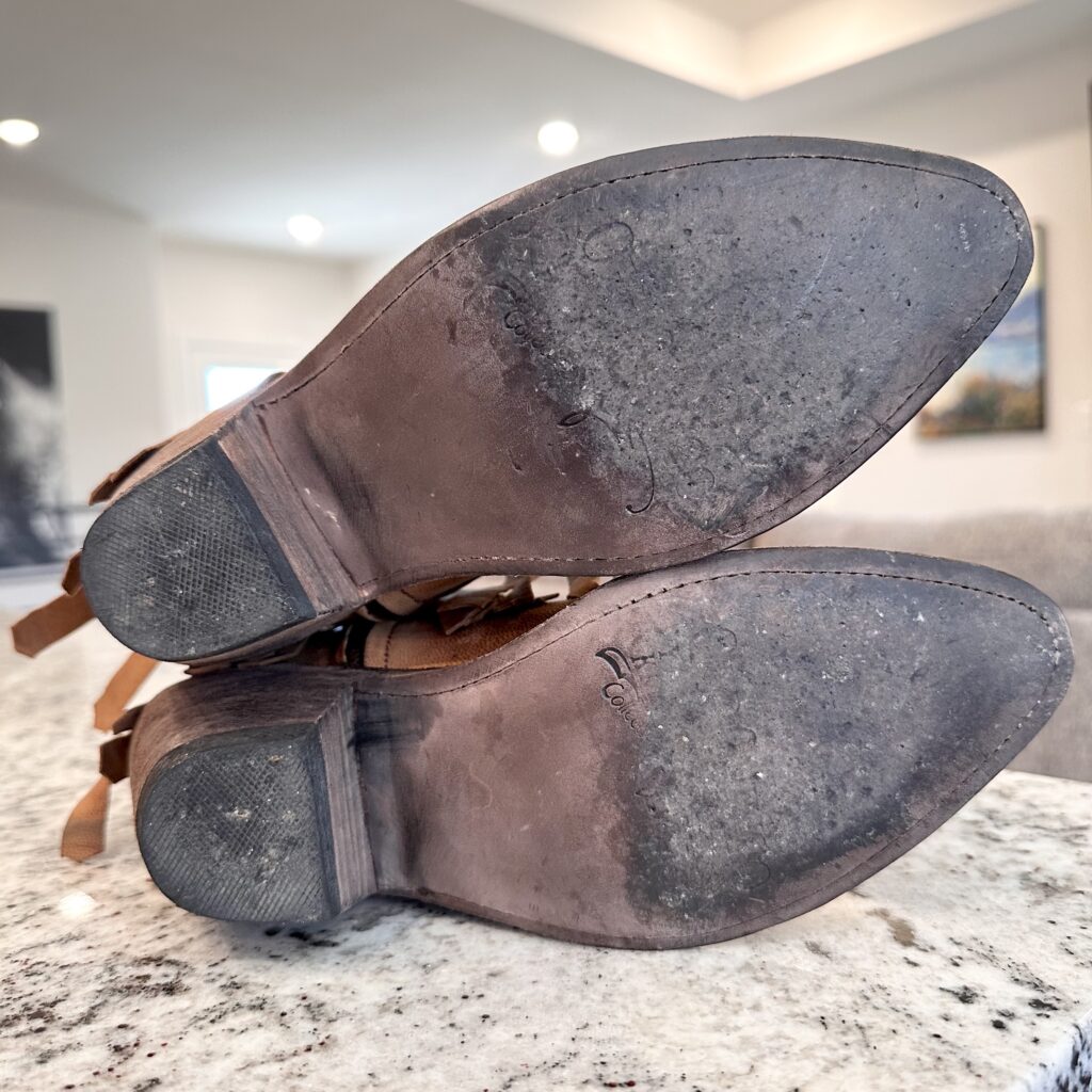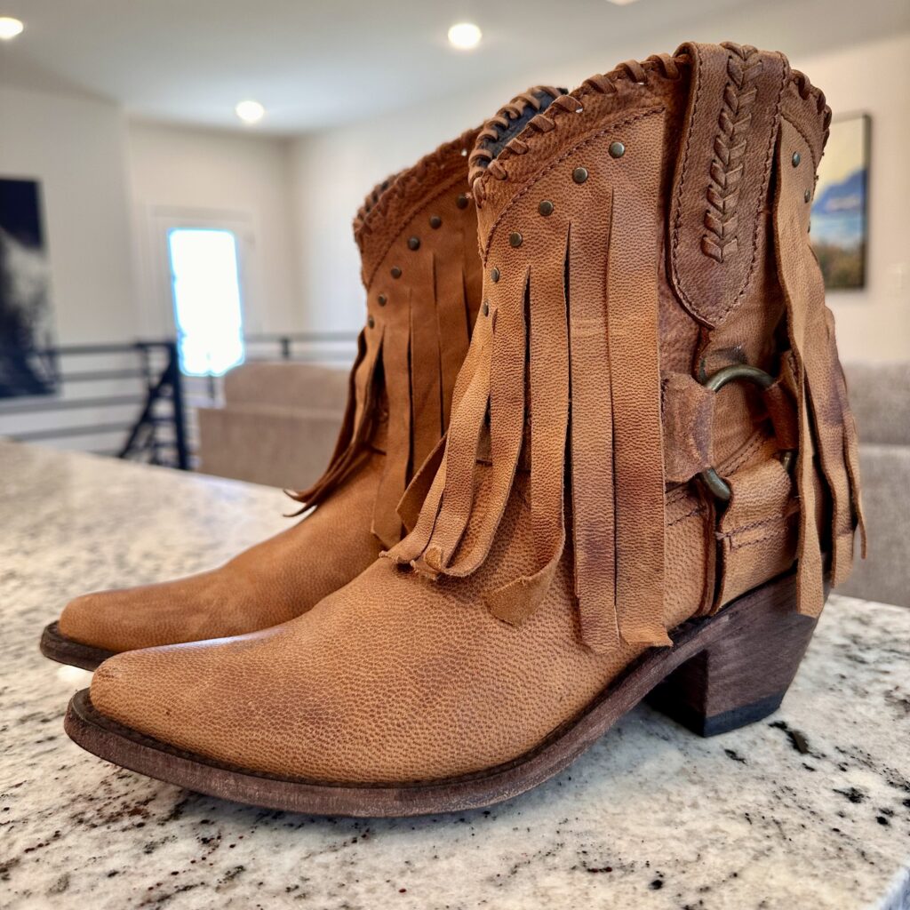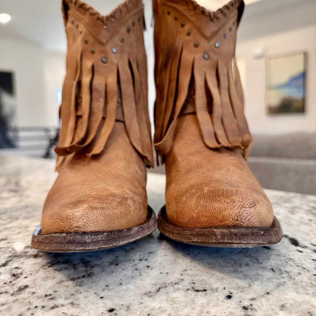 Type: These are women’s size 6.5 B Old Gringo Fringed Ankle Zip Up Boots. The zip closure is on the inner side of the boot. The outer side of the boot has a harness detail. There are metal stud accents near the collar. Leather outsoles.