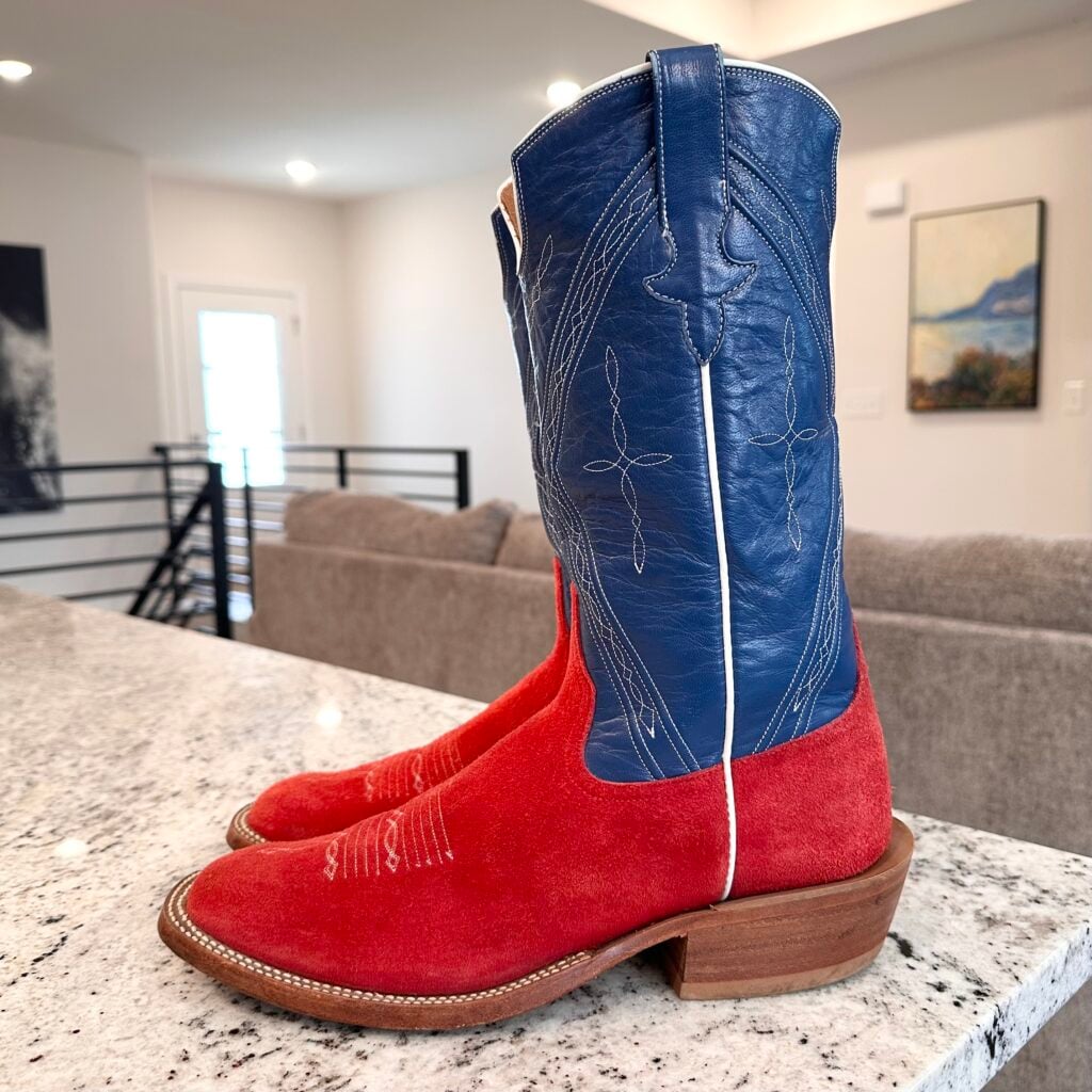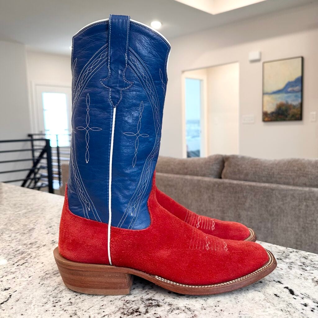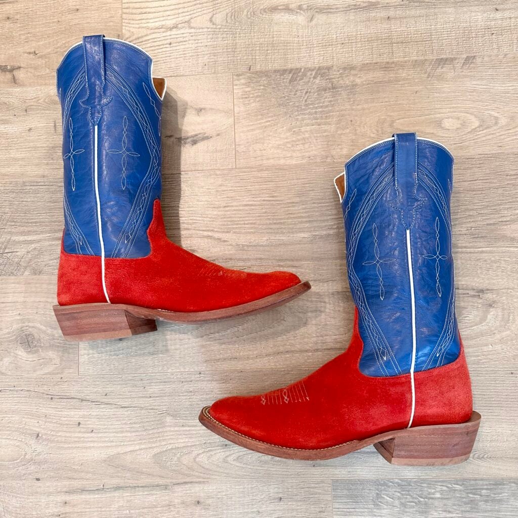 Type: These are men’s Rios of Mercedes Roughout Cowboy Boots. Reached out to Rios of Mercedes to confirm this type of boot. This was their reply to me: “This is a pair of Red Bulldozer (steerhide) with a Nova Kidskin top. Single pair custom design built back in 2018.” The vamp is red, and the shaft is blue. Made from roughout steerhide leather. The shaft is made from blue Nova kidskin leather. Made in the USA, in Texas. Toe bug stitching. These boots are in good condition. 102027