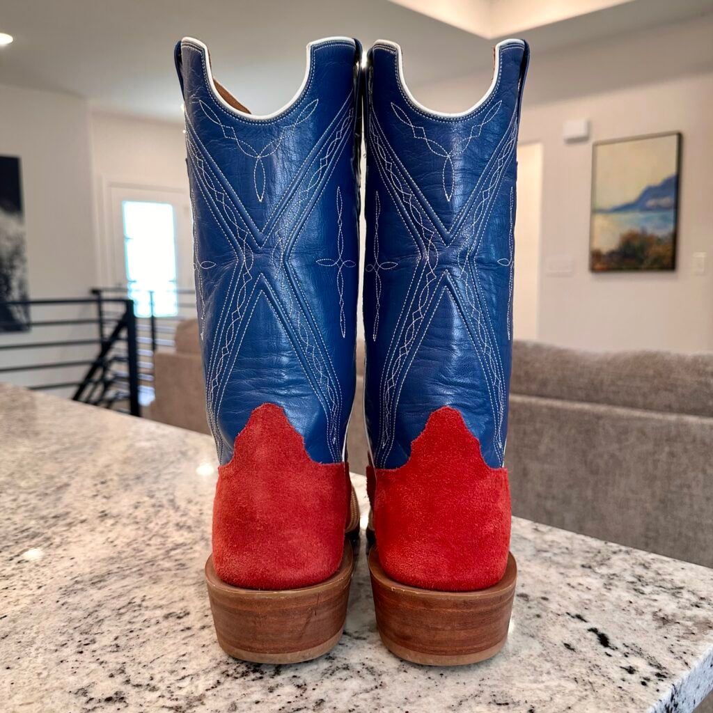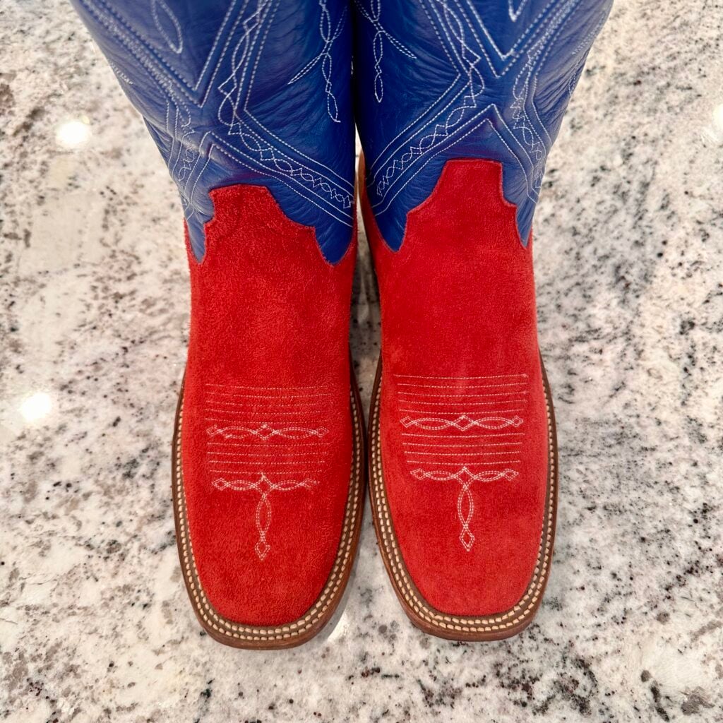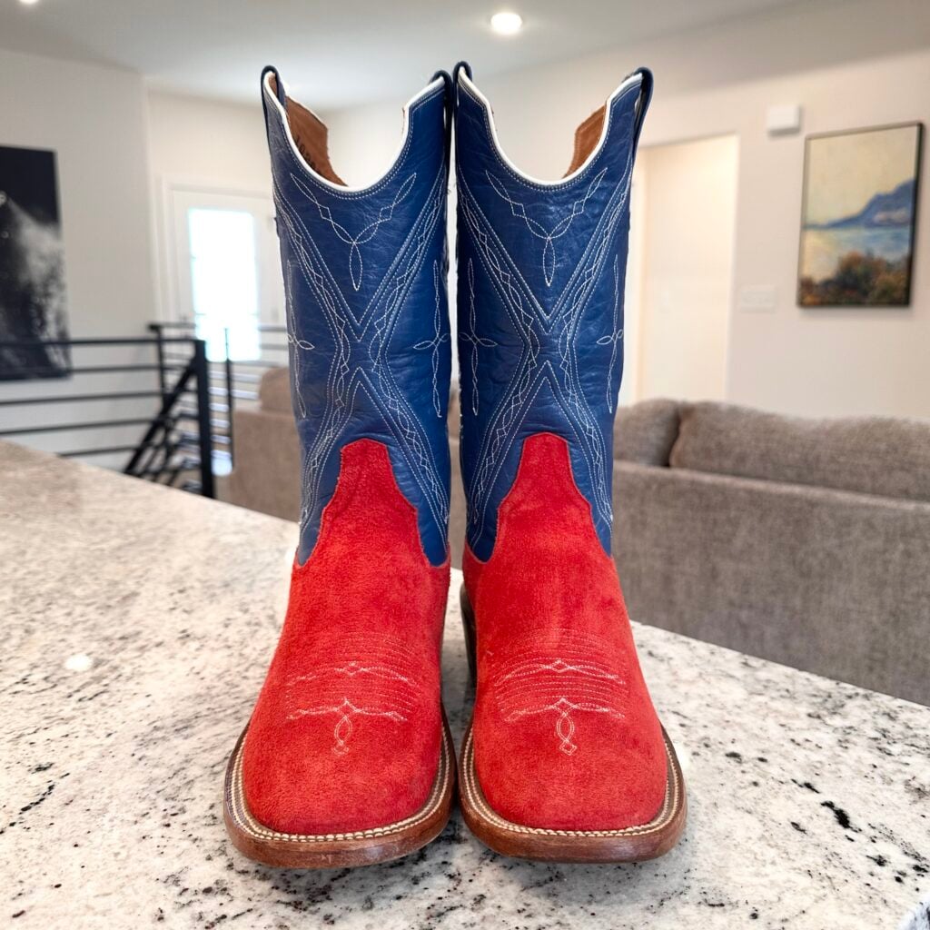 Type: These are men’s Rios of Mercedes Roughout Cowboy Boots. Reached out to Rios of Mercedes to confirm this type of boot. This was their reply to me: “This is a pair of Red Bulldozer (steerhide) with a Nova Kidskin top. Single pair custom design built back in 2018.” The vamp is red, and the shaft is blue. Made from roughout steerhide leather. The shaft is made from blue Nova kidskin leather. Made in the USA, in Texas. Toe bug stitching. These boots are in good condition. 102027