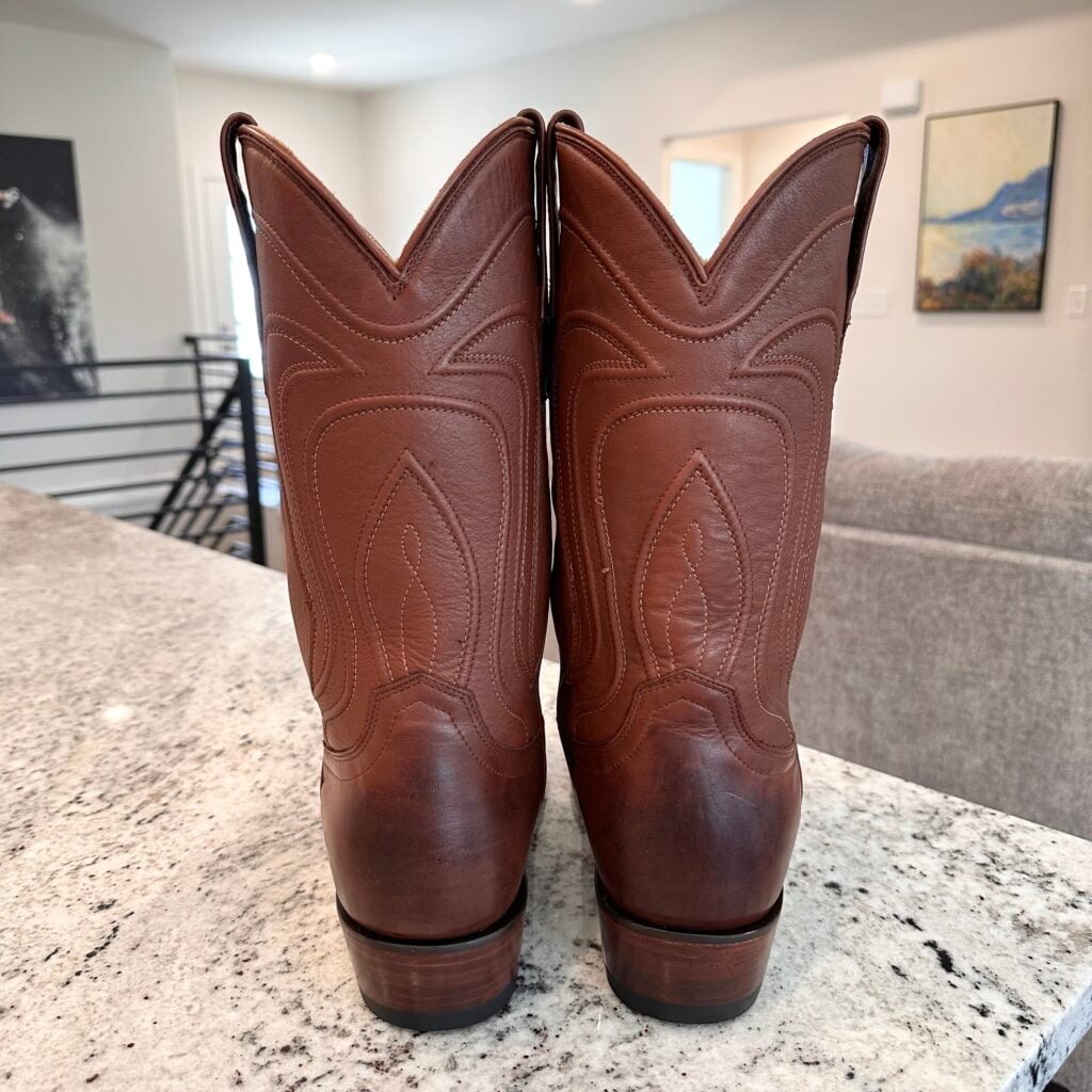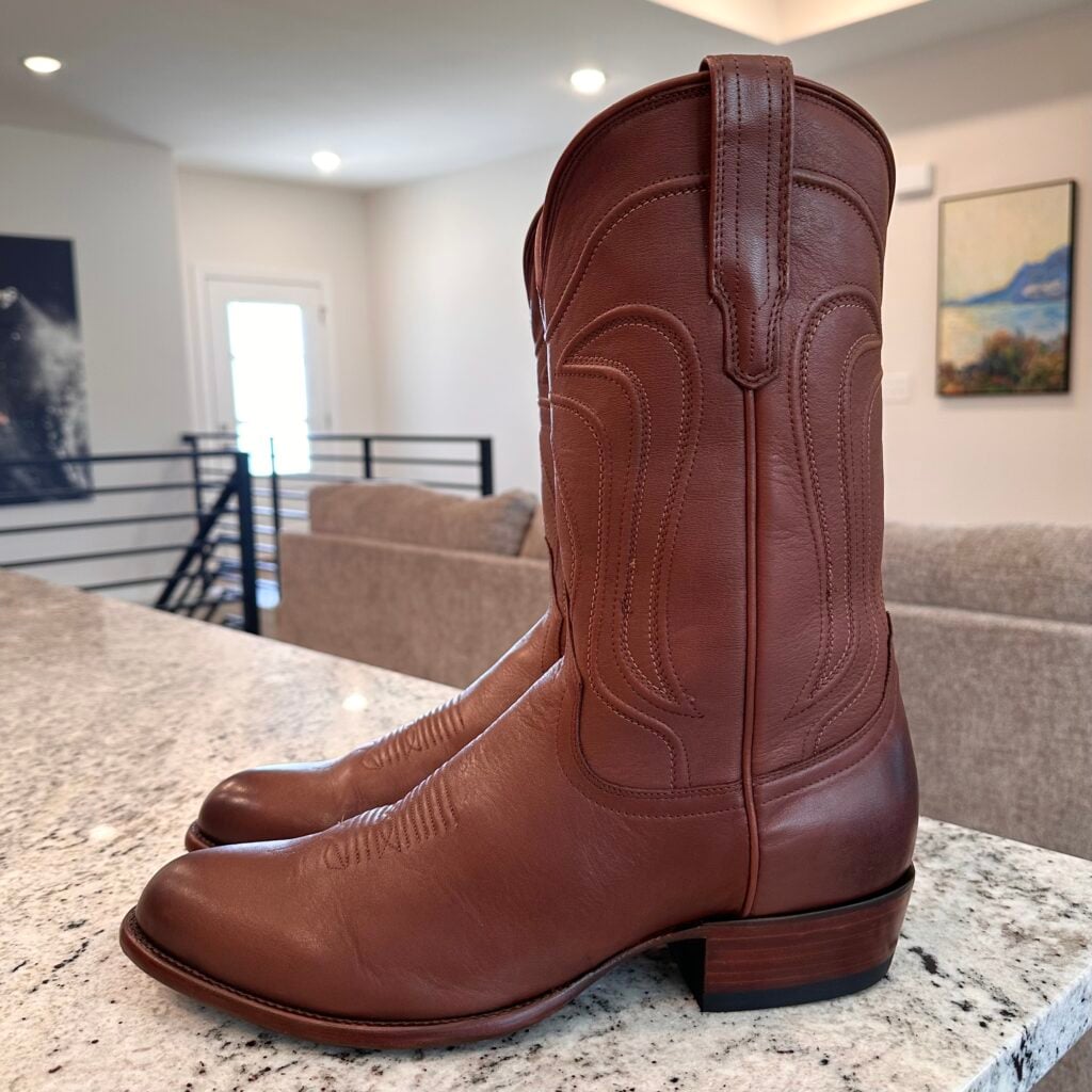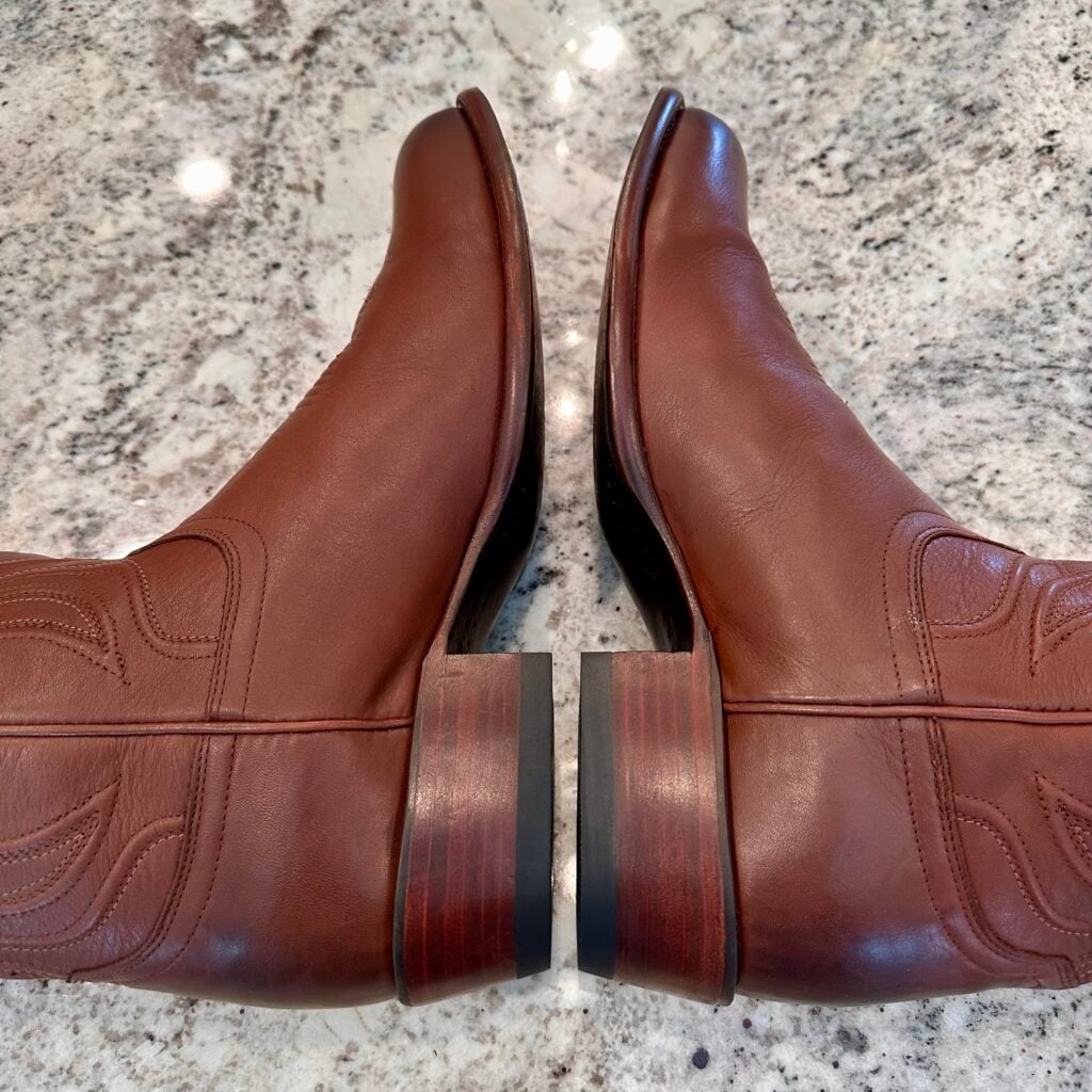 Type: These are men’s size 13 D Tecovas Cartwright Boots in colorway Hazelnut Brown. This is a cowhide leather with a cowhide leather lining. Leather outsoles and rubber heel caps with a rounded toe design. Tecovas style 1000. The leather is in good shape with gentle creasing from use. The leather outsoles have plenty of good life left in them. The rubber heel caps hardly show any wear.