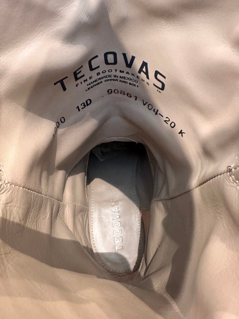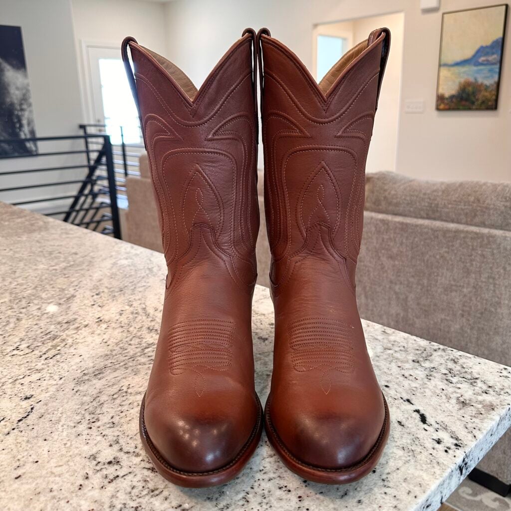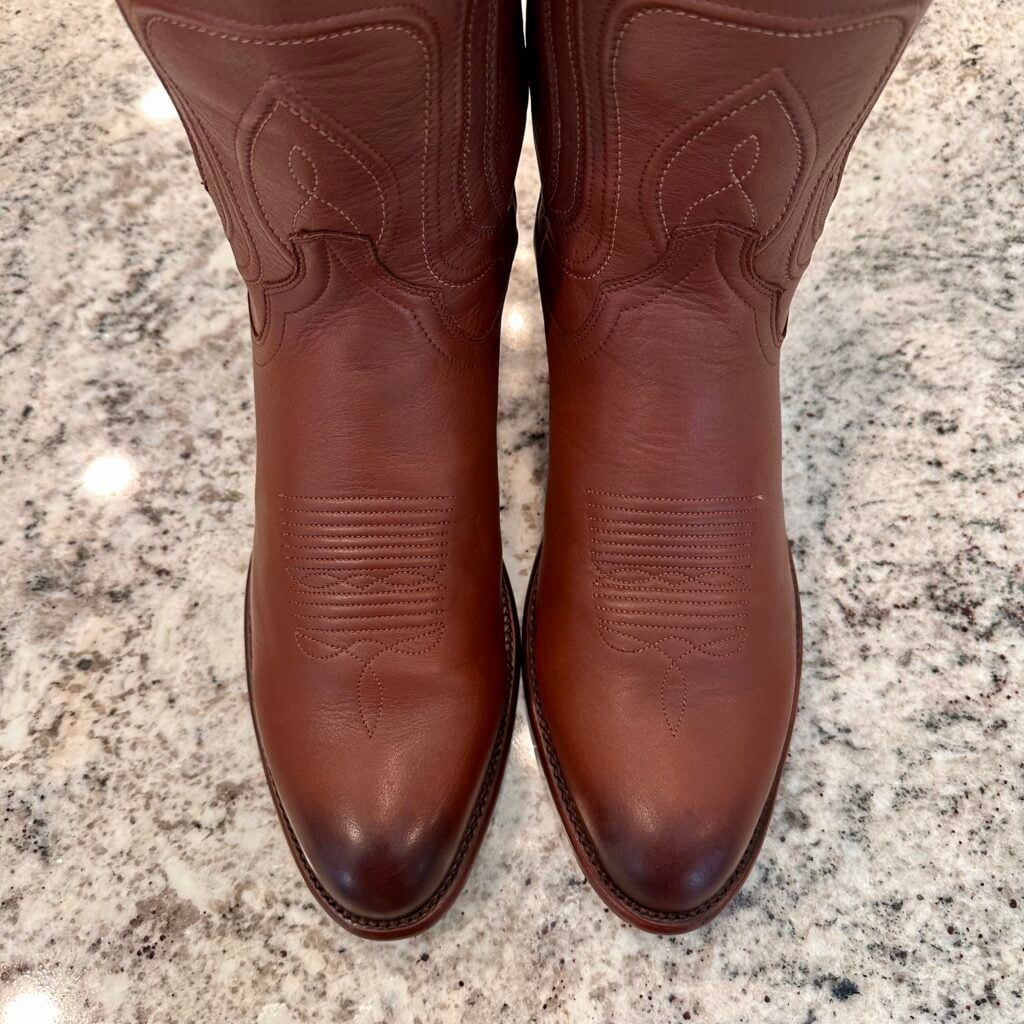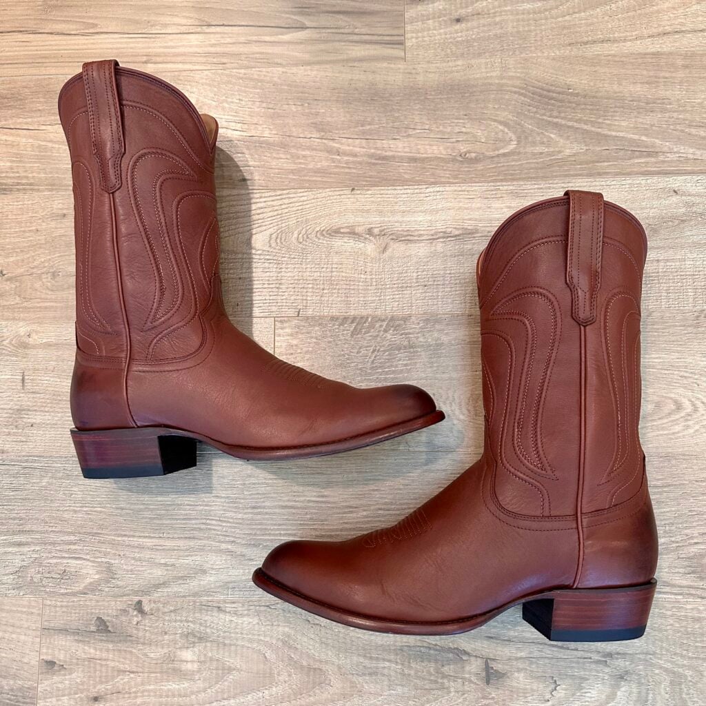 Type: These are men’s size 13 D Tecovas Cartwright Boots in colorway Hazelnut Brown. This is a cowhide leather with a cowhide leather lining. Leather outsoles and rubber heel caps with a rounded toe design. Tecovas style 1000. The leather is in good shape with gentle creasing from use. The leather outsoles have plenty of good life left in them. The rubber heel caps hardly show any wear.