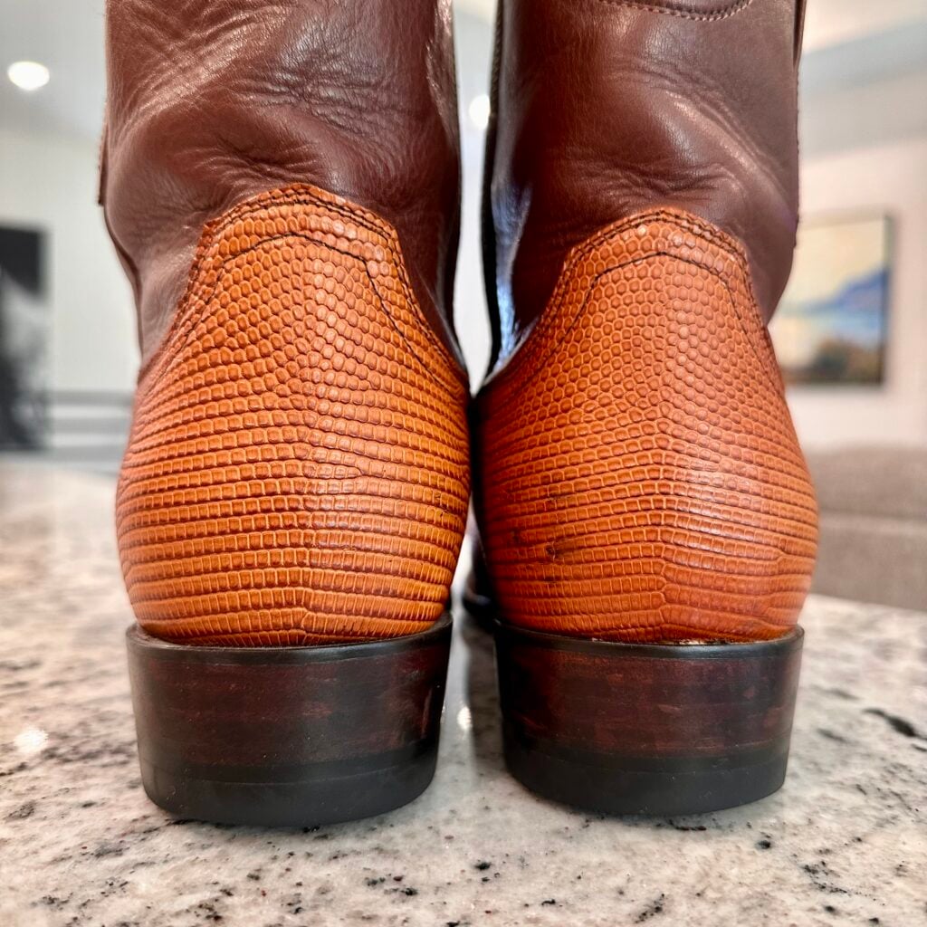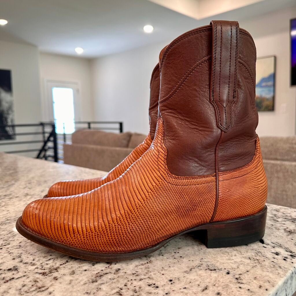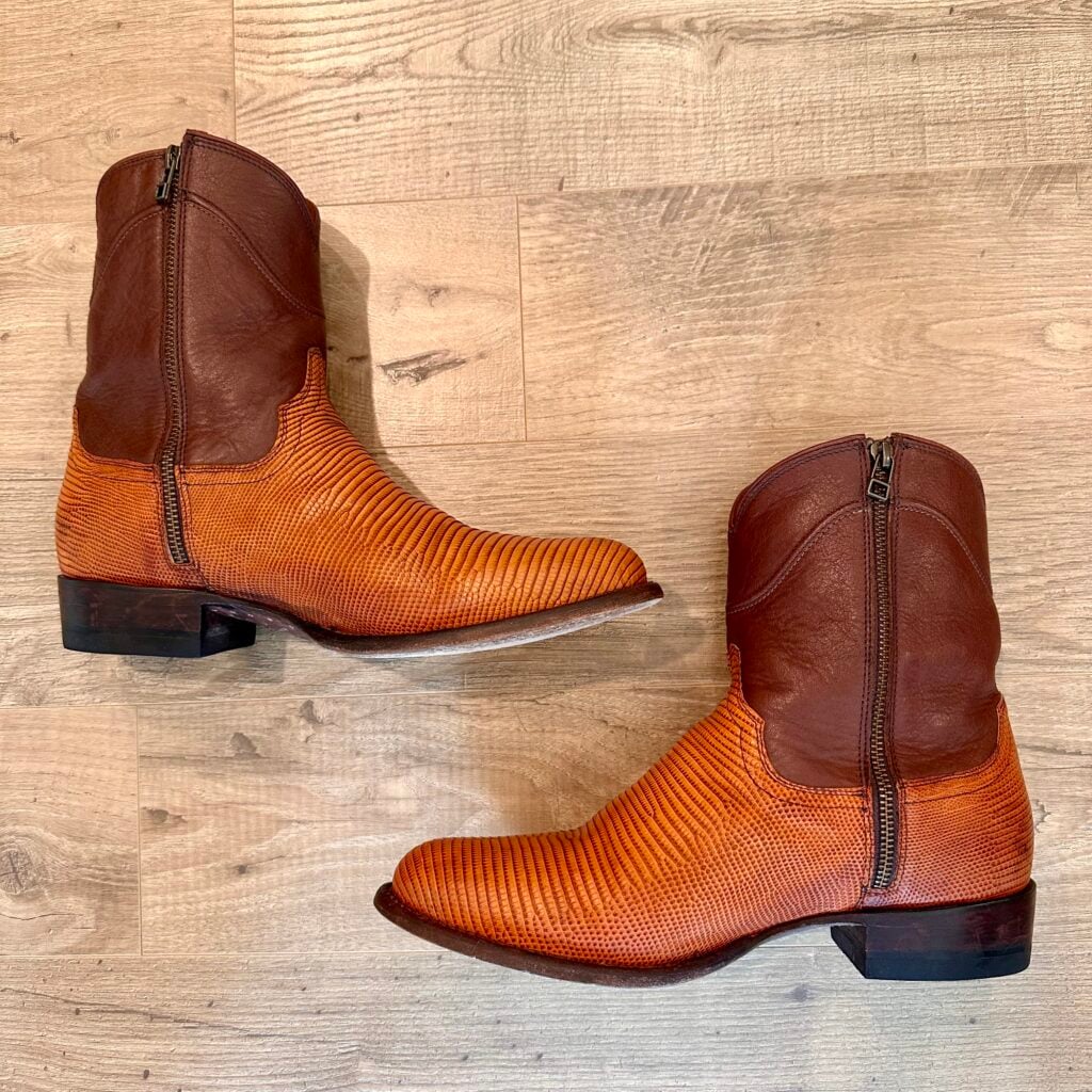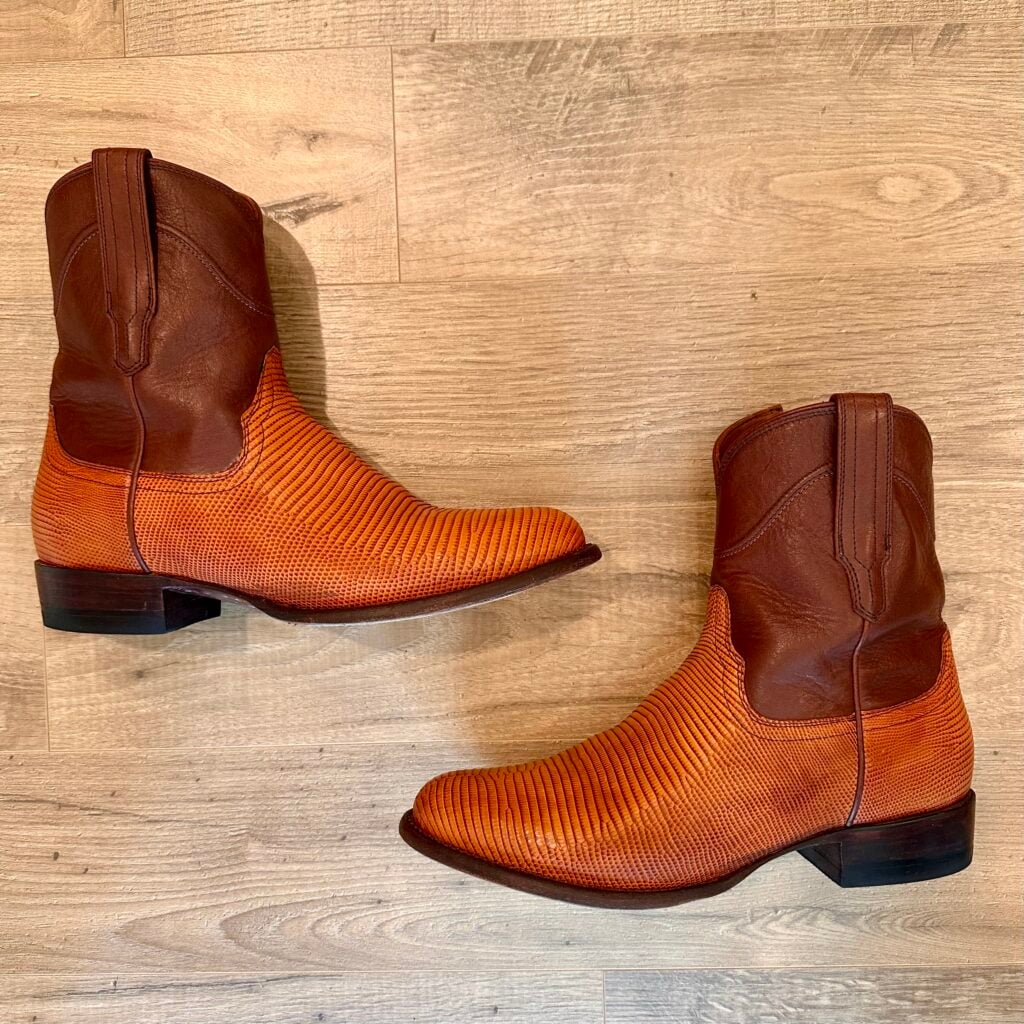 These are men’s size 9 EE Tecovas Lizard Dean Boots. Tecovas Style 1029 – Color Peanut Lizard + Brown Shaft. Side Zip entry. Lizard leather foot. Leather outsoles with rubber heel caps. Round toe design.