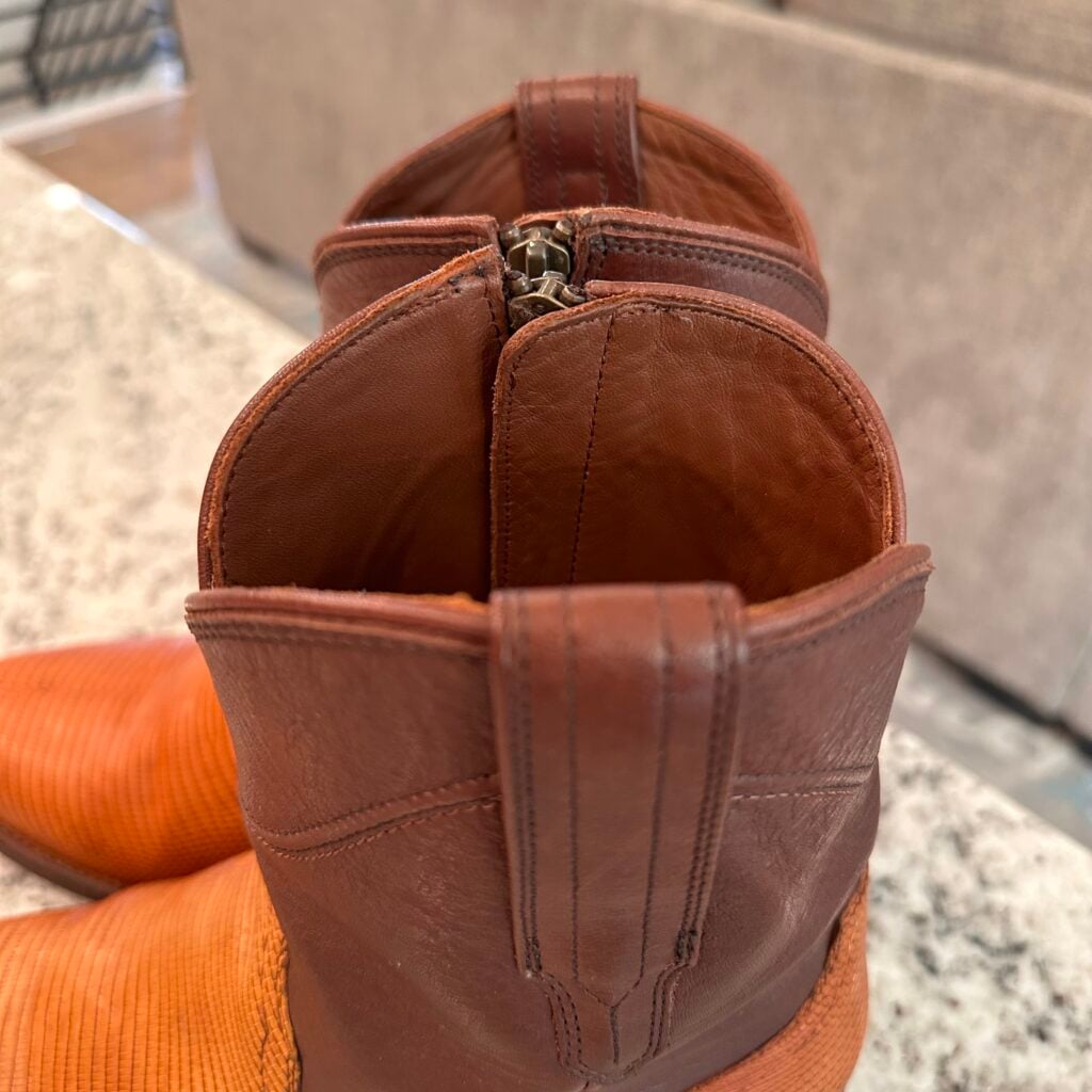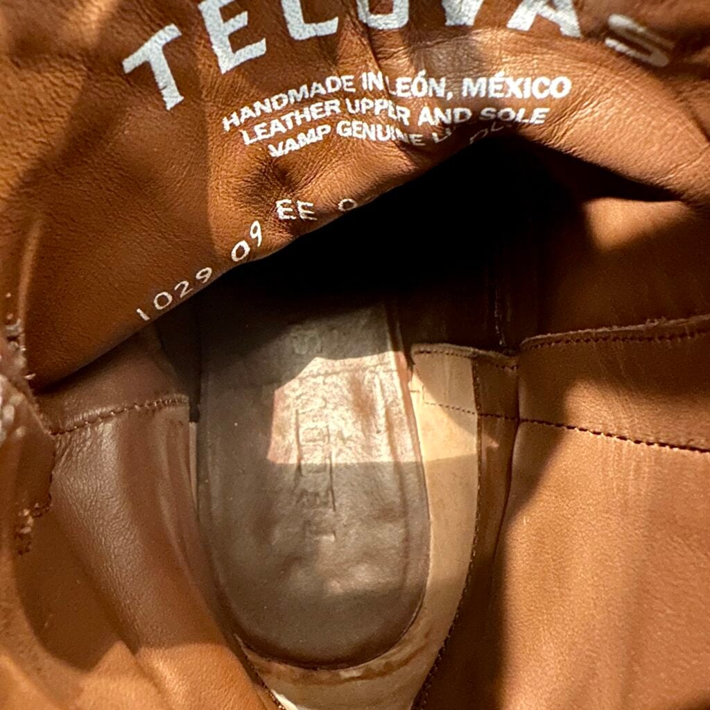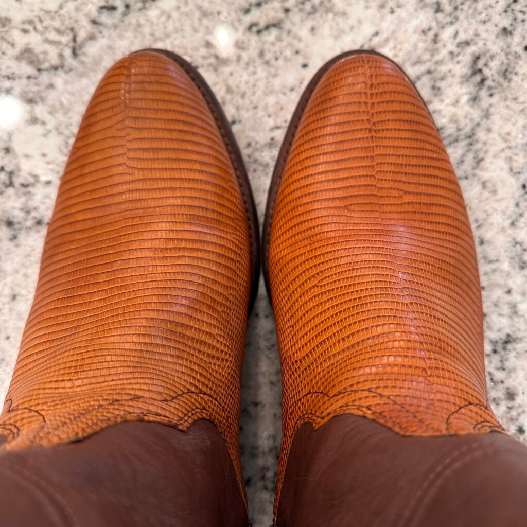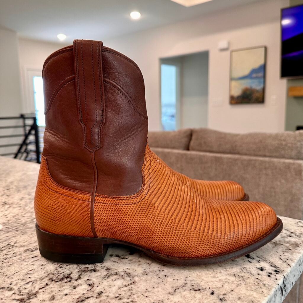 These are men’s size 9 EE Tecovas Lizard Dean Boots. Tecovas Style 1029 – Color Peanut Lizard + Brown Shaft. Side Zip entry. Lizard leather foot. Leather outsoles with rubber heel caps. Round toe design.