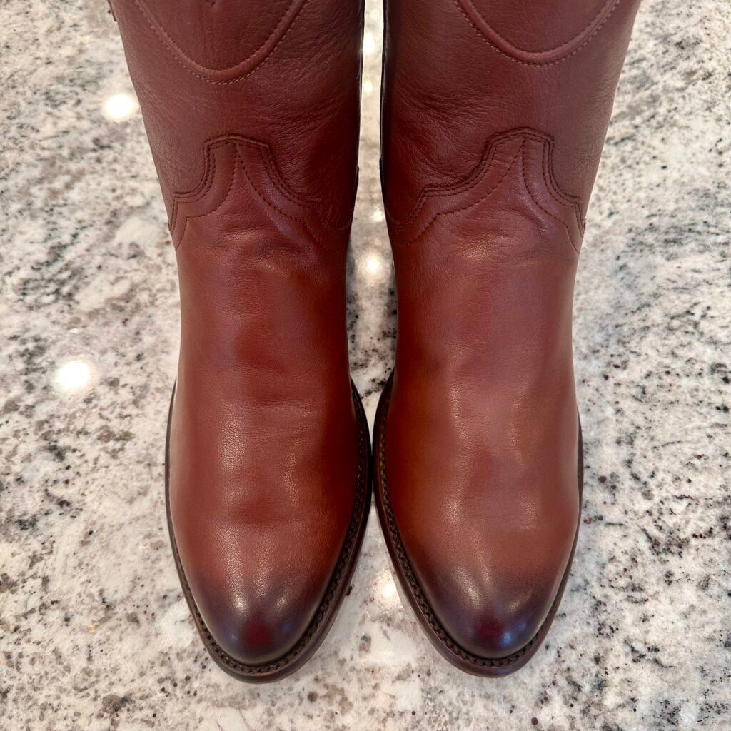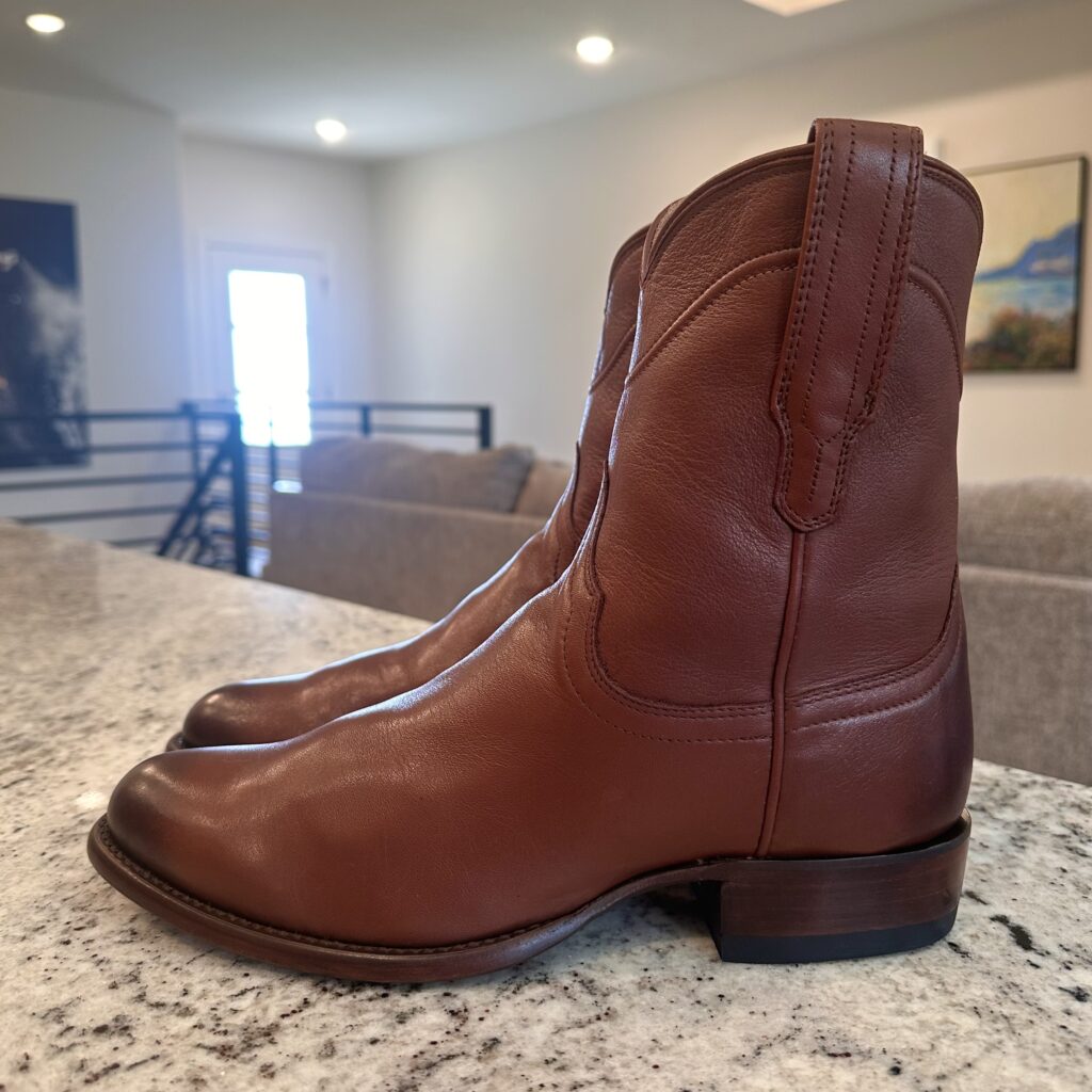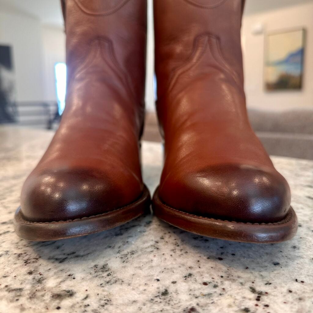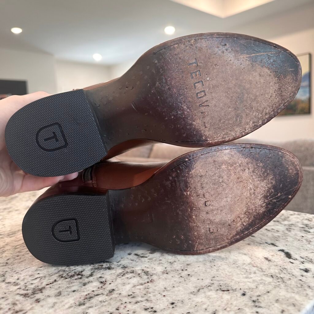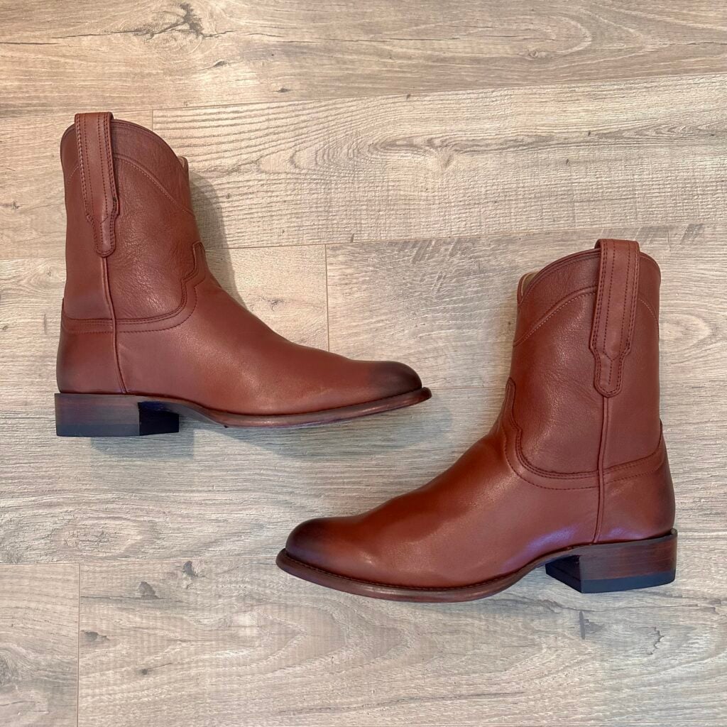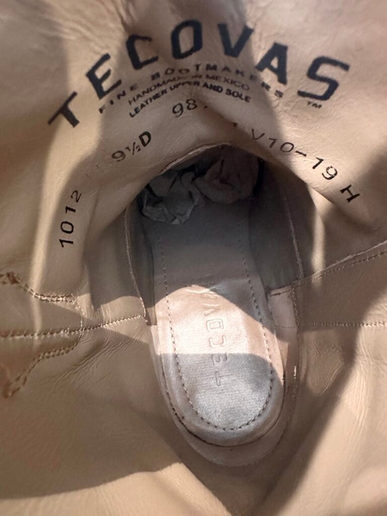 Type: These are men’s size 9.5 D Tecovas Dean Zip Boots in color Hazelnut (reddish brown). This is a bovine leather. Side zip entry. Leather outsoles with rubber heel caps. Tecovas style 1012. Leather is in good condition, gentle scuffing near heels. Outsoles, heel stacks, and rubber heel caps show signs of wear, but have good life left in them.