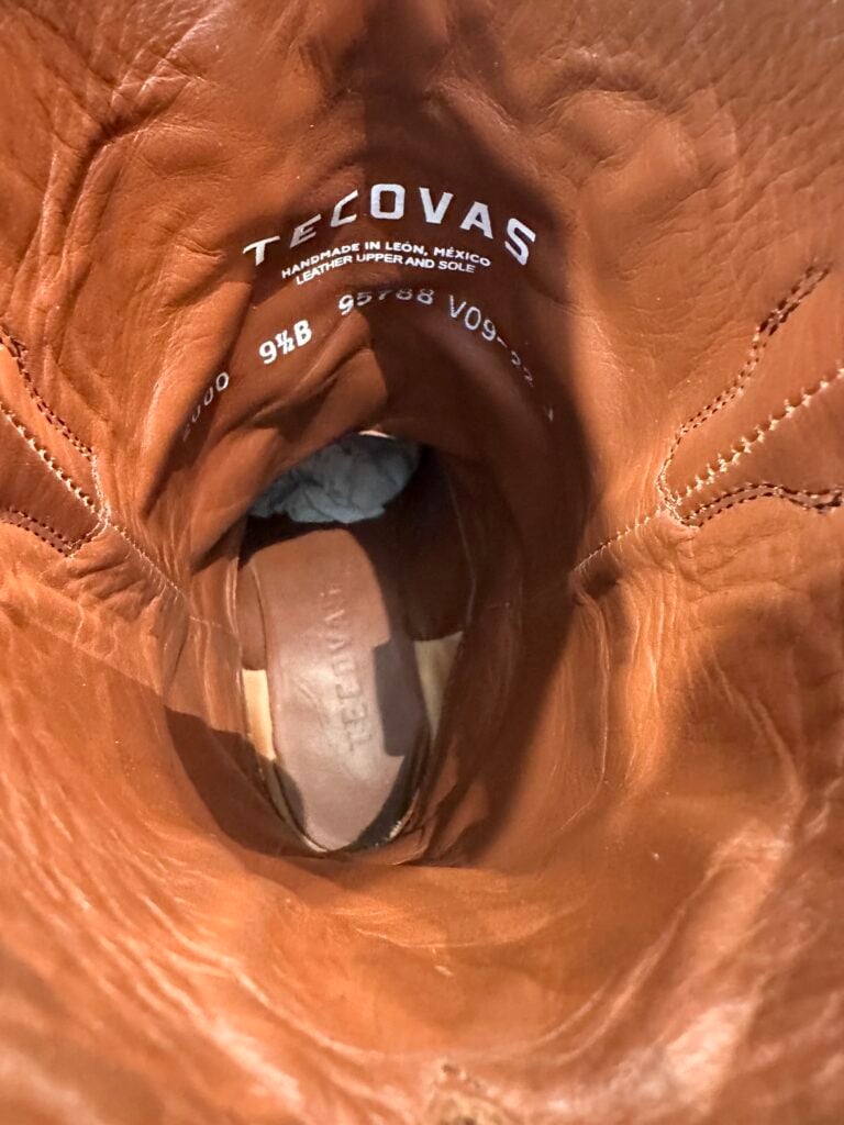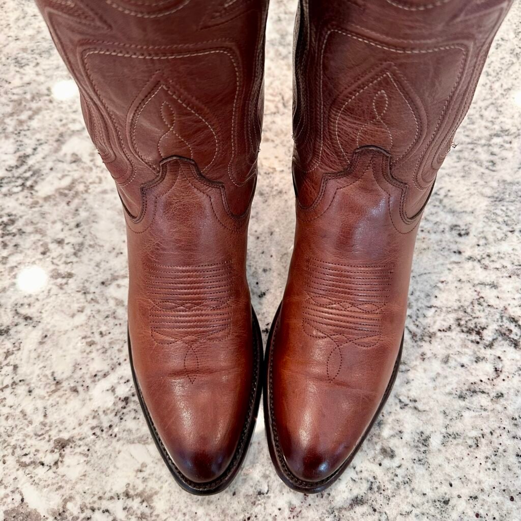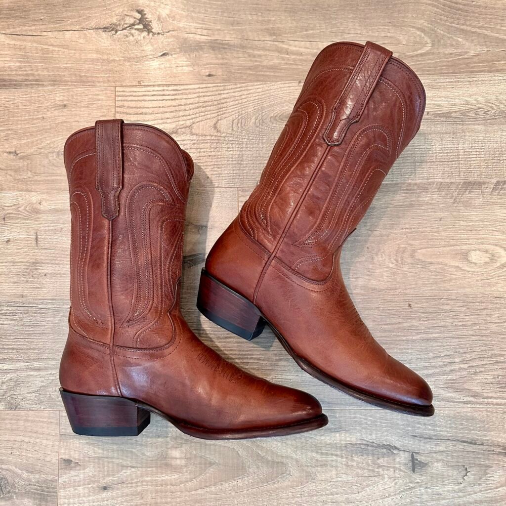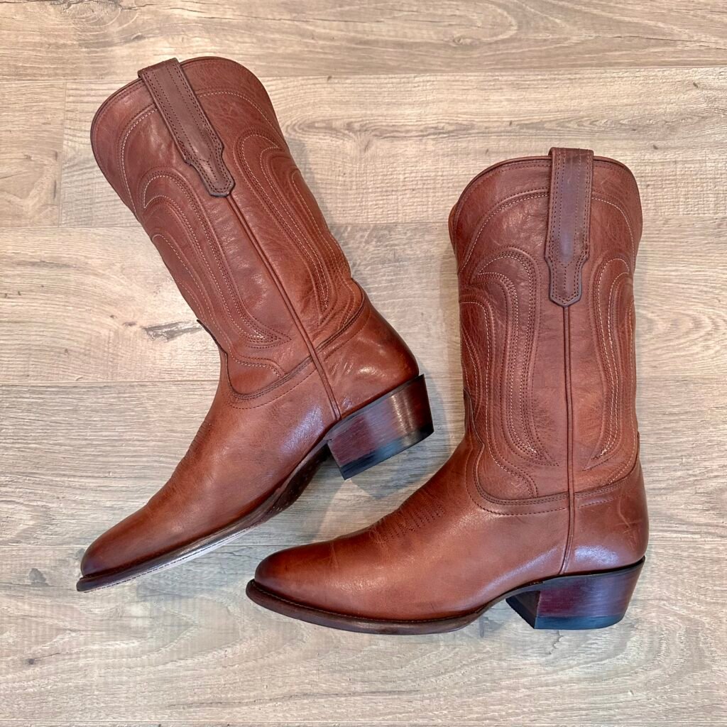 Type: These are women’s size 9.5 B Tecovas Jamie Boots in color brown. This is the original version of the Jamie that is no longer produced (The OG Jamie). These boots are in good pre-owned condition. The leather is in good shape. There is gentle scuffing near the toes and heels.