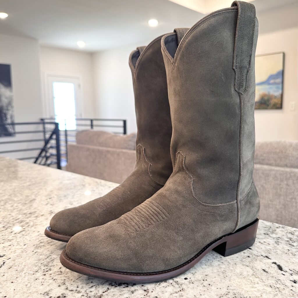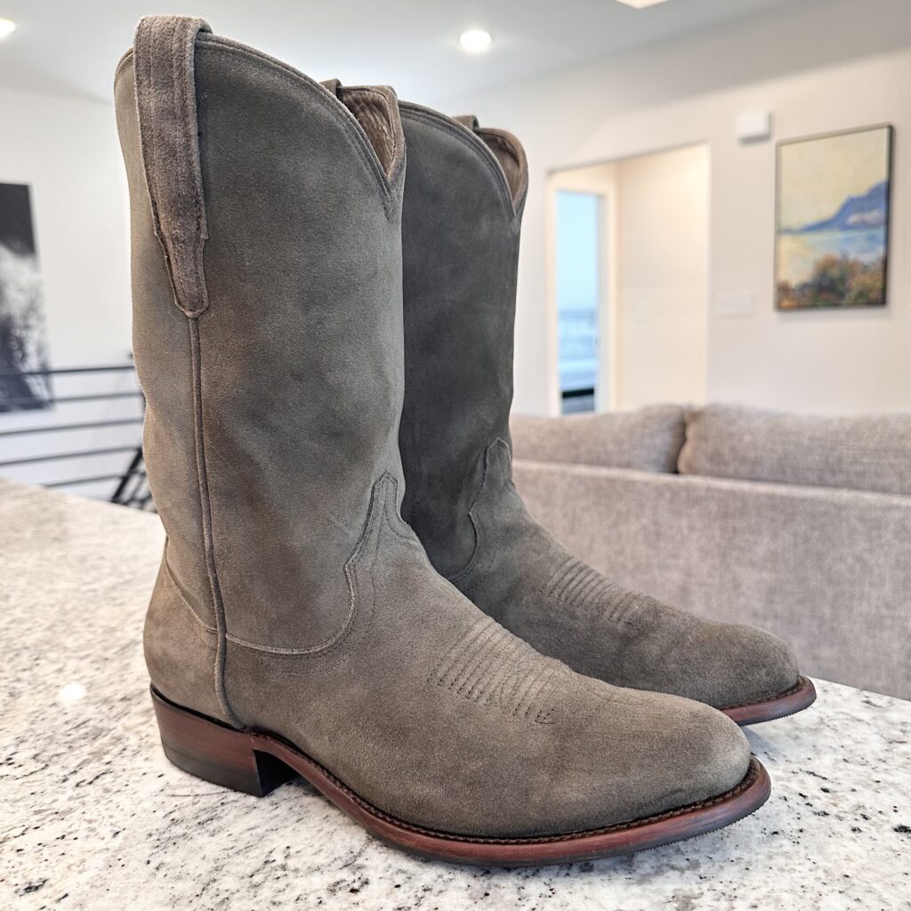 These are men’s size 10.5 D Tecovas Johnny Boots Style 1008 in gray. These boots have hybrid rubber outsoles. Suede uppers.