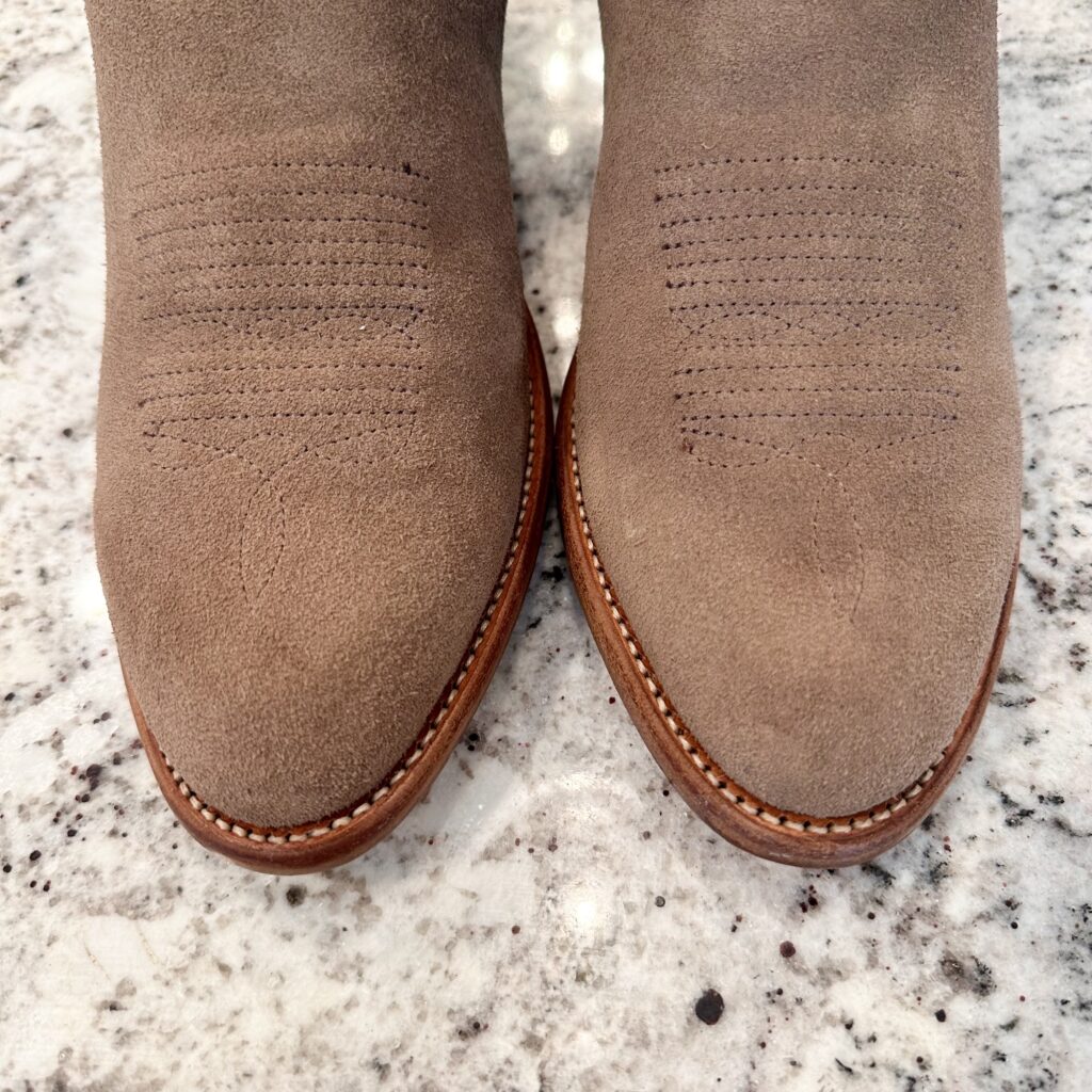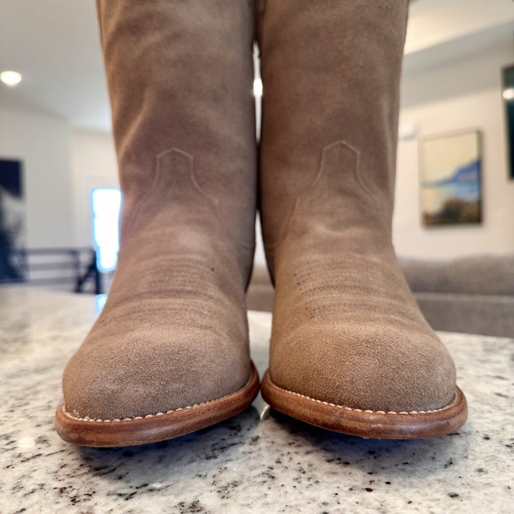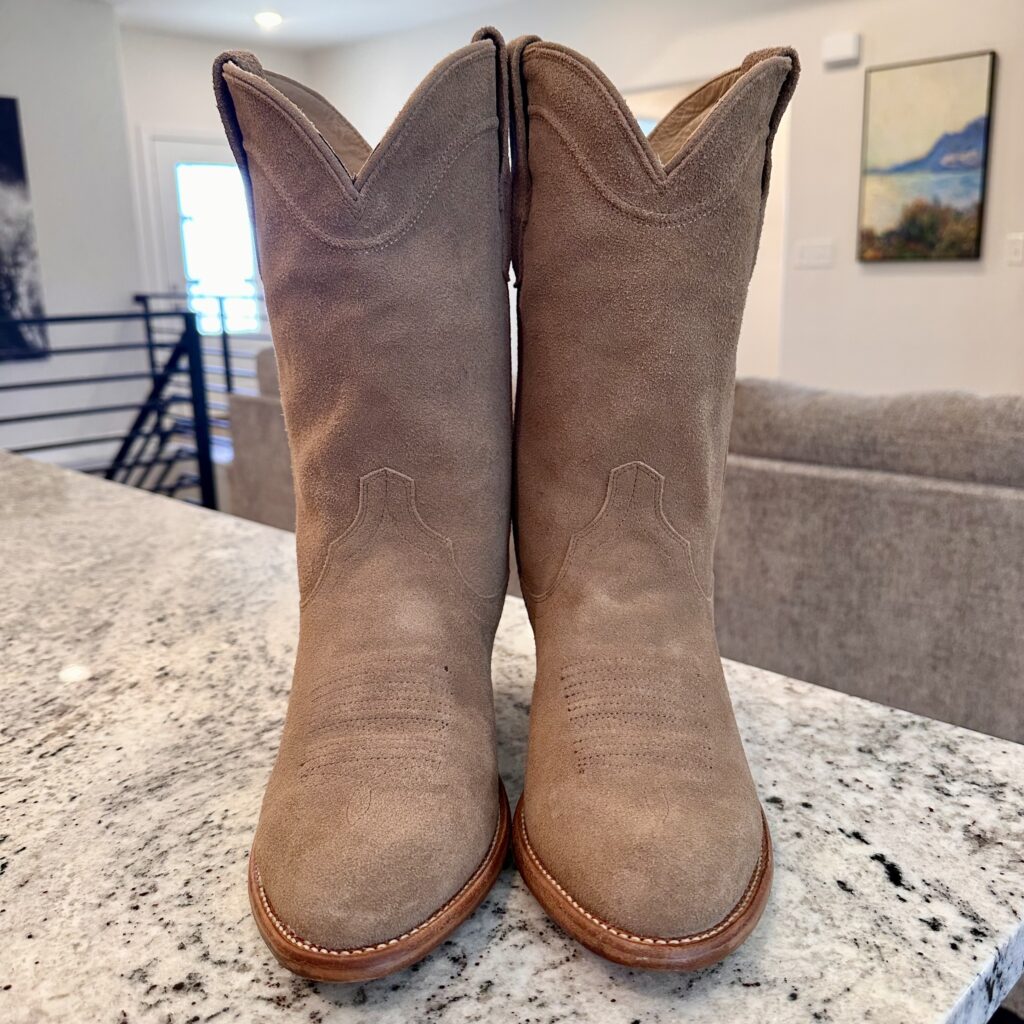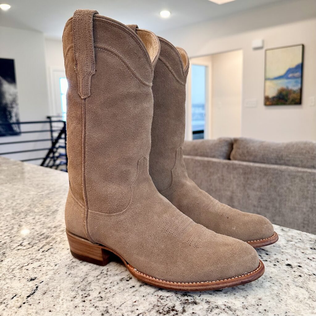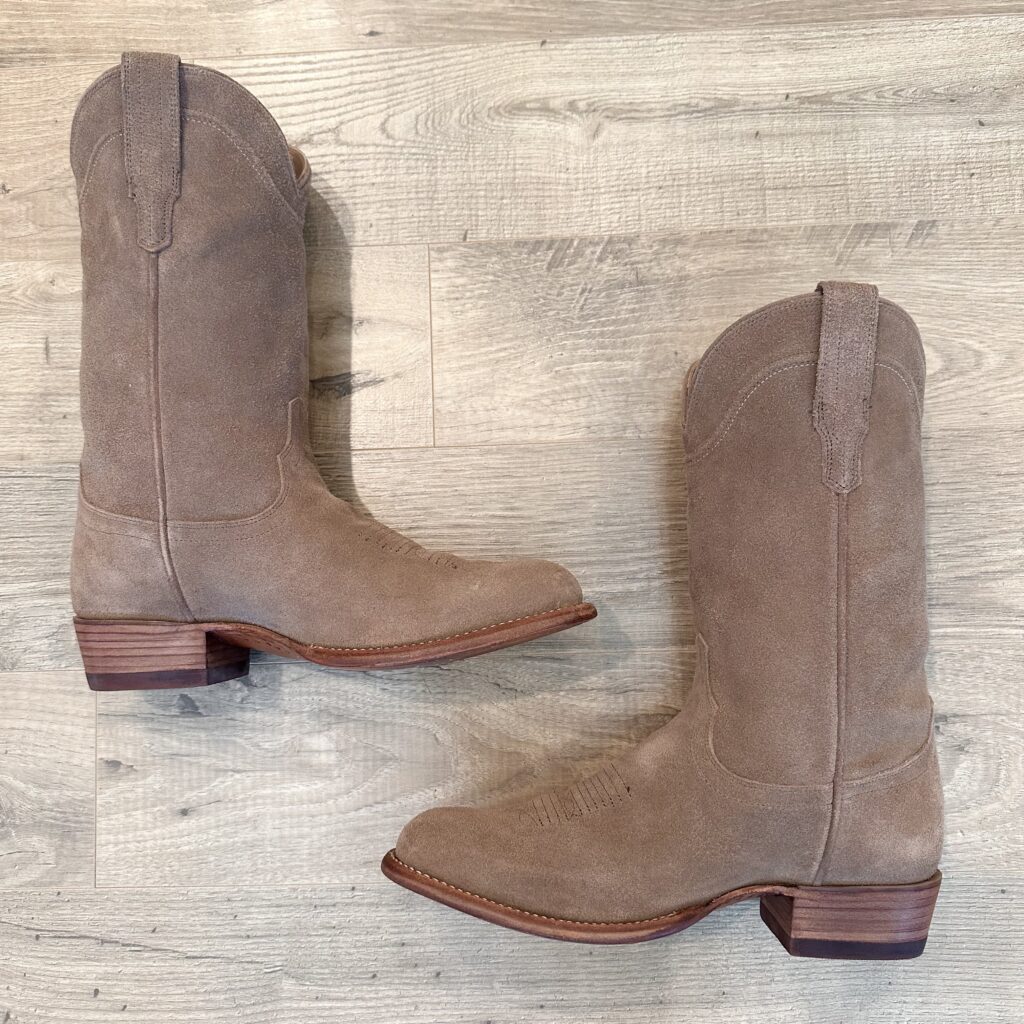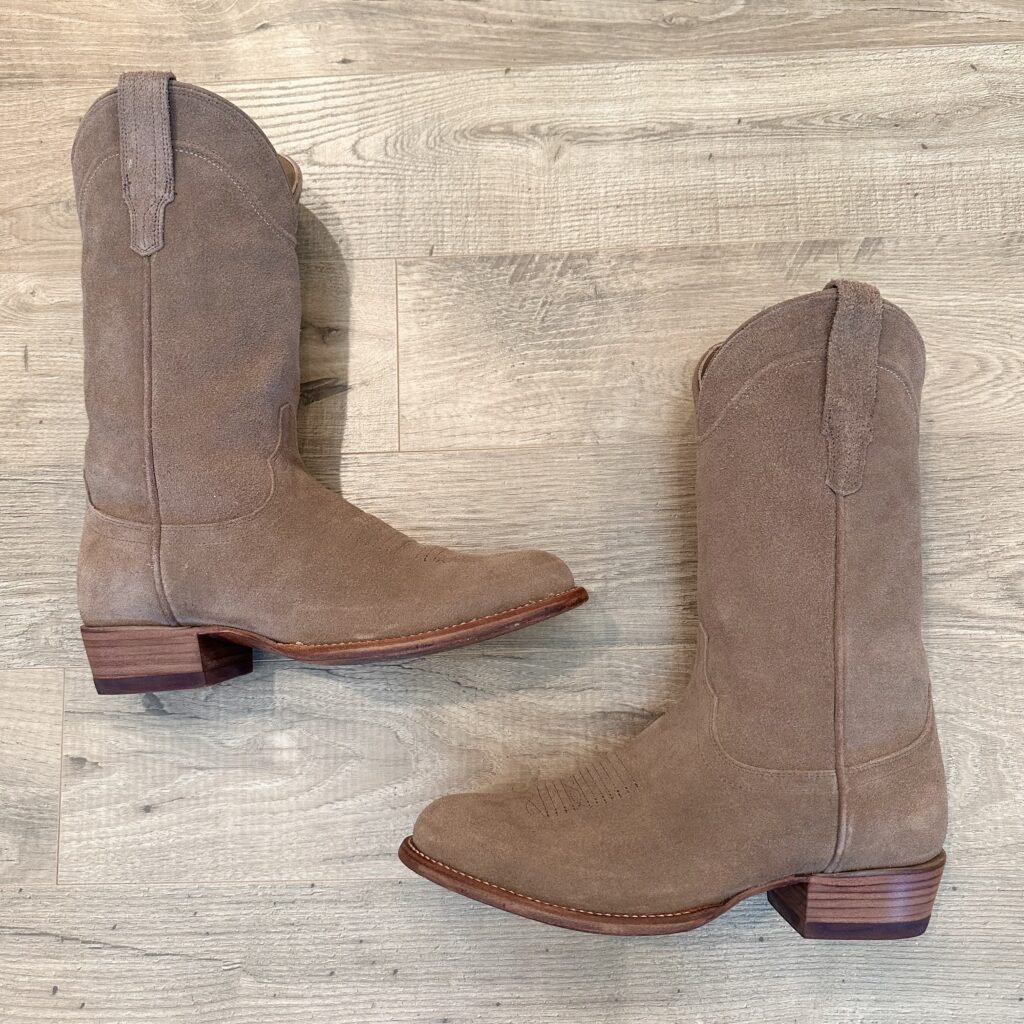 Type: These are men’s size 9.5 EE Tecovas Johnny Boots. These boots have a suede upper with leather outsoles. Tecovas style 1008. Goodyear welt construction.