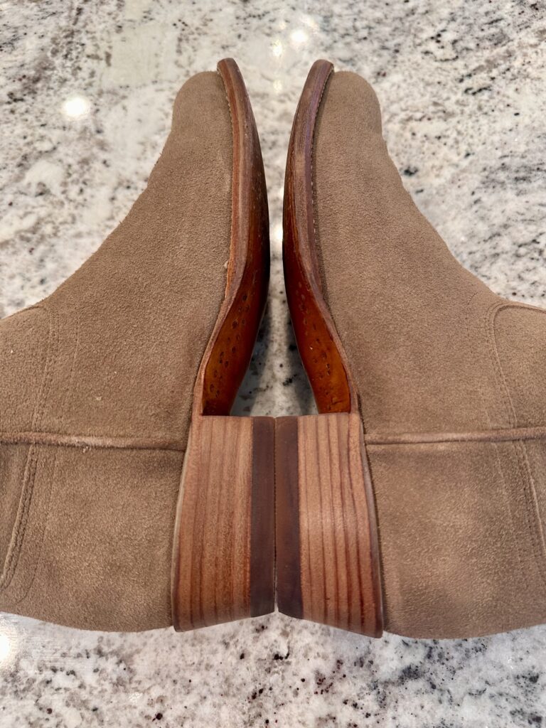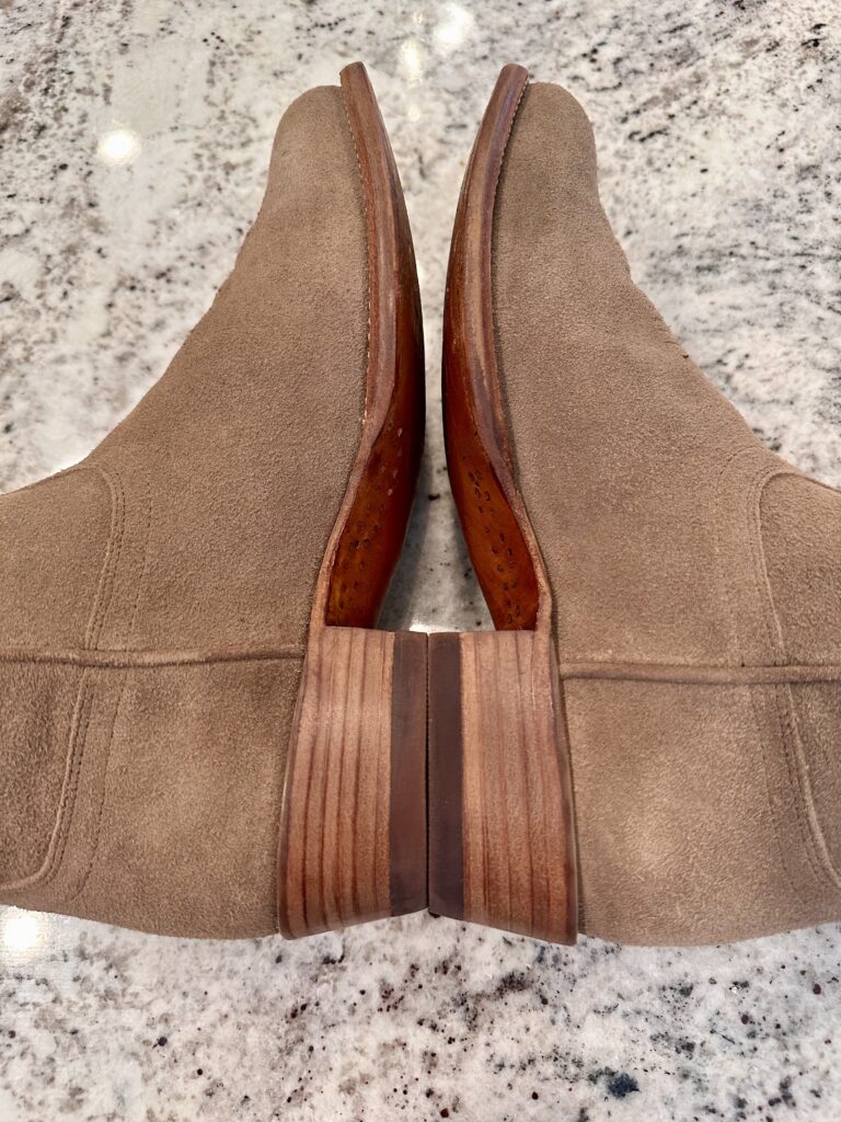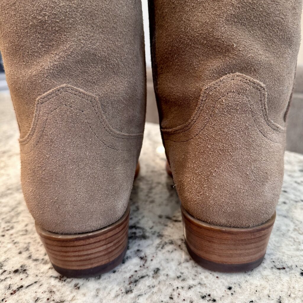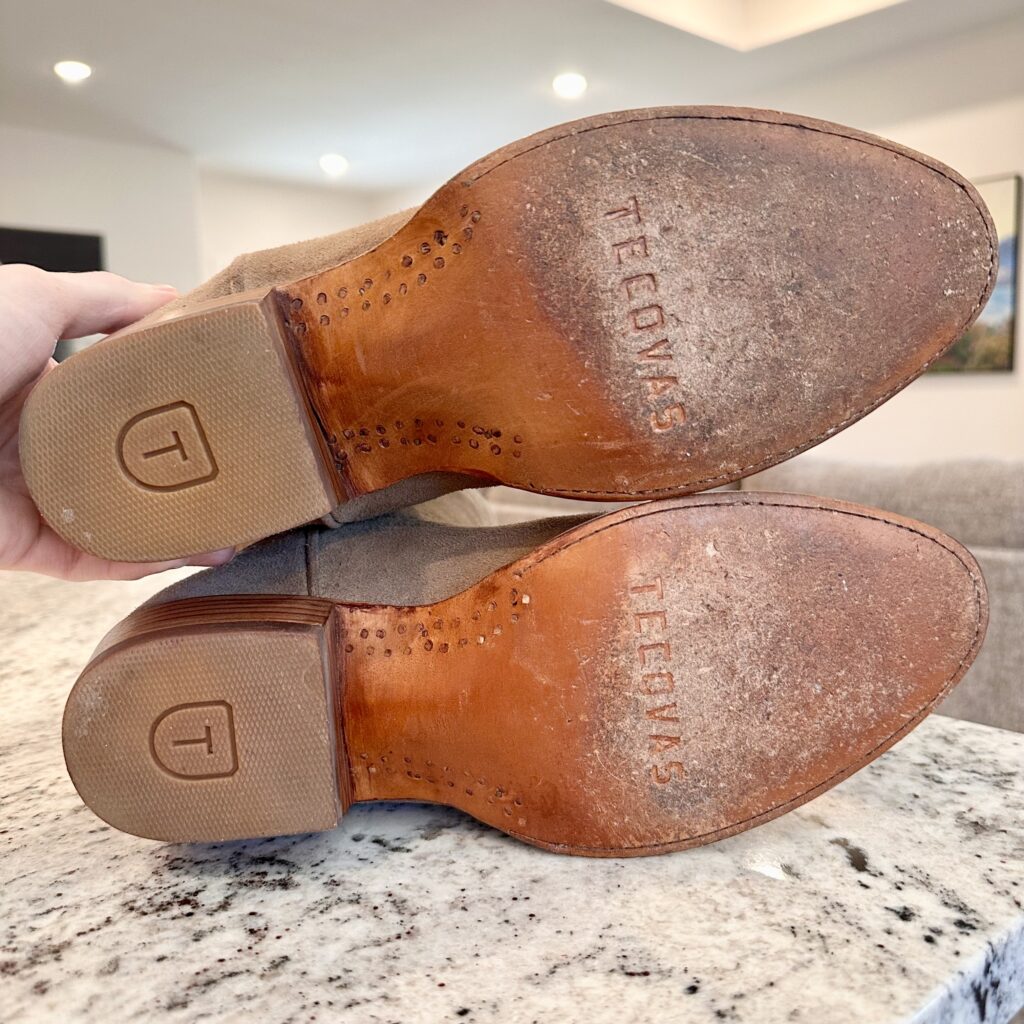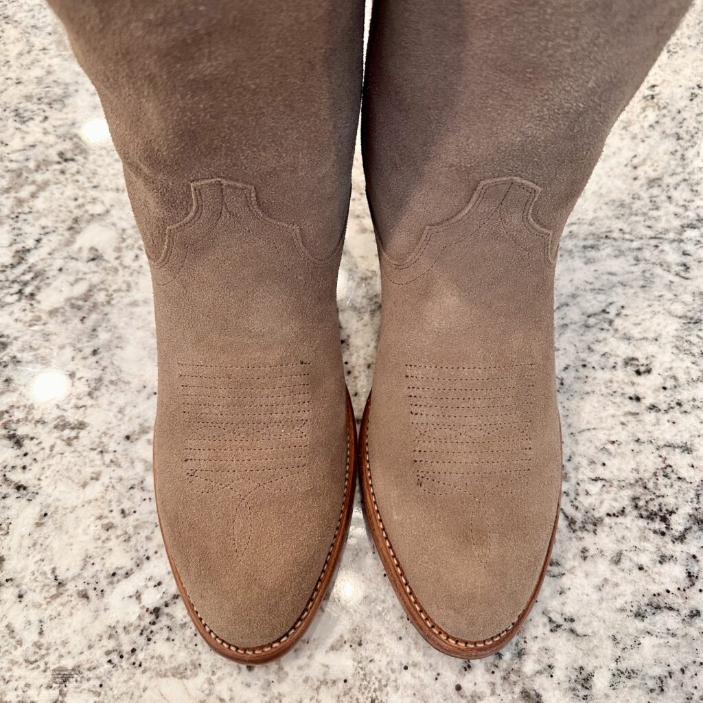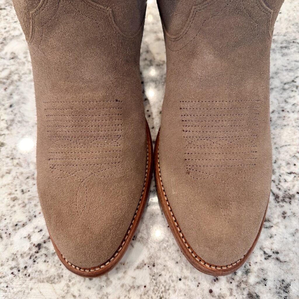 Type: These are men’s size 9.5 EE Tecovas Johnny Boots. These boots have a suede upper with leather outsoles. Tecovas style 1008. Goodyear welt construction.