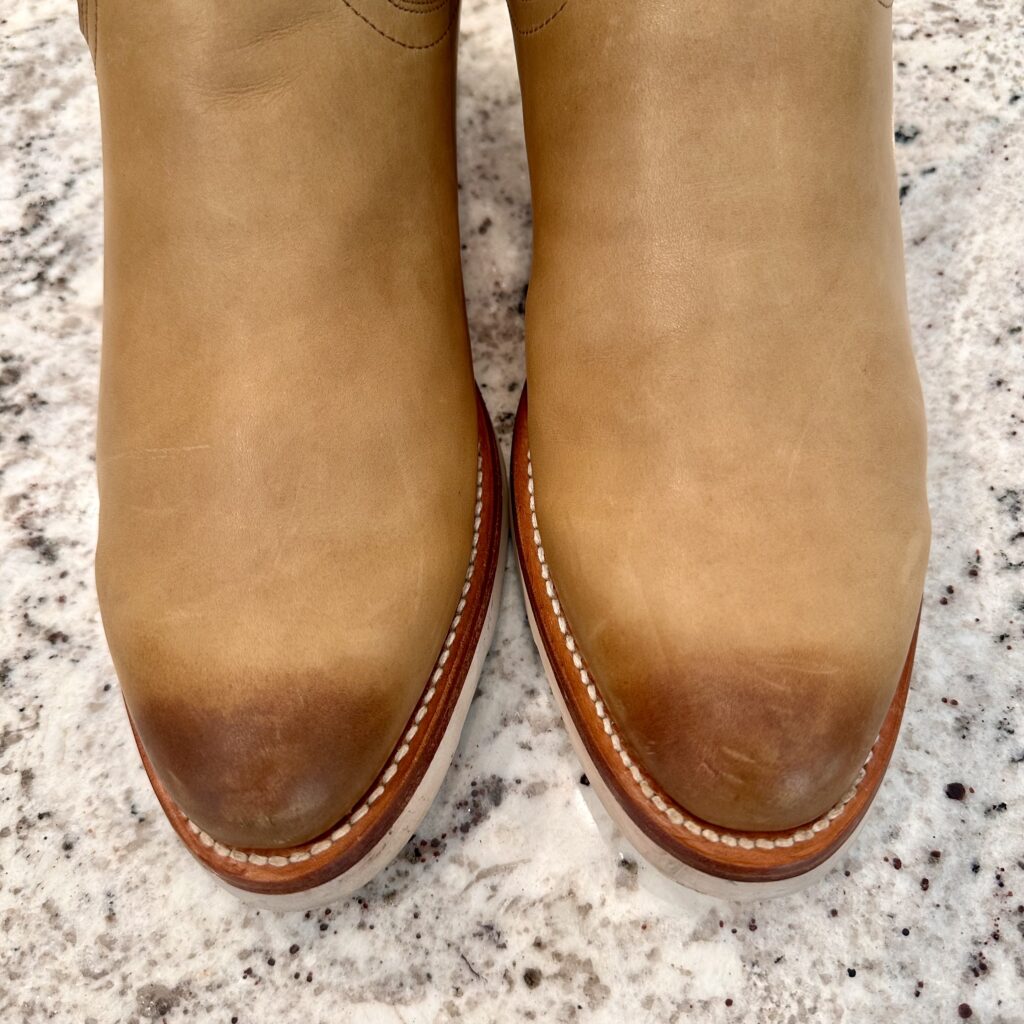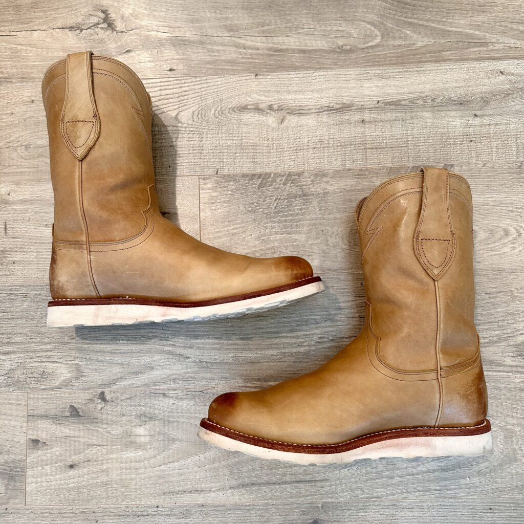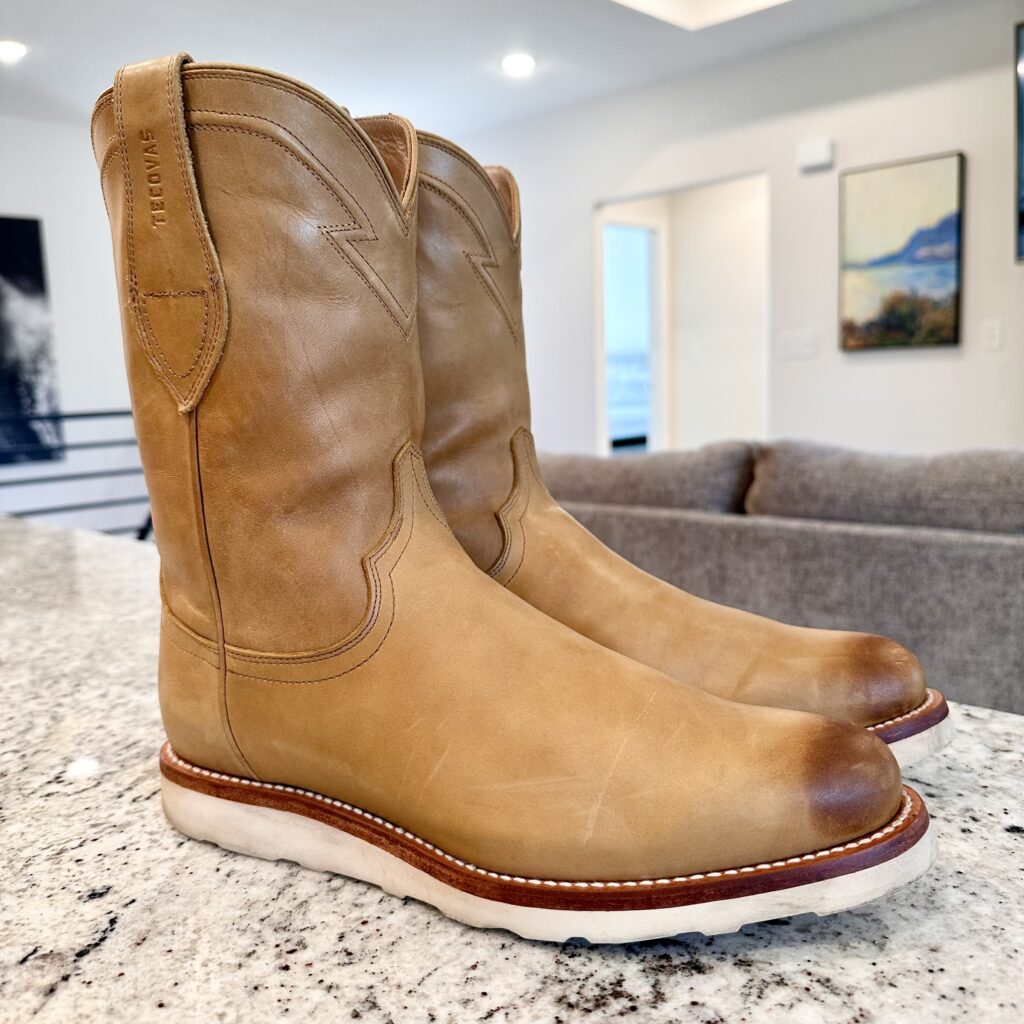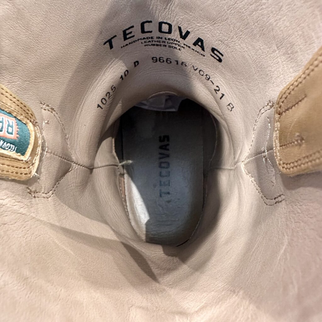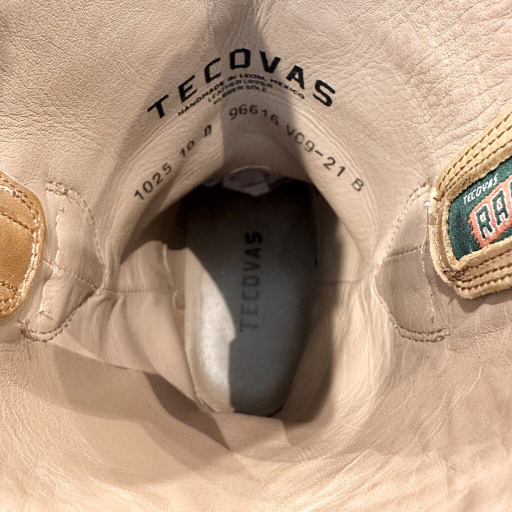 Type: These are men’s size 10 D Tecovas Knox boots in color “Wheat” (Tannish Brown). Style 1025. Bovine leather. These boots have Vibram wedge outsoles. Soft toe work boot. The leather is in good condition but does have gentle scuffing near the toes and heels from use.