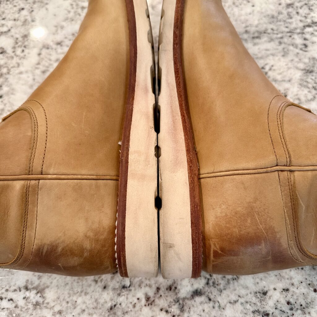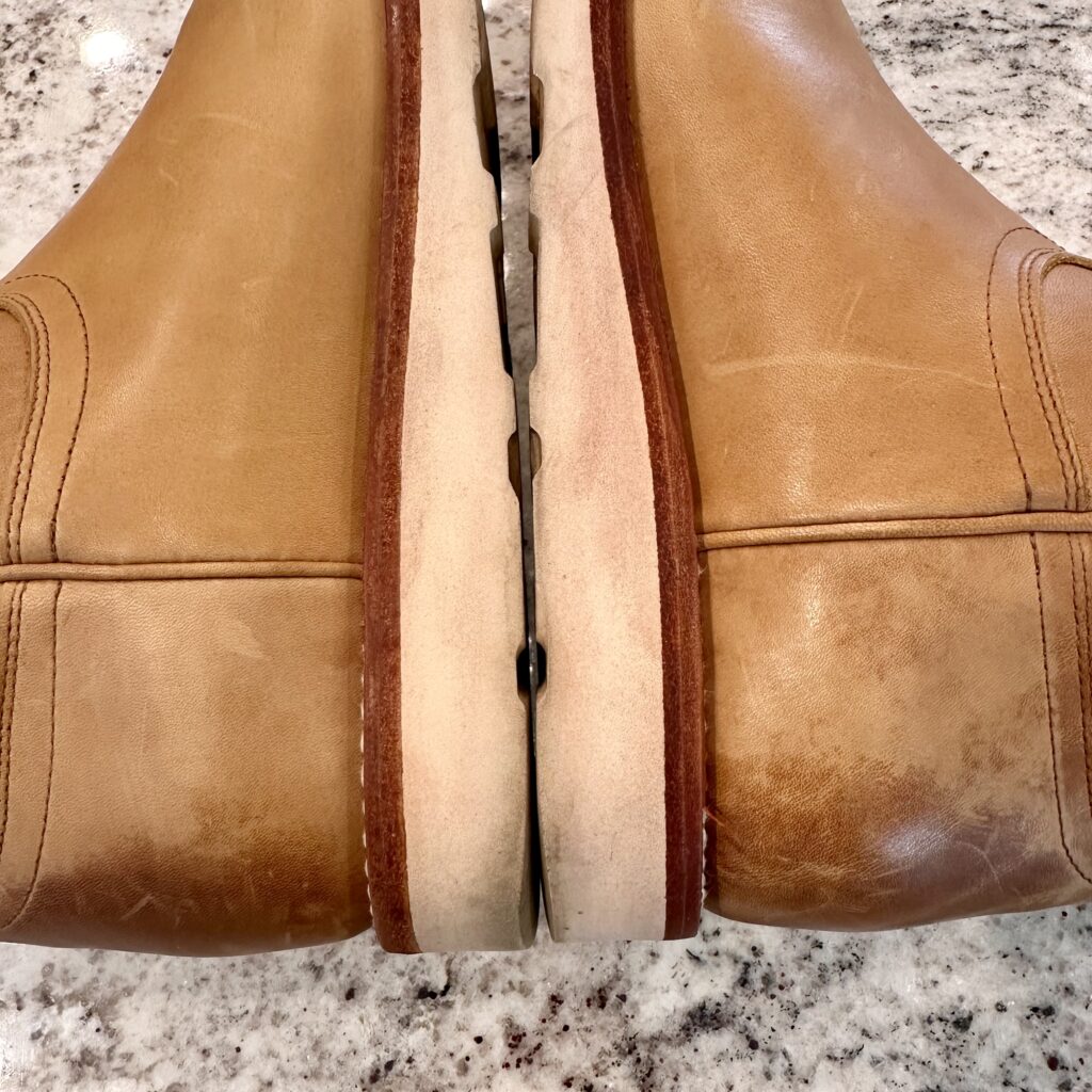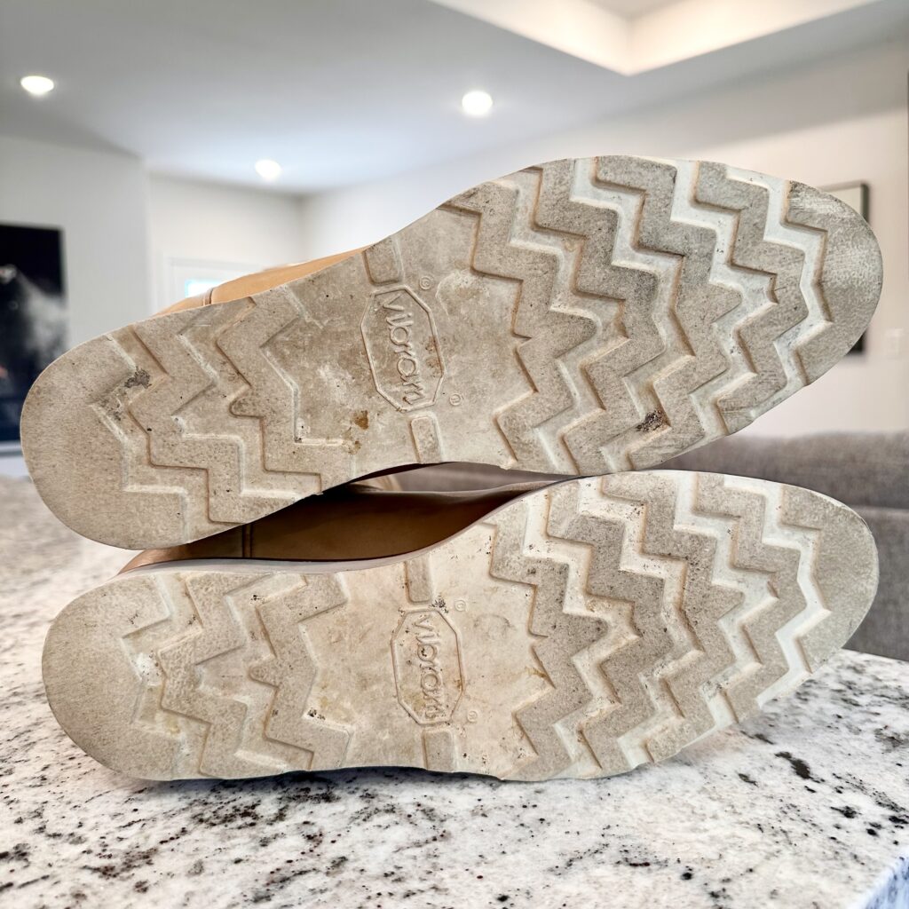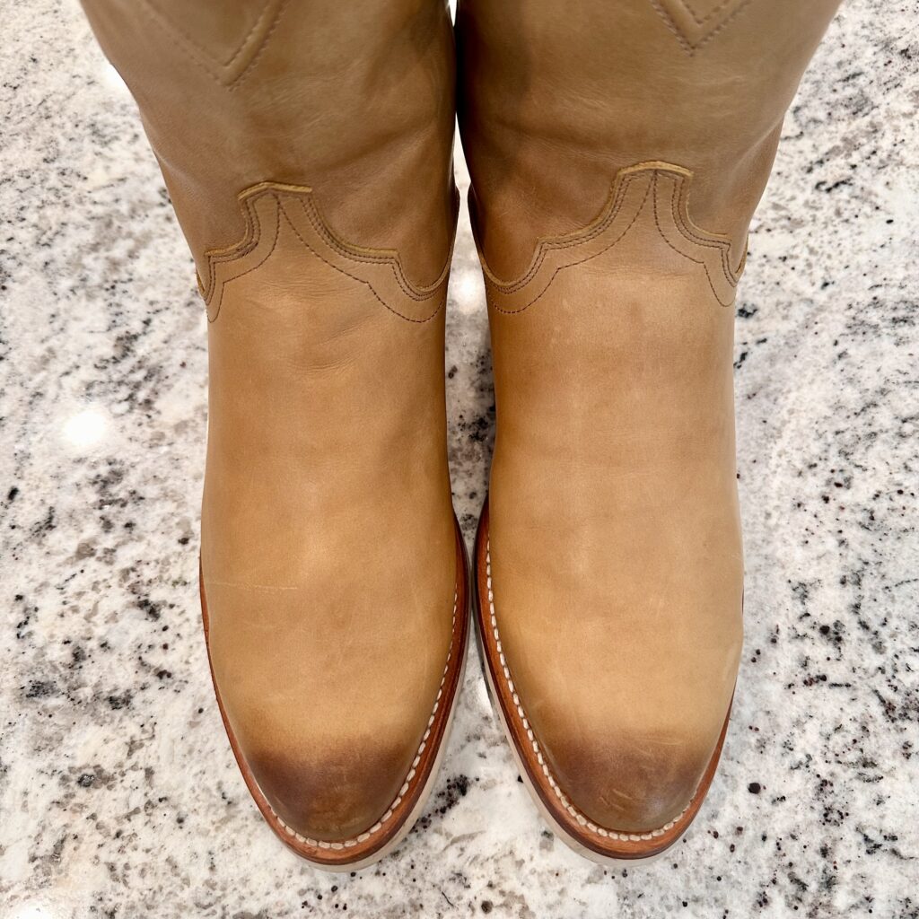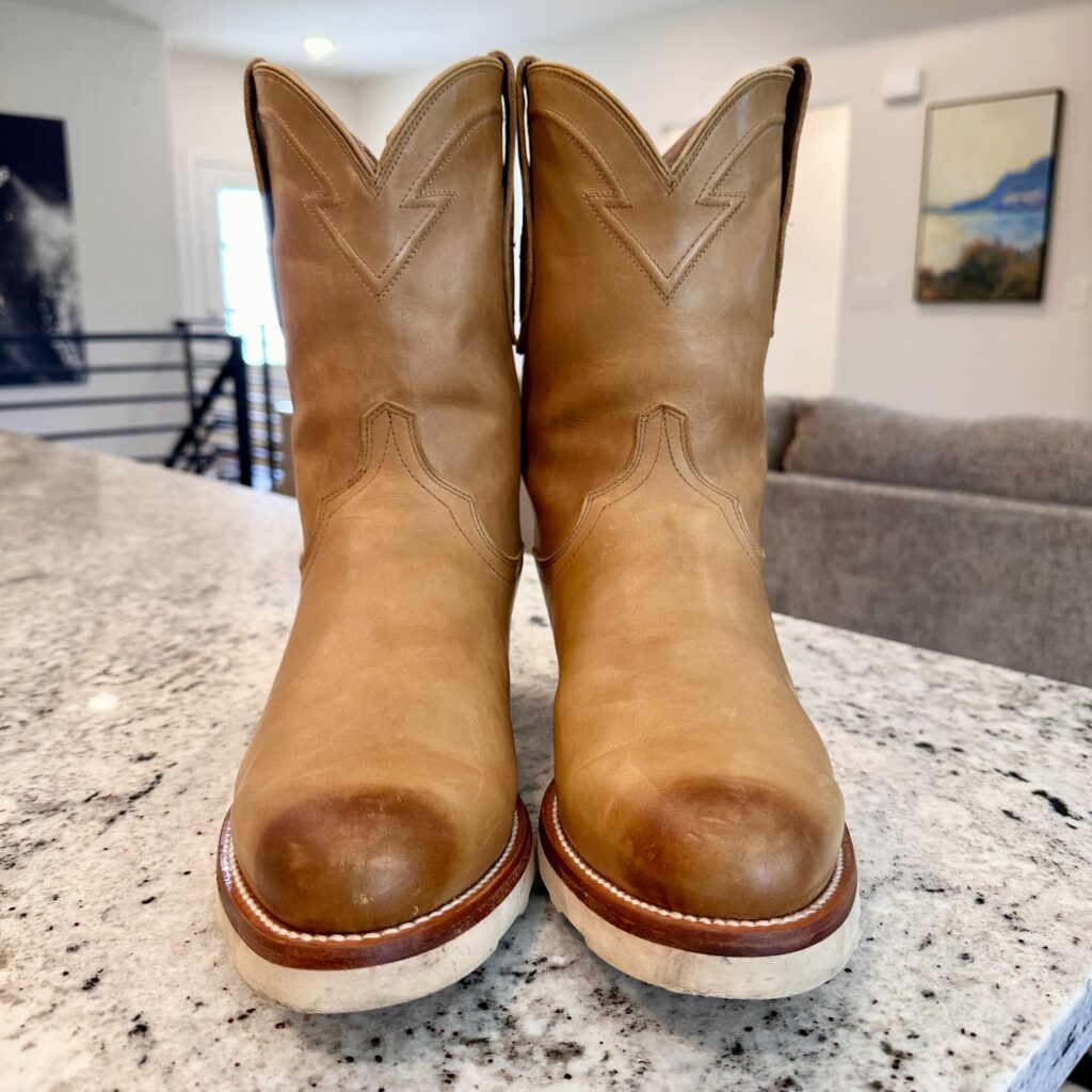 Type: These are men’s size 10 D Tecovas Knox boots in color “Wheat” (Tannish Brown). Style 1025. Bovine leather. These boots have Vibram wedge outsoles. Soft toe work boot. The leather is in good condition but does have gentle scuffing near the toes and heels from use.
